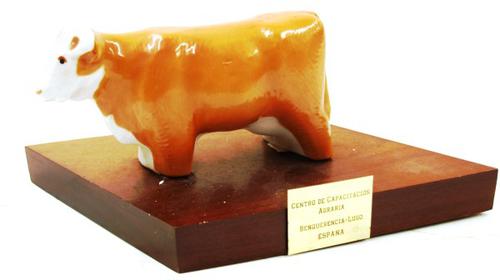 Koe van aardewerk op houten basis gebruikt als aande...