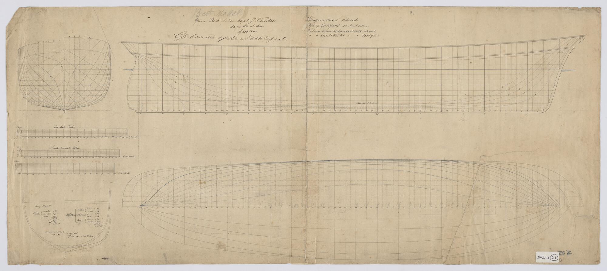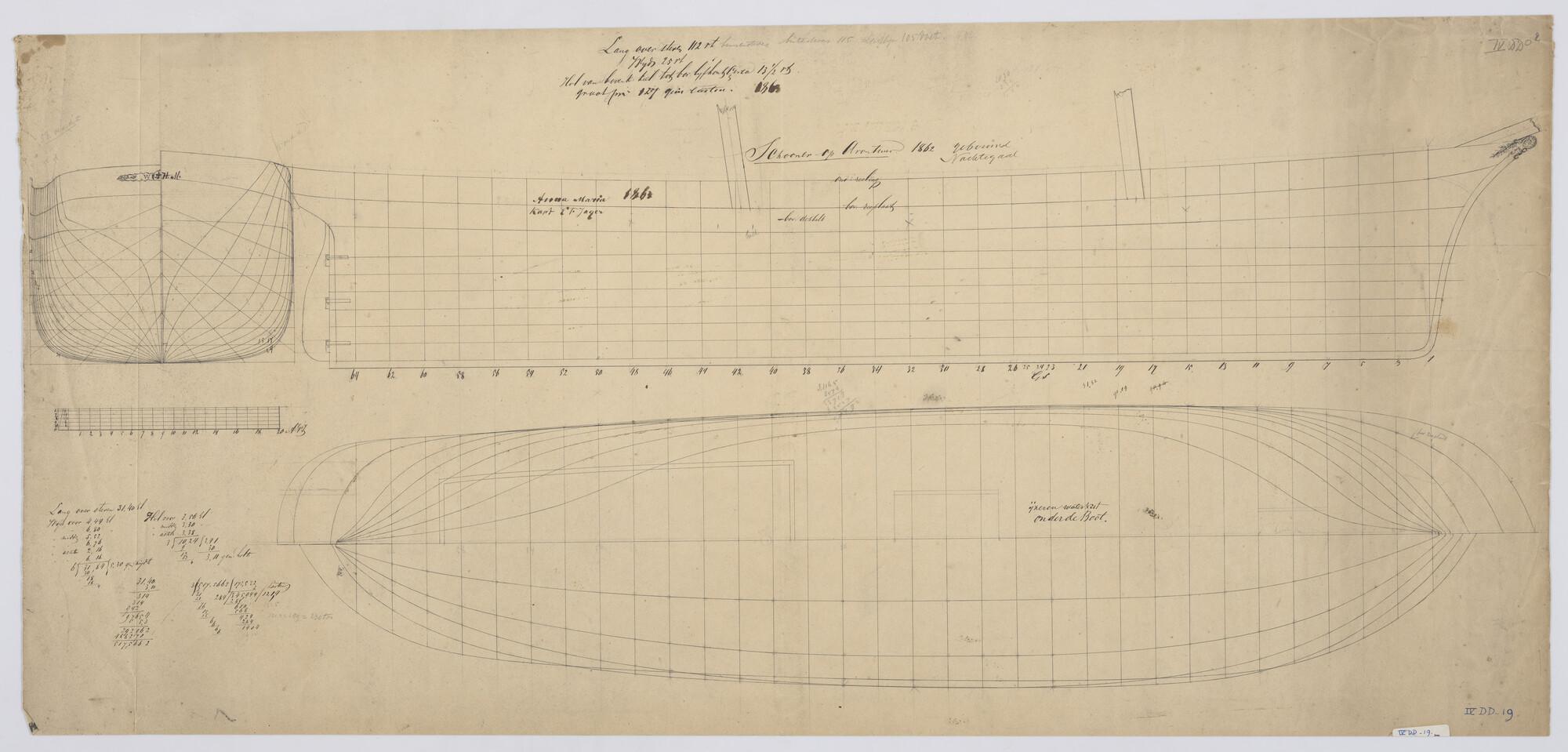 Zijaanzicht, bovenaanzicht, waterlijnen, spantenraam...