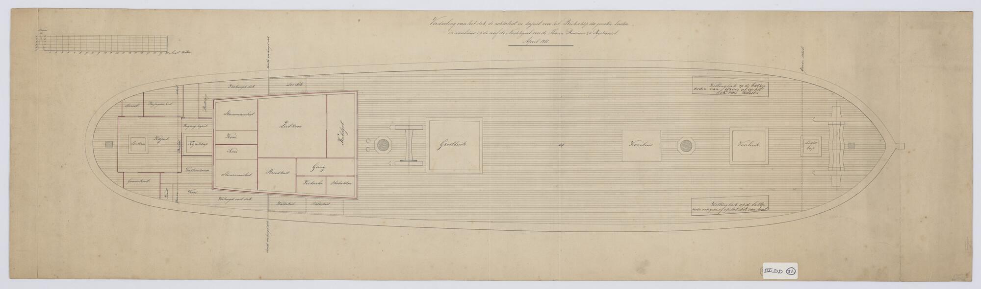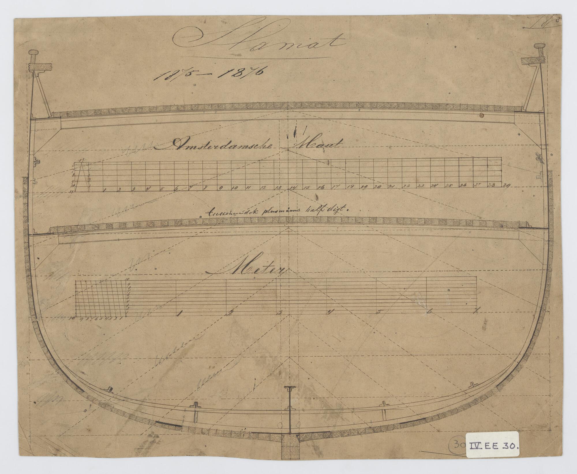 Zijaanzicht, spantenraam, senten, waterlijnen van de...