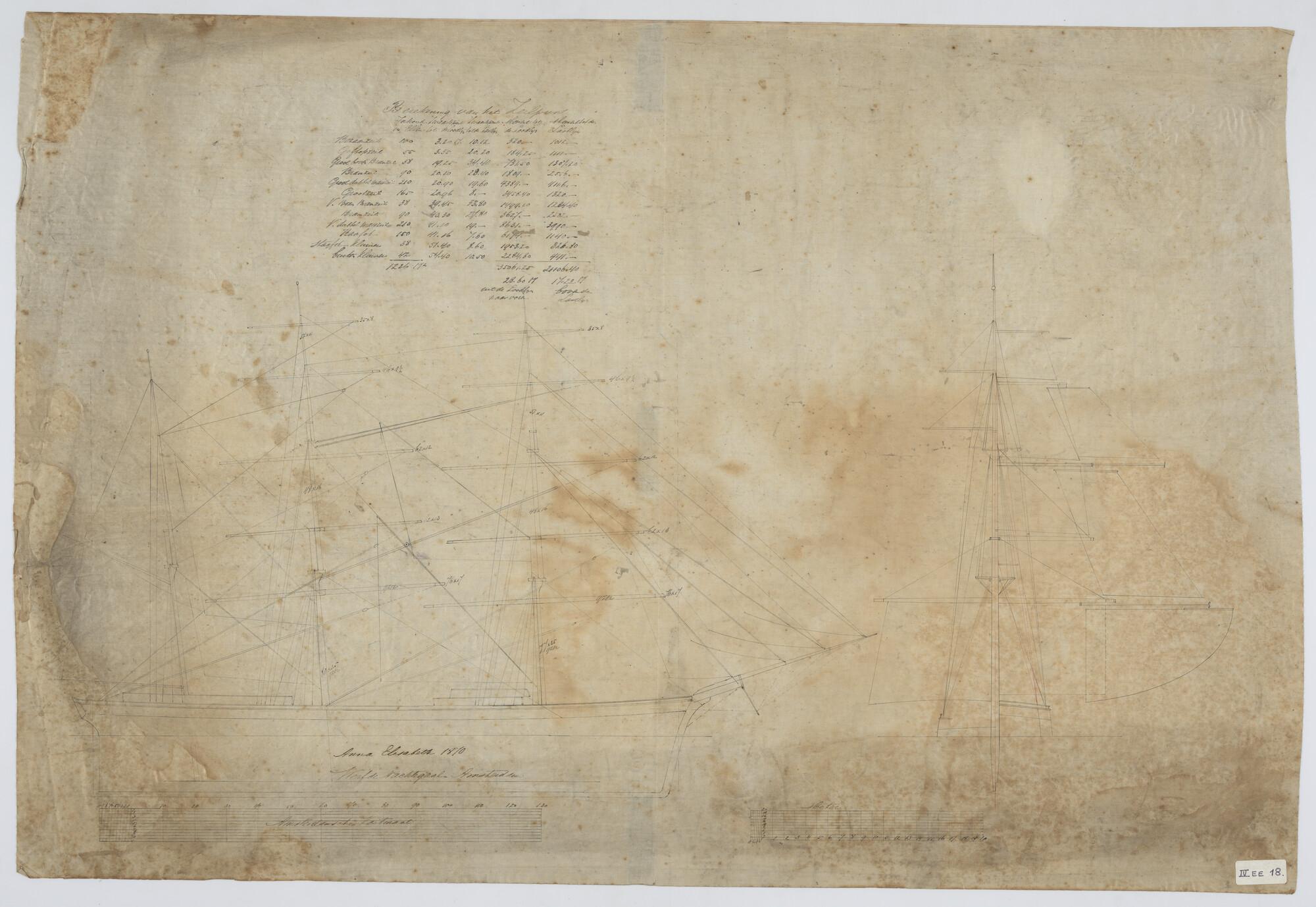 Zijaanzicht, lijnenplan van de klipperbrik 'Santa Ro...