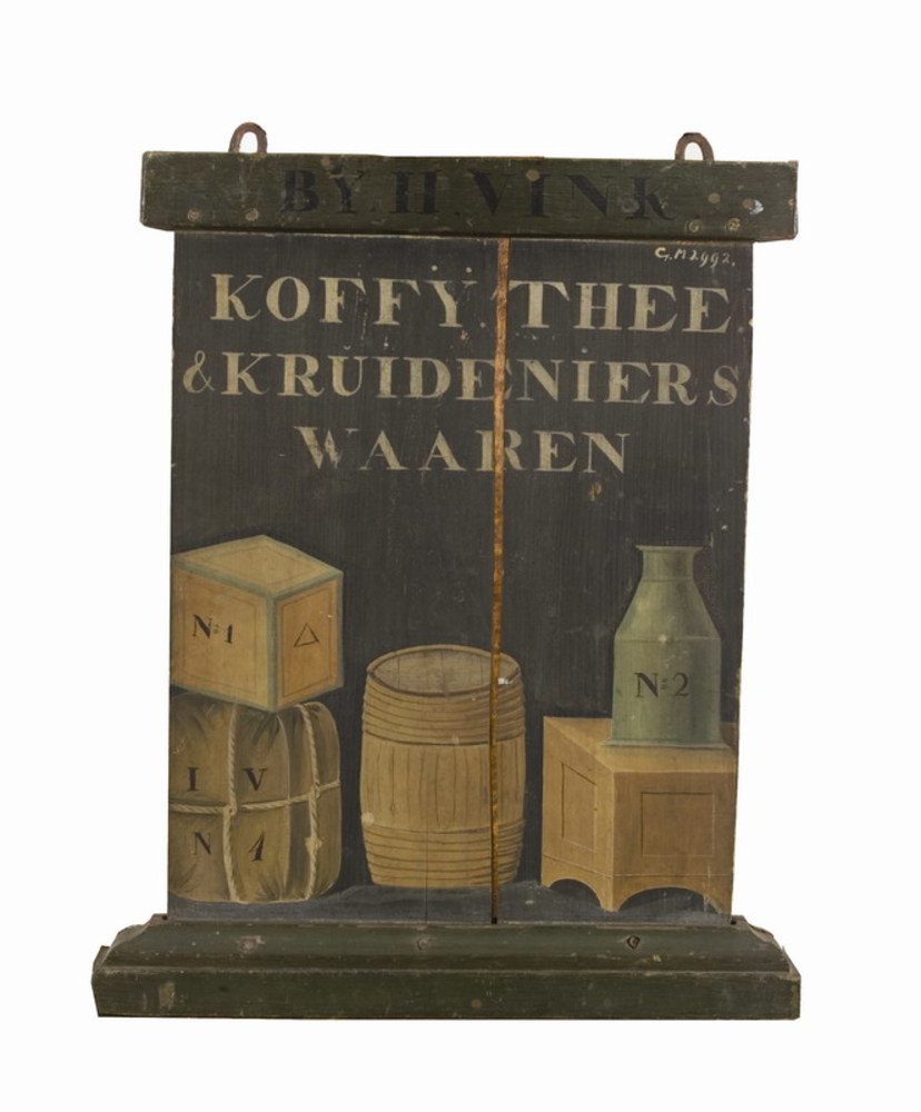Houten uithangbord met als opschrift: KOFFY.THEE. & ...