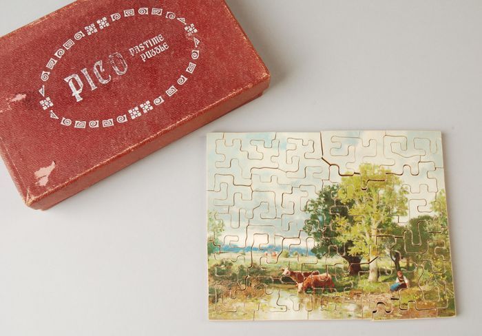 Rode doos met puzzel van vijftig stukjes, waarop lan...