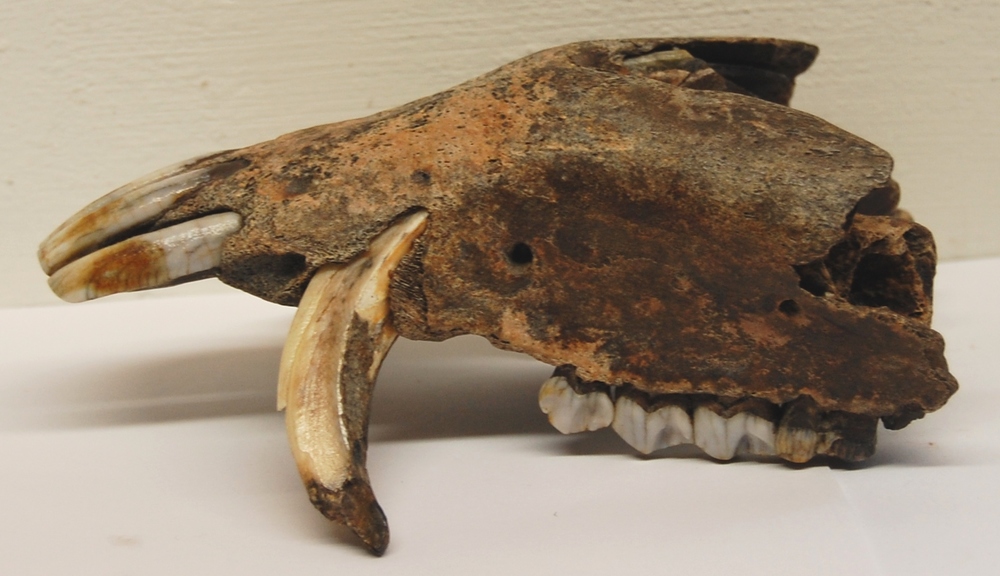 onderkaak van tam varken met twee slagtanden van ivo...