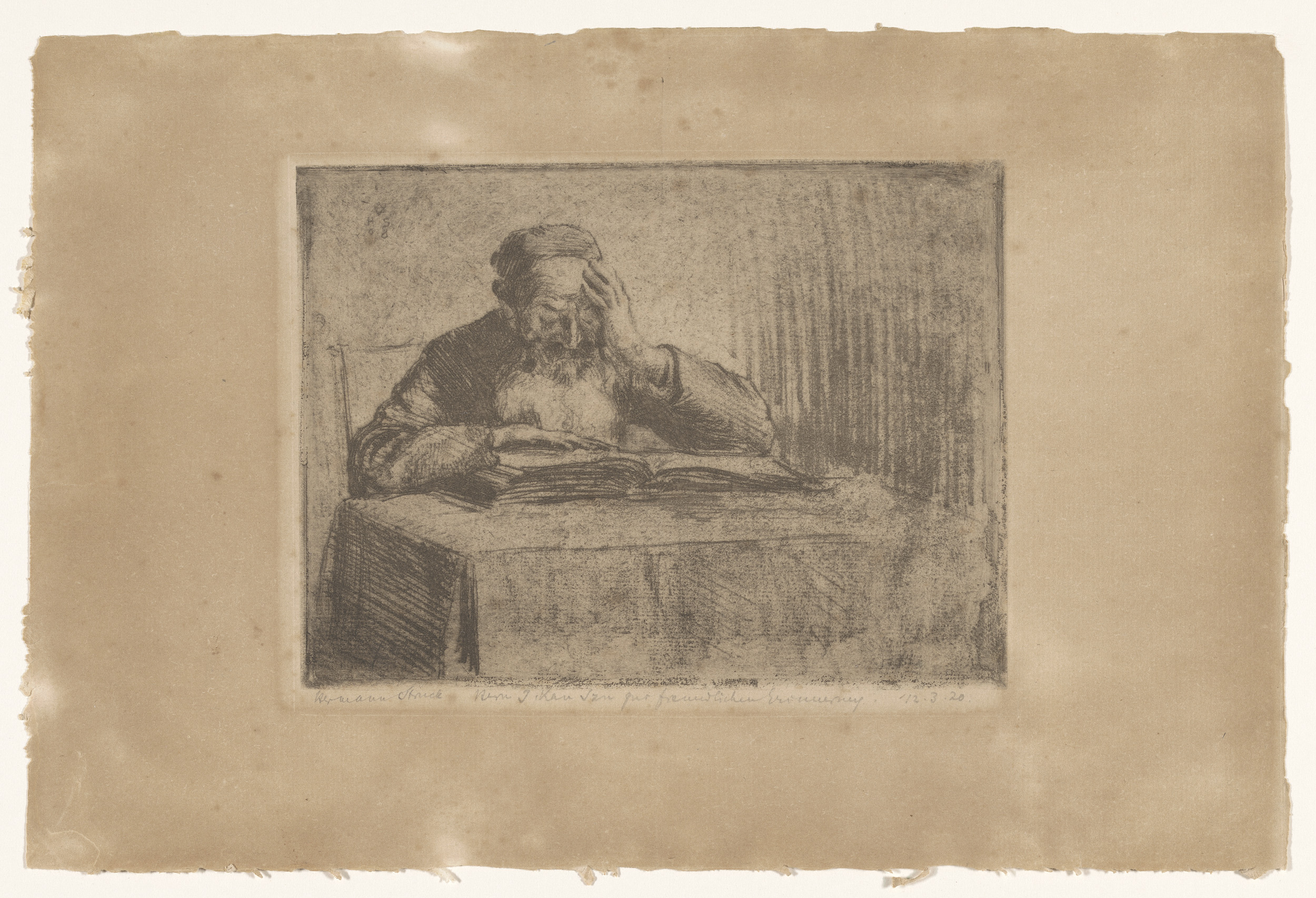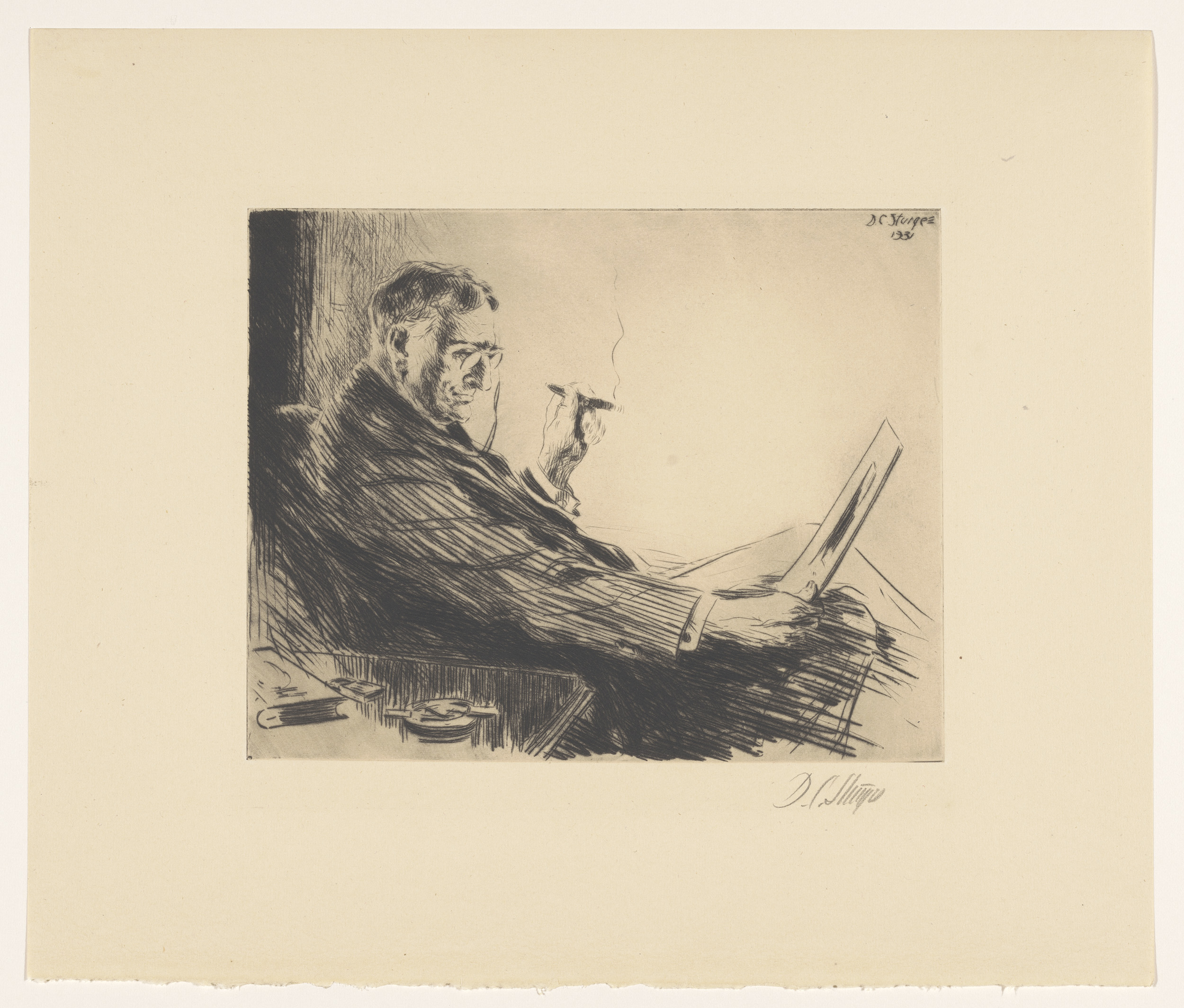 Man bekijkt een prent met een sigaar in zijn hand