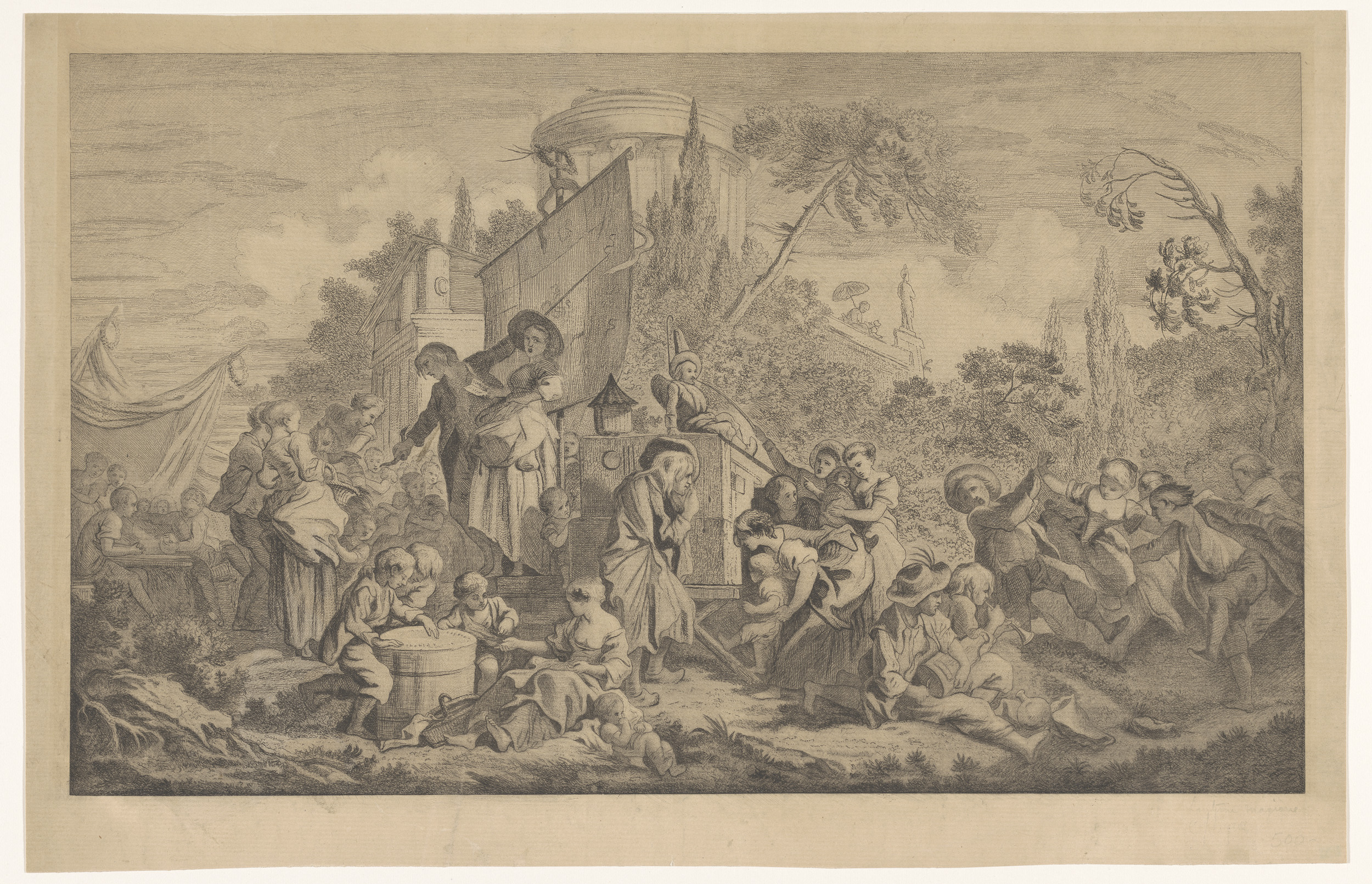 Marktscène met een liedzanger en een kijkkast