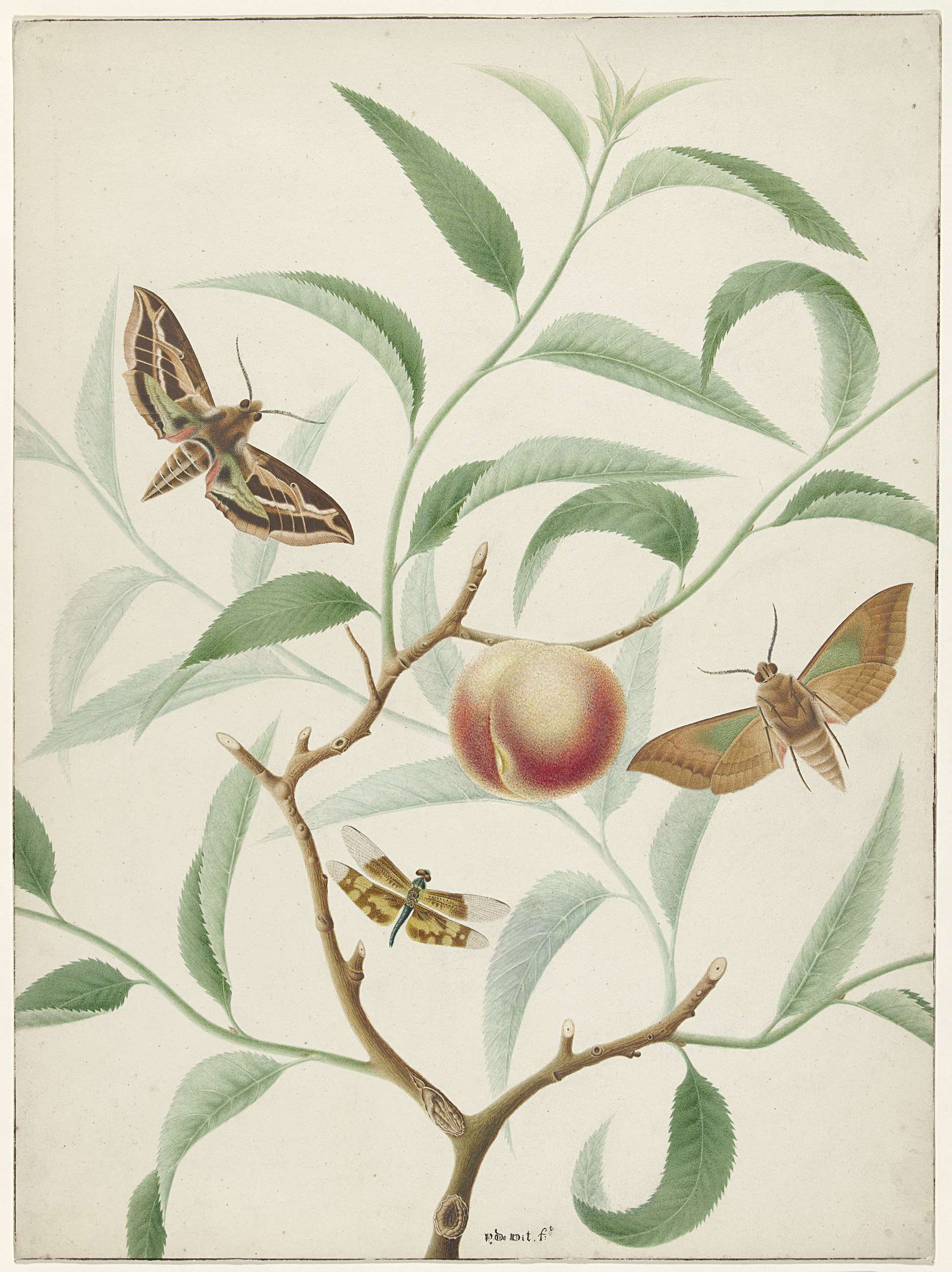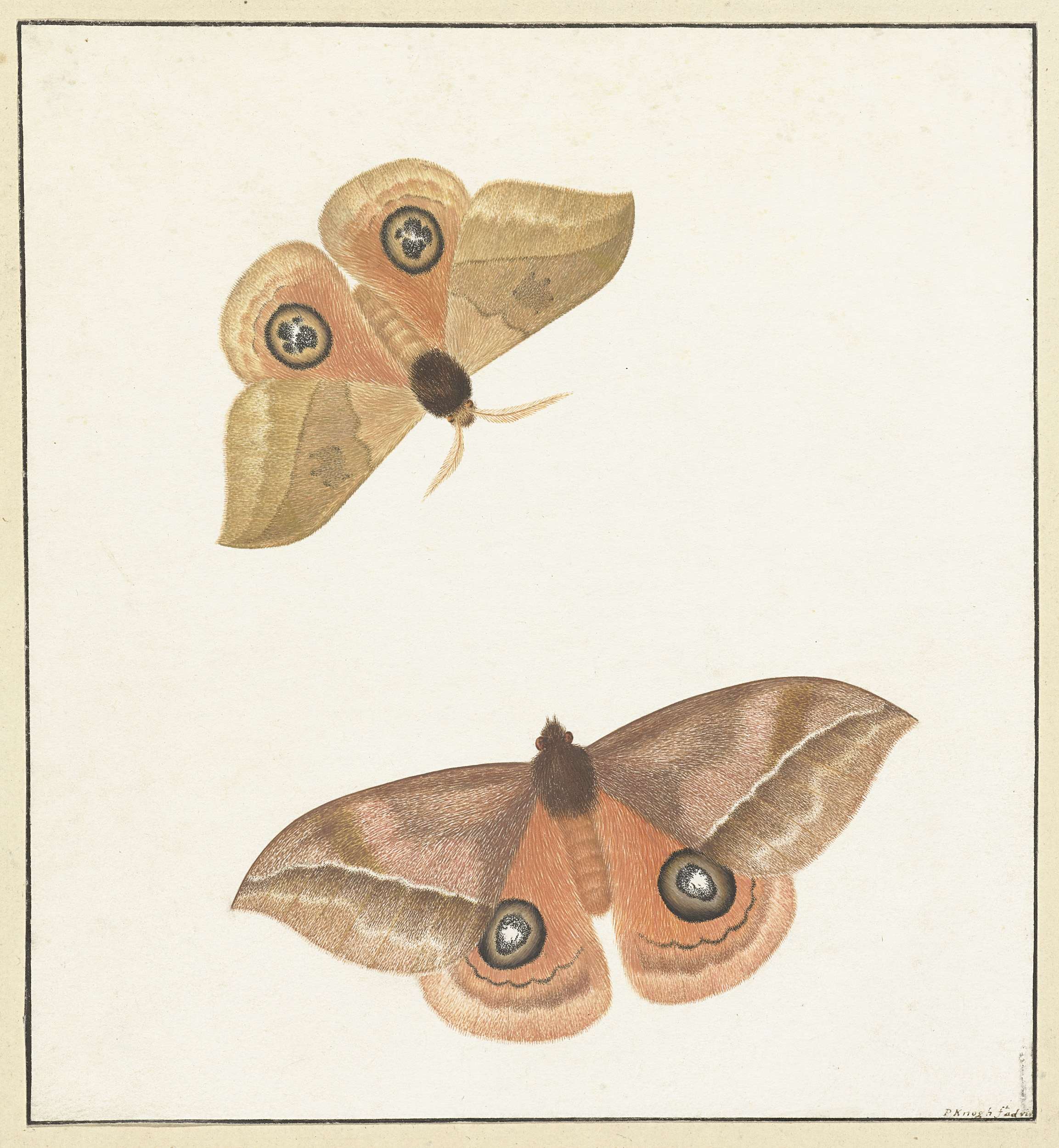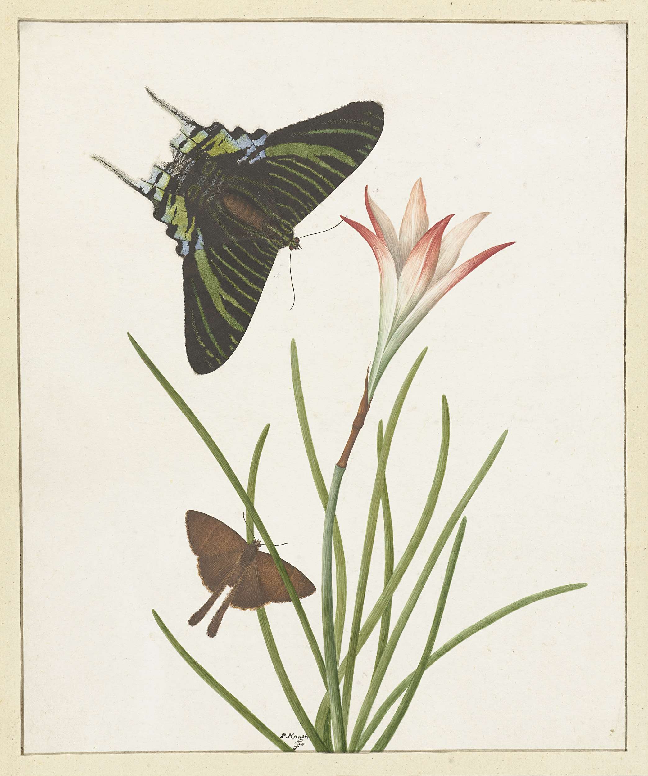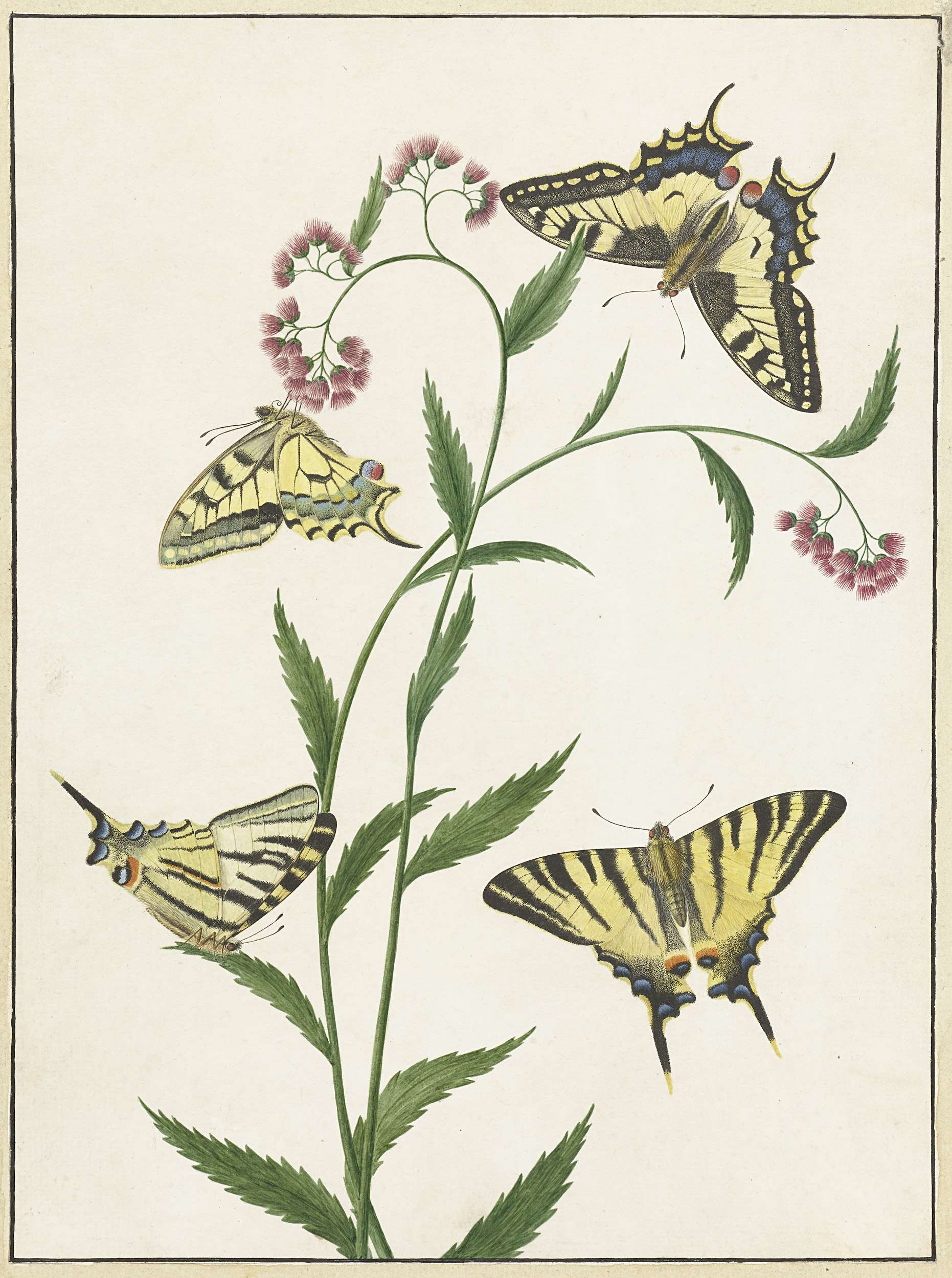 Twee vlinders en een vijfbladige geel-paarse bloem