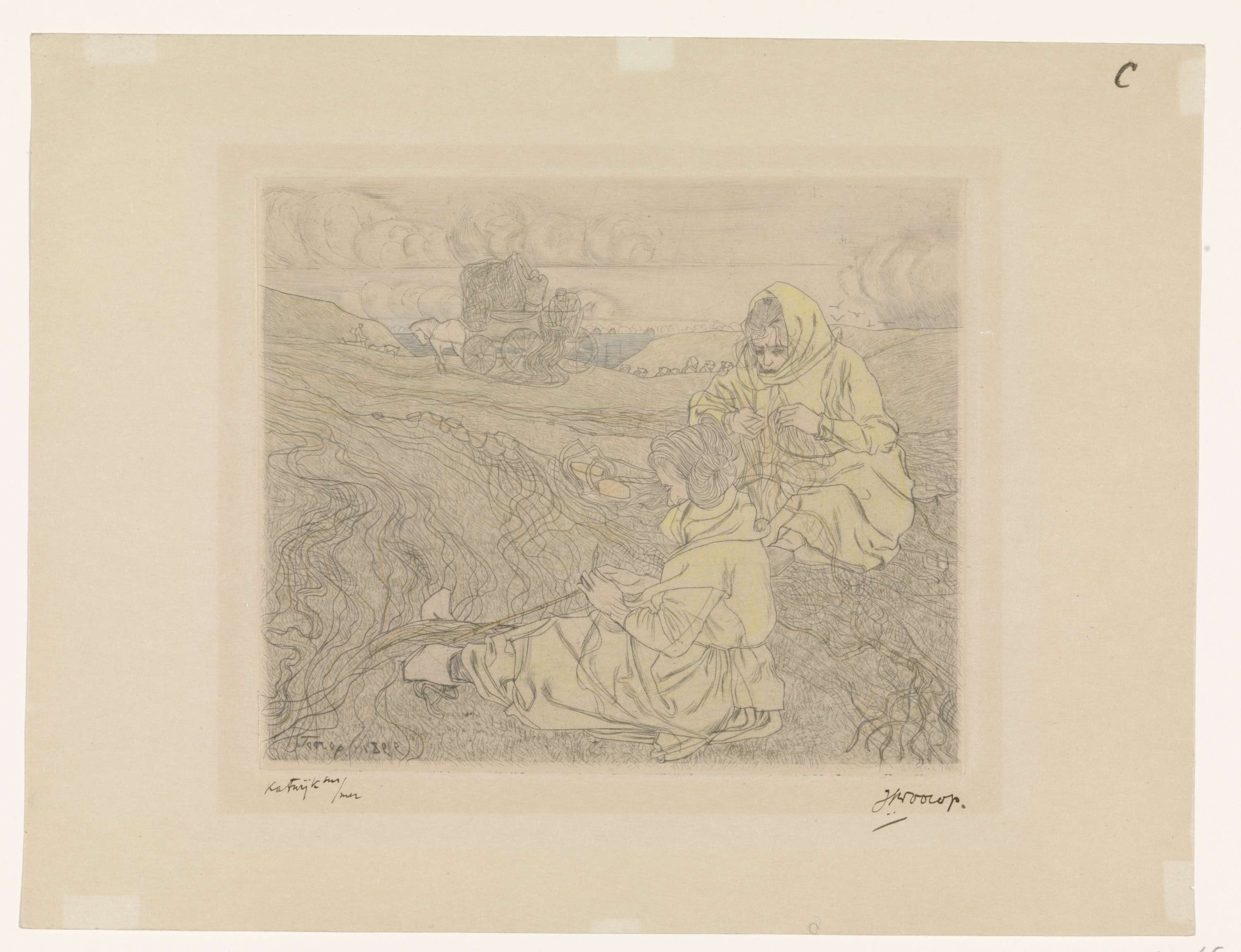 Twee Bretonse vrouwen en een man op een boot