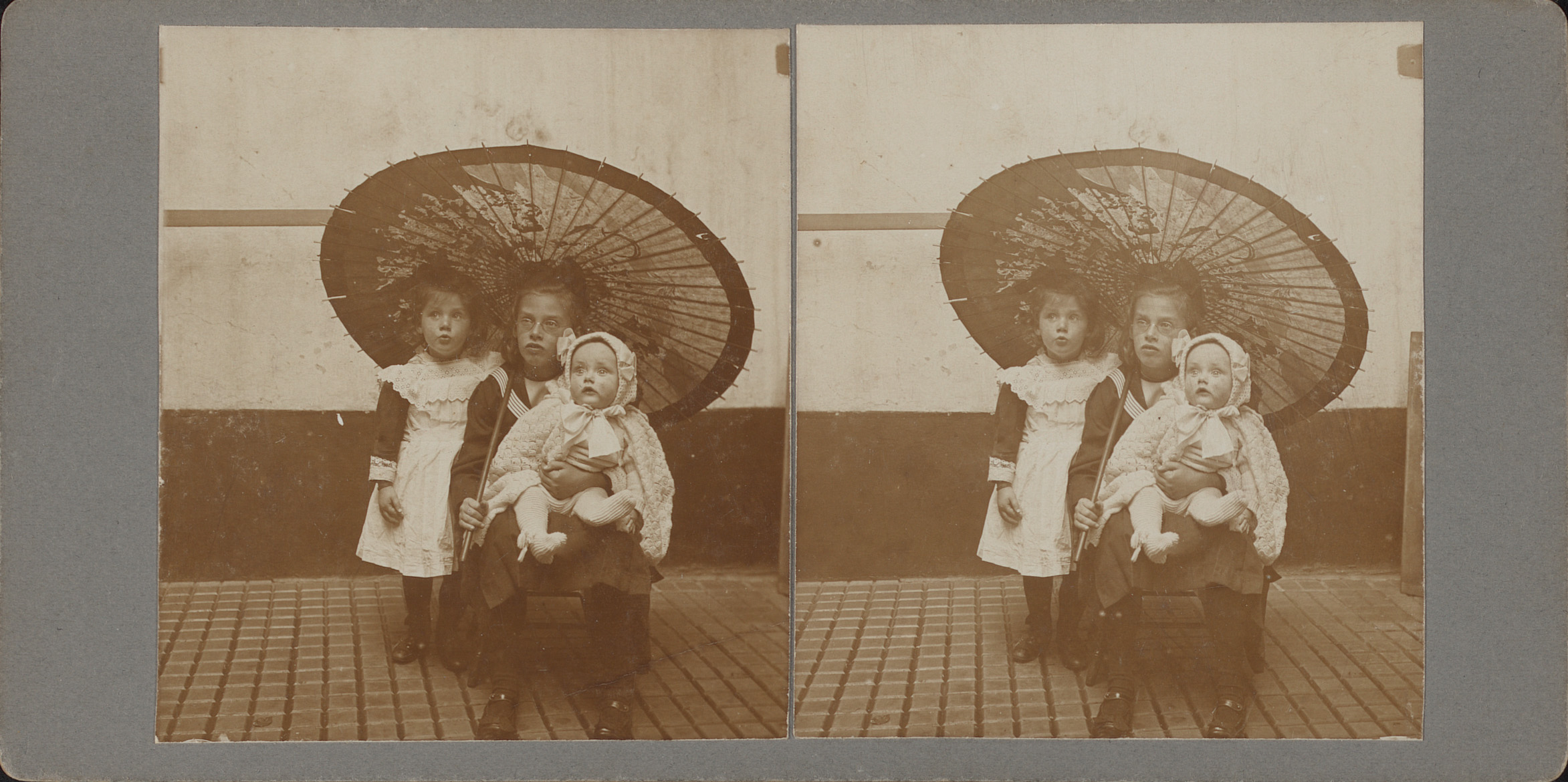 Portret van Jane, Rie en Jan Suyver onder een parasol