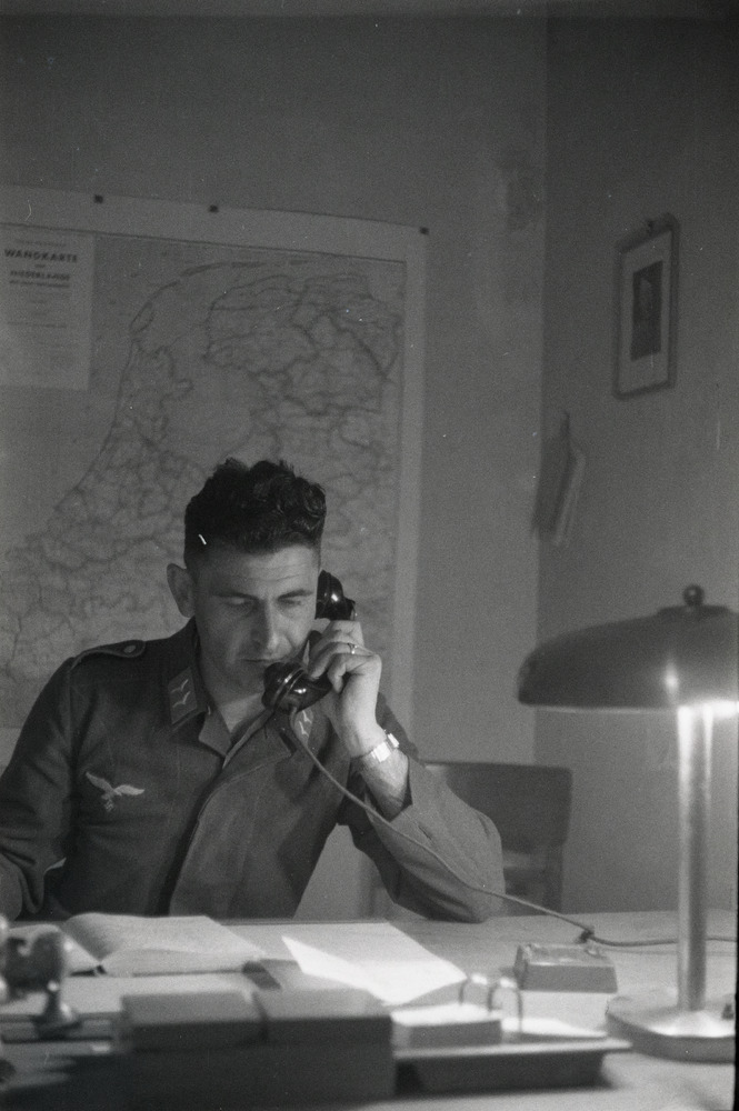 Een Luftwaffe Gefreiter aan de telefoon. Een kaart v...
