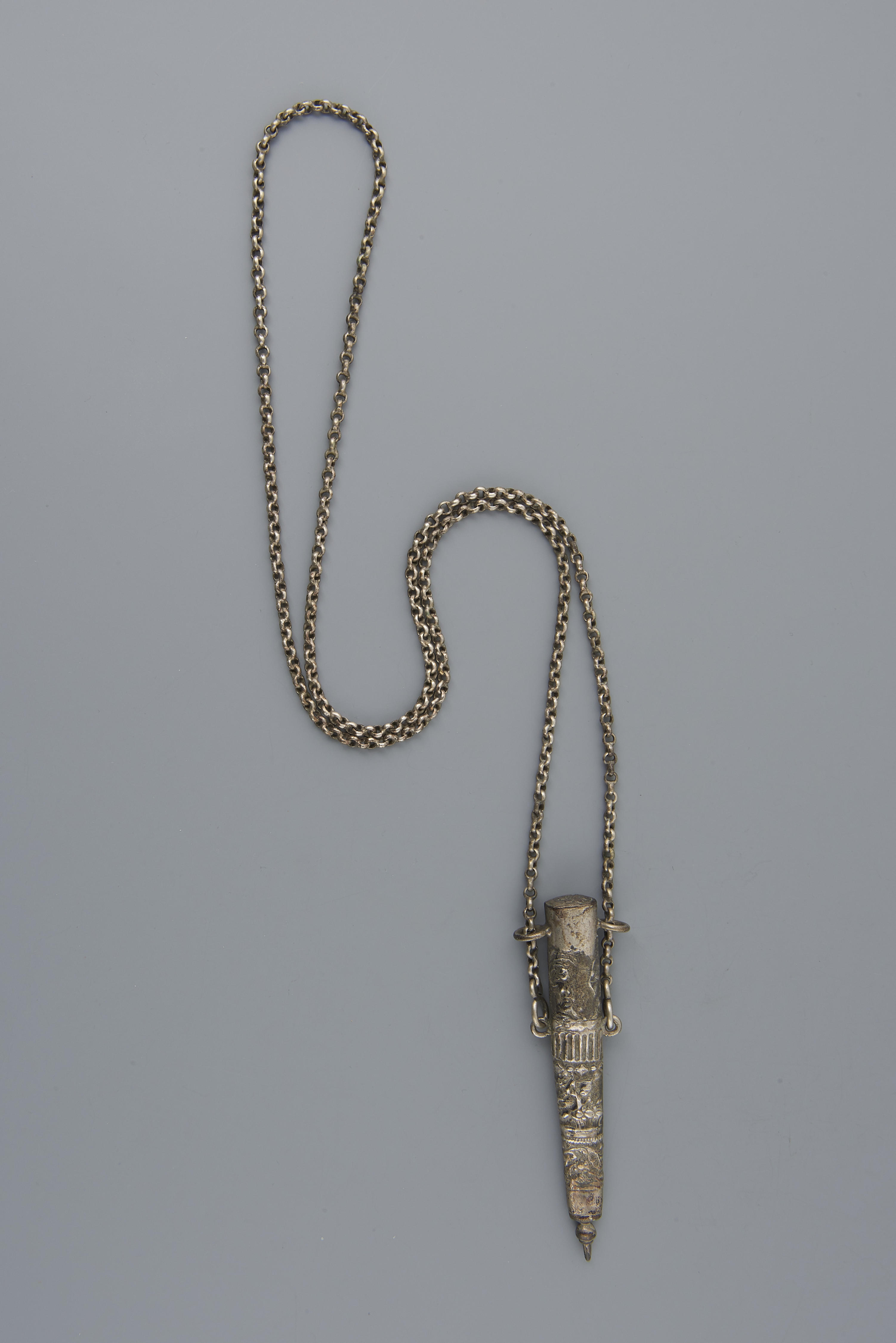 Zilveren naaldenkoker met jasseronketting, 1800–1875