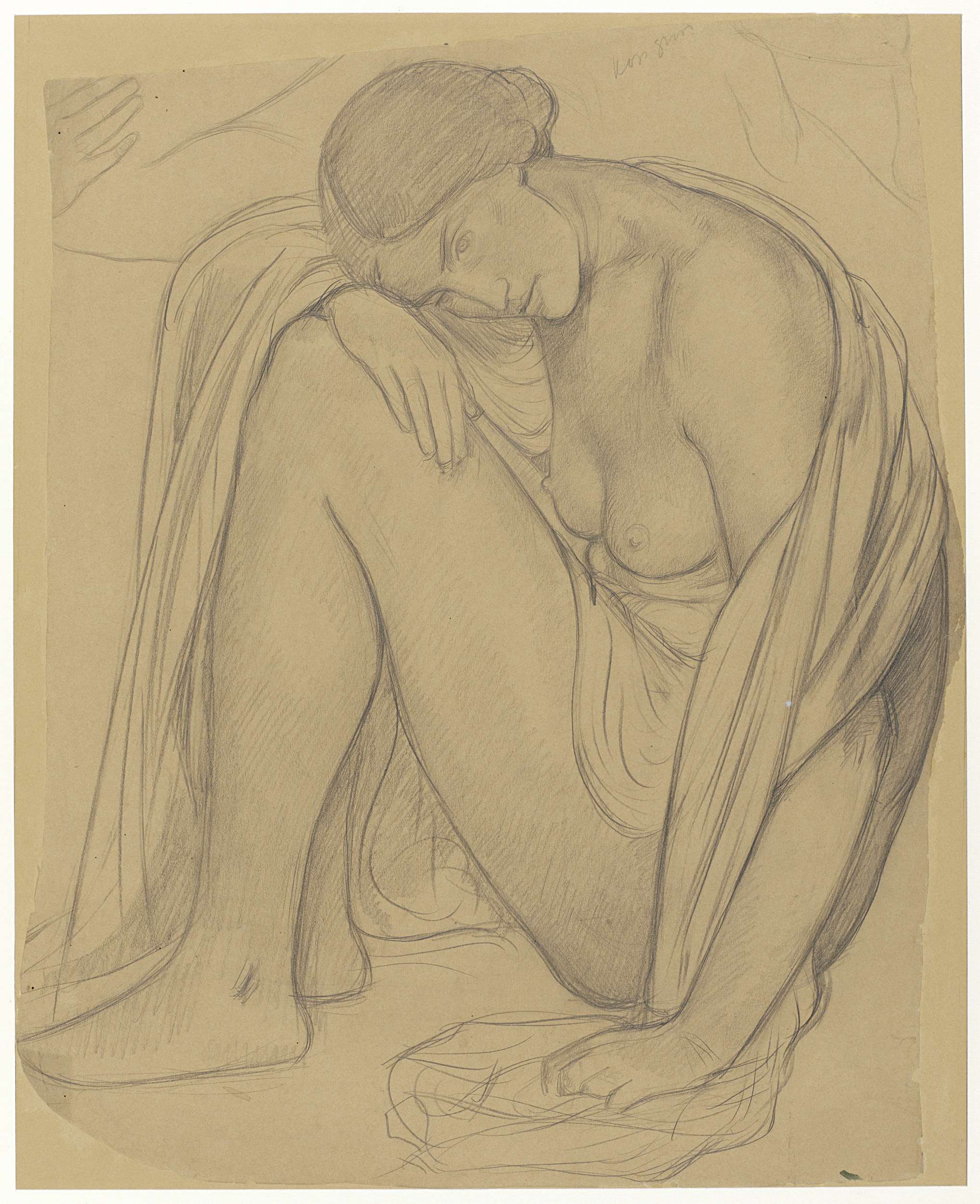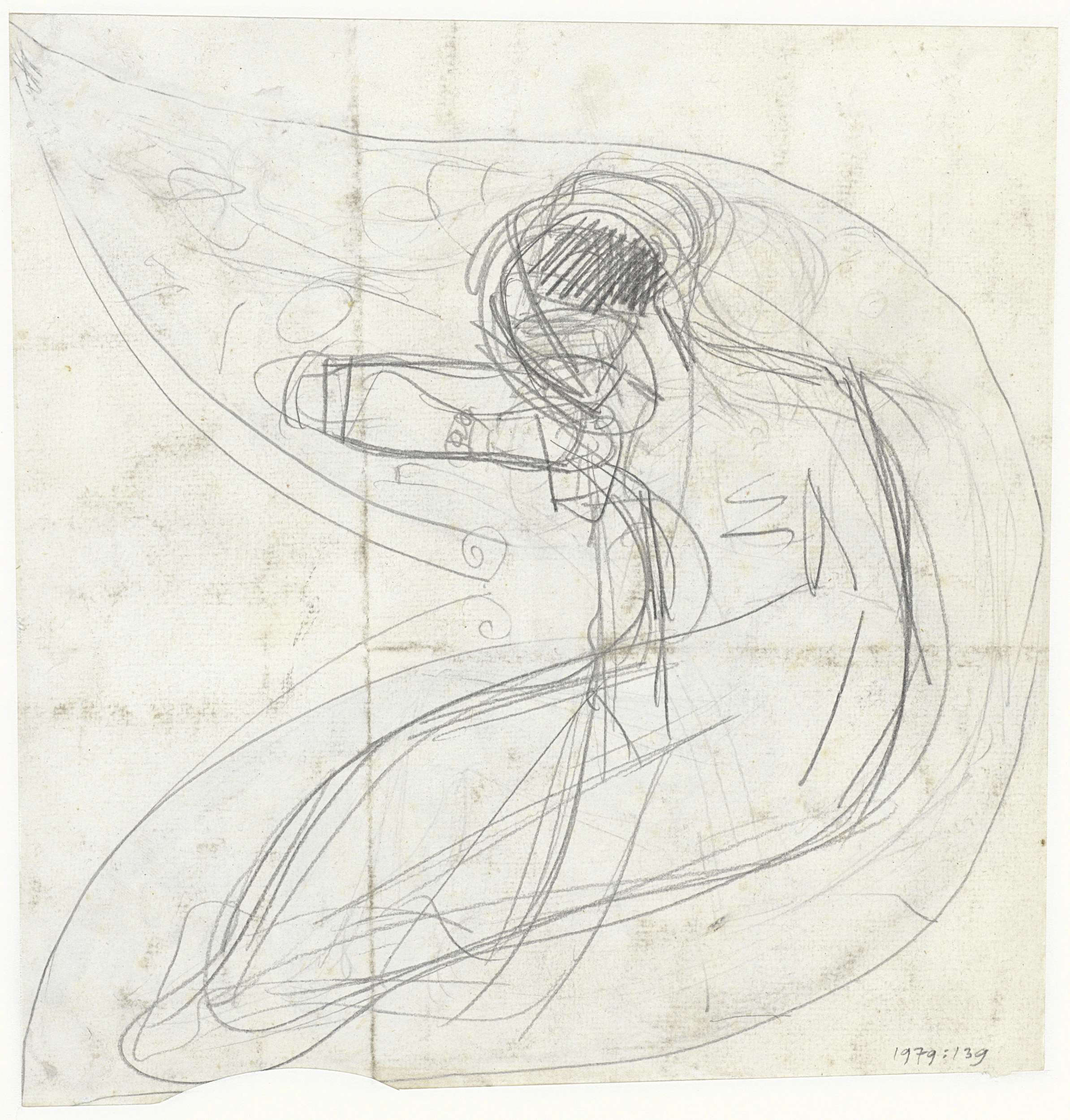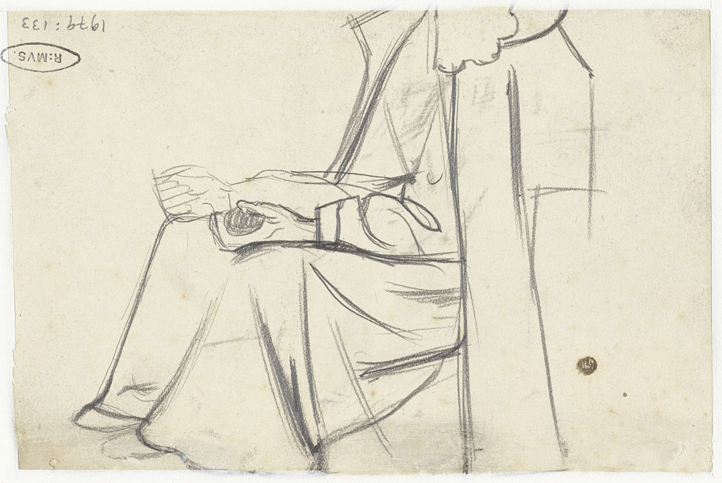 Schets van een zittende figuur in een halve cirkelvorm