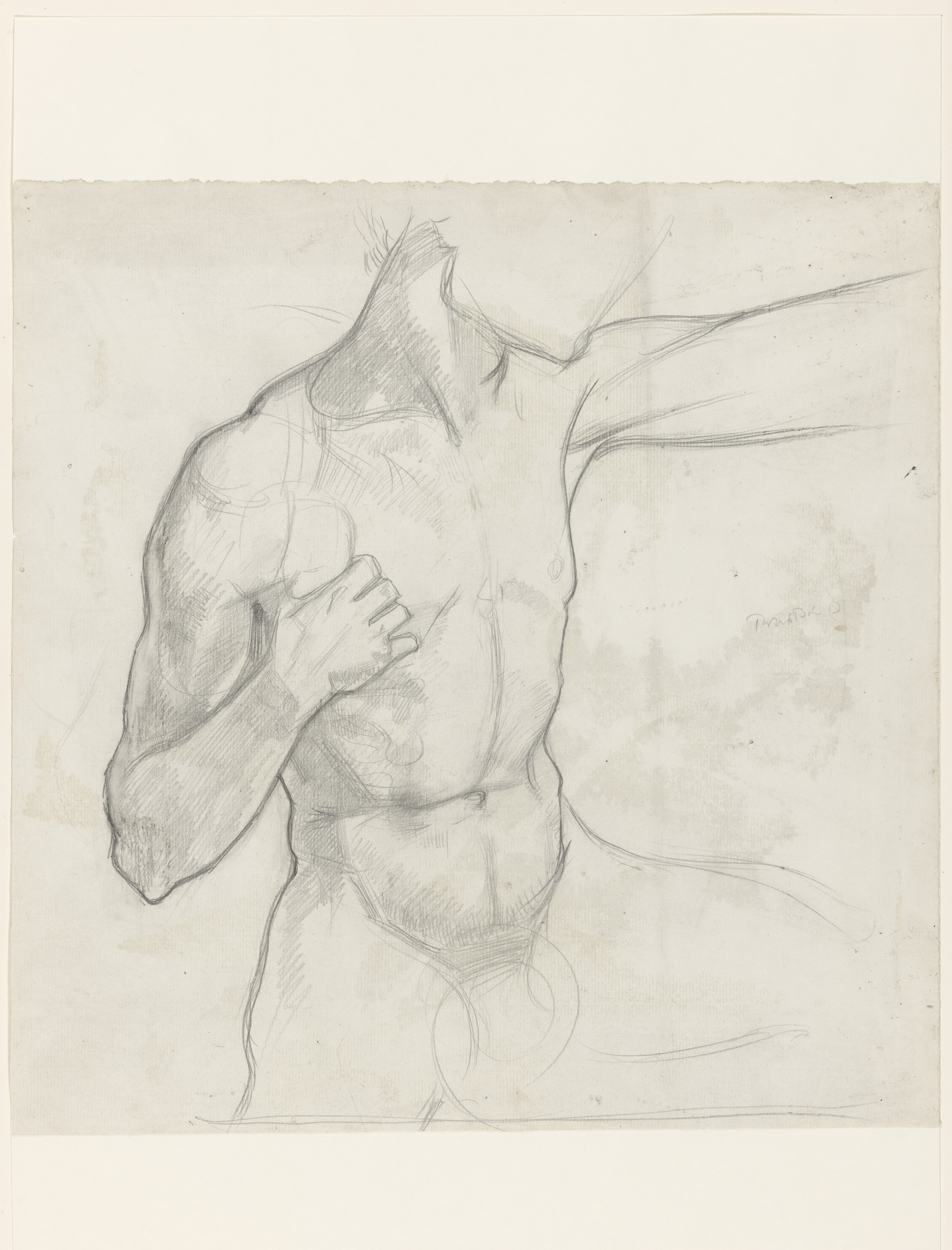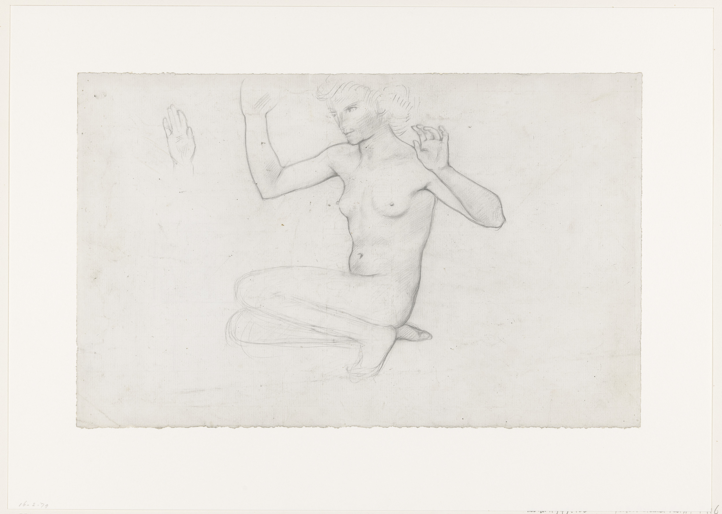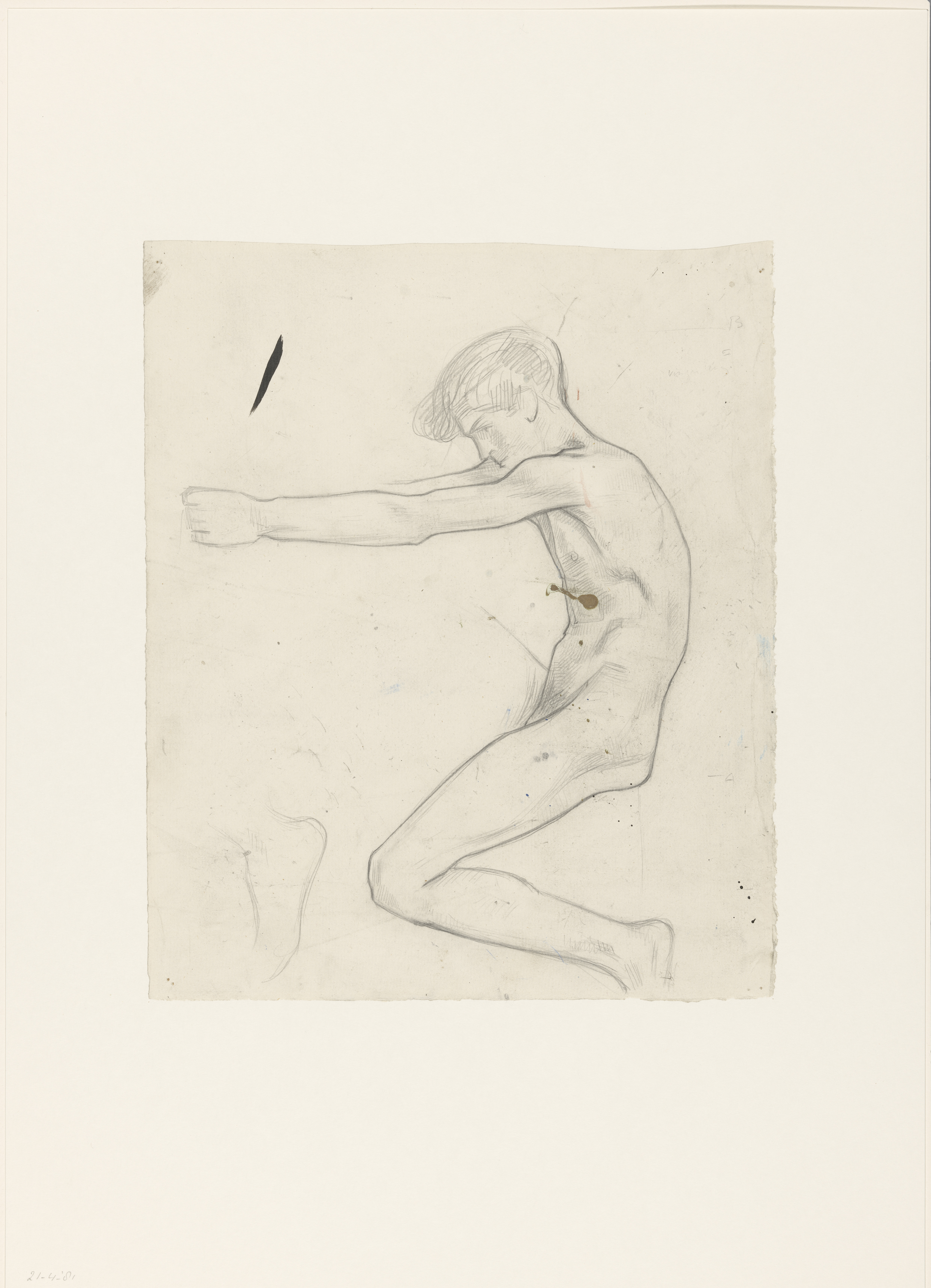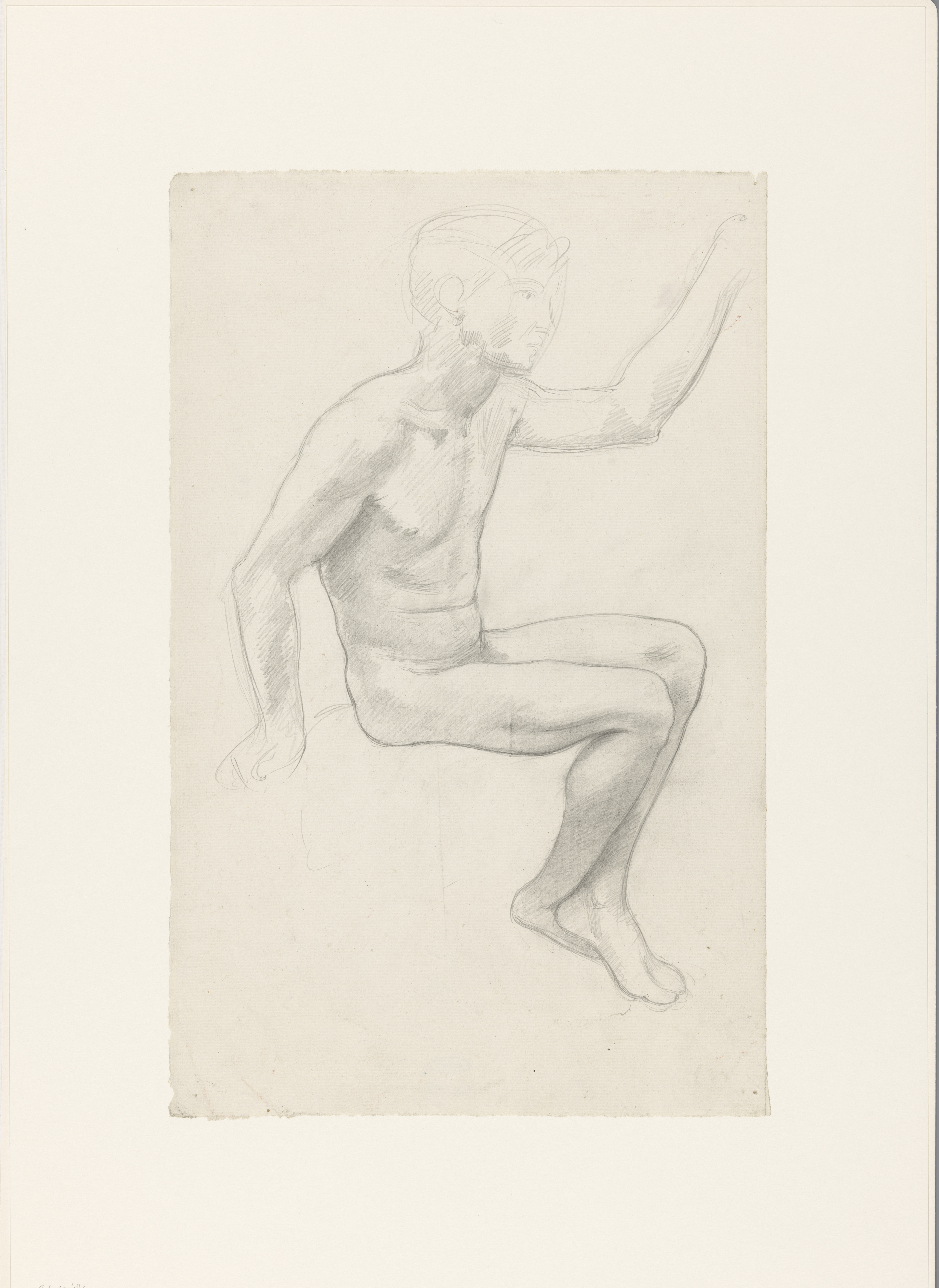 Zittende naakte jongen met opgeheven arm