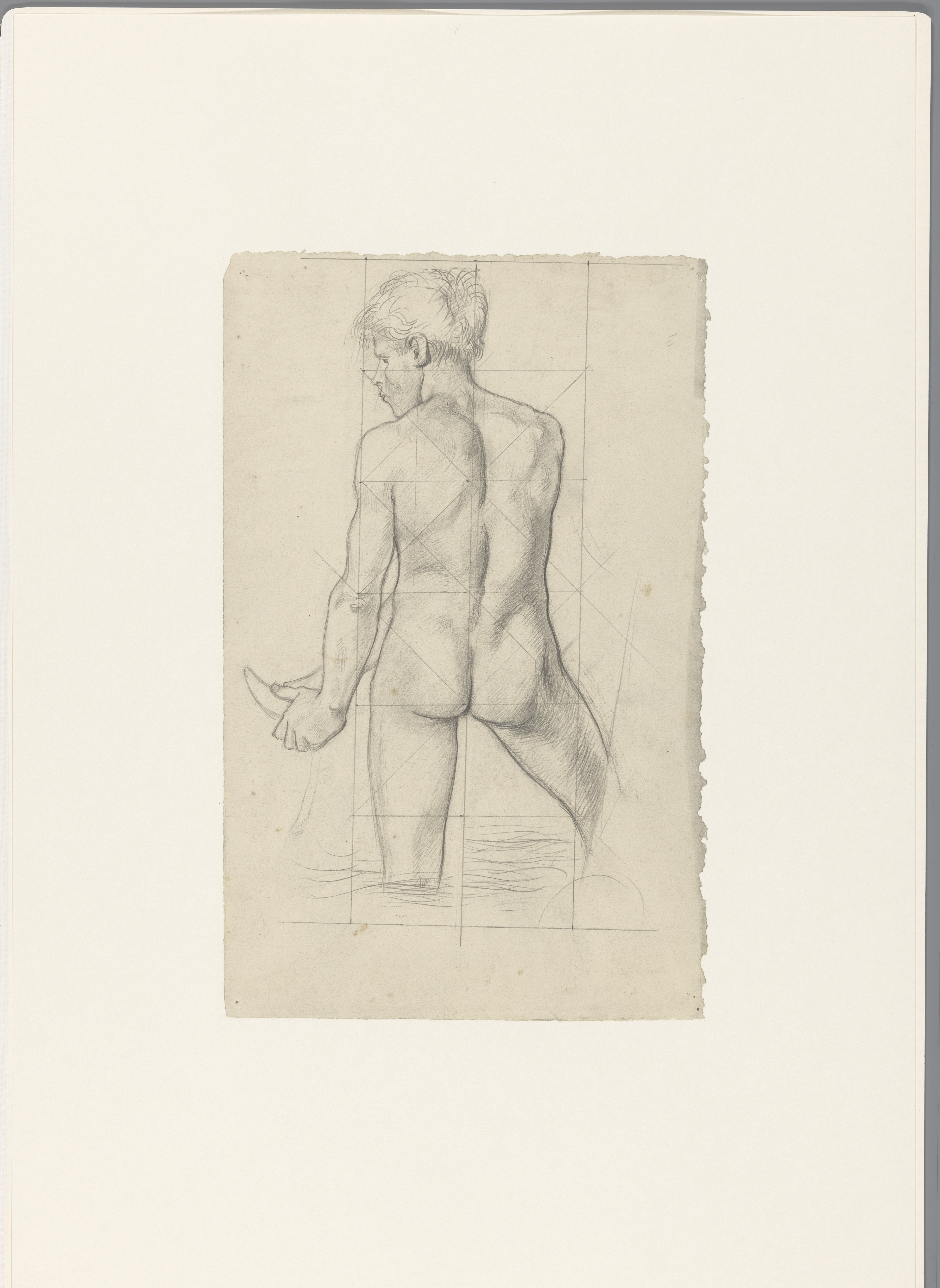 Staand mannelijk naakt in het water, op de rug gezien