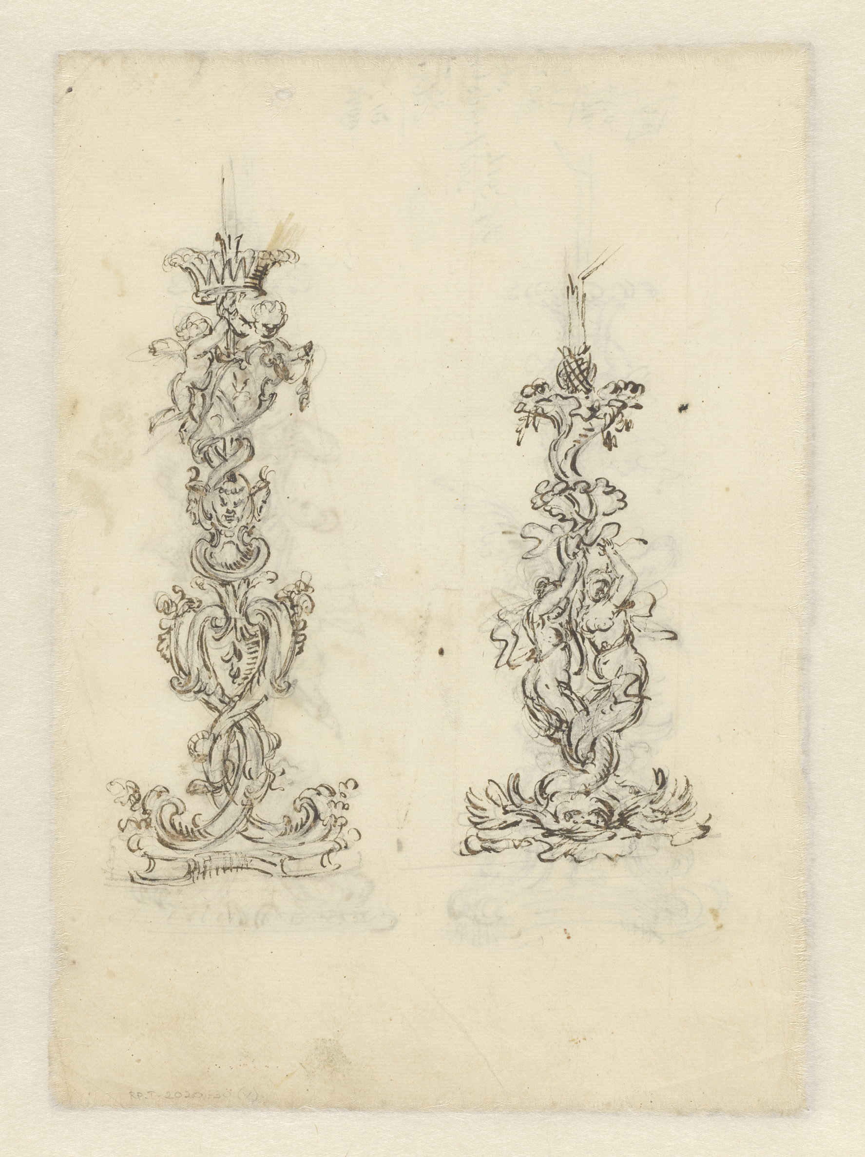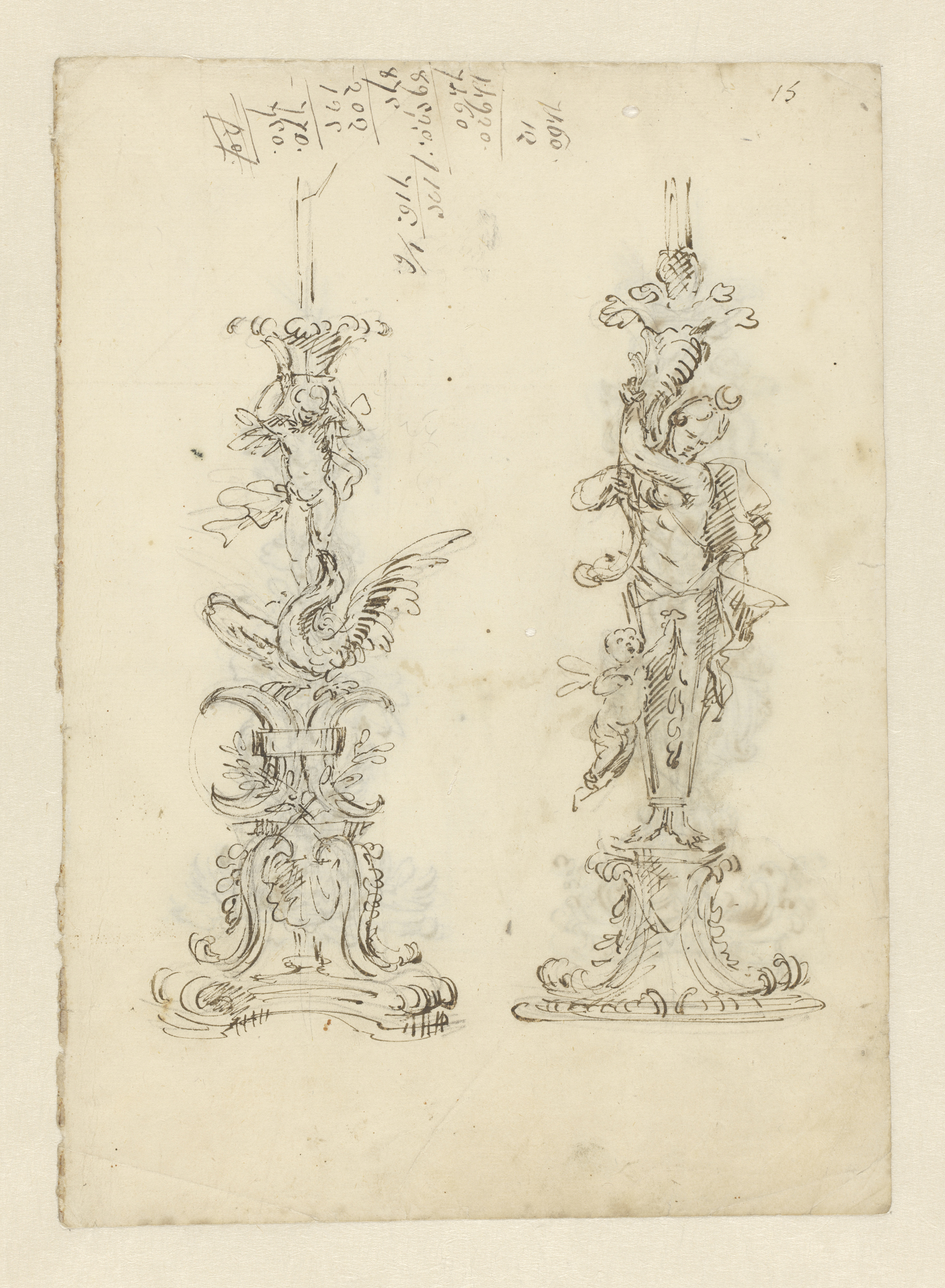Albumblad met twee grote gebeeldhouwde kandelaars