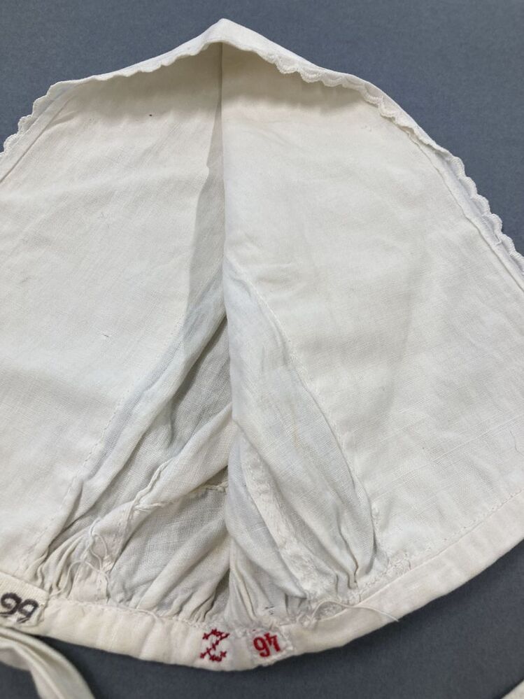 Slaapmuts van wit keperkatoen, afgezet met broderie,...