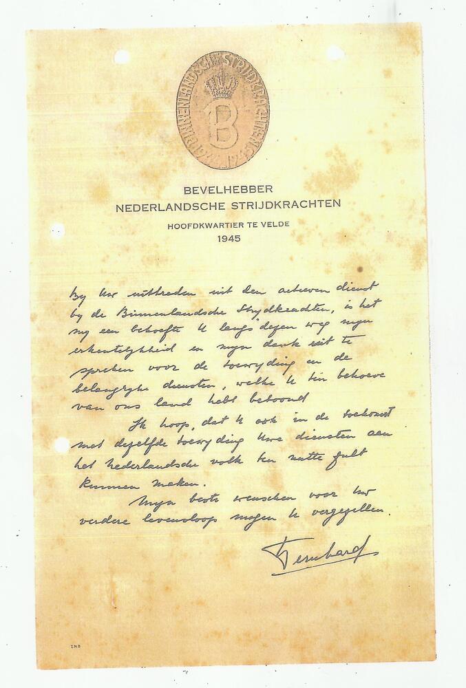 Brief van de Bevelhebber Nederlandsche Strijdkrachten