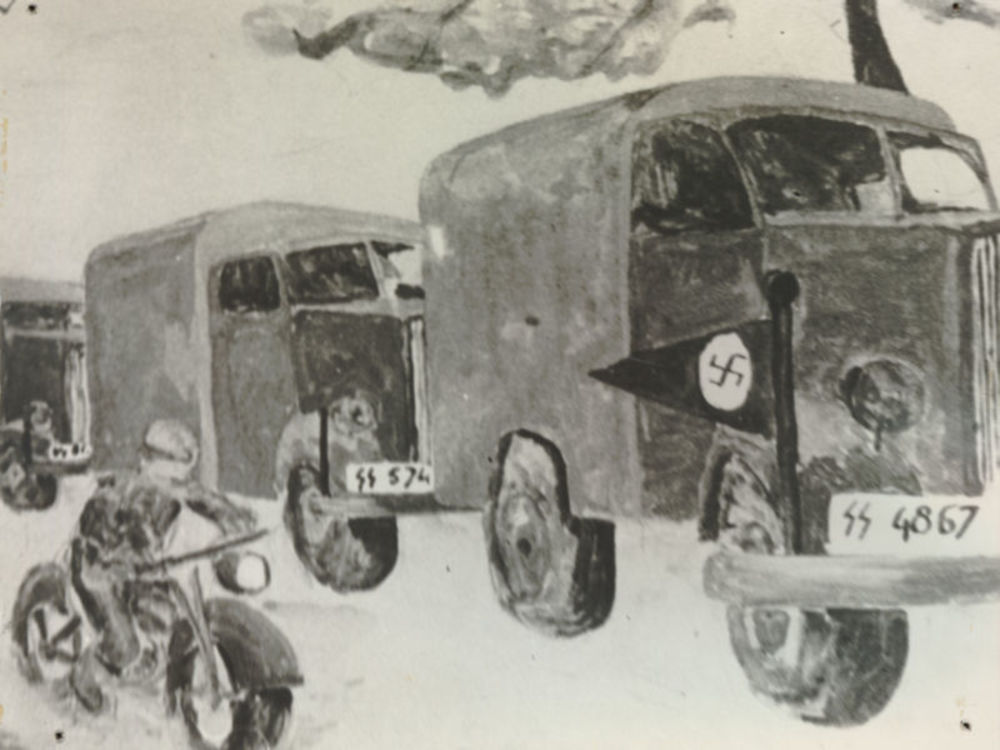 Tekening van Duitse vrachtwagens met SS nummerplaten...