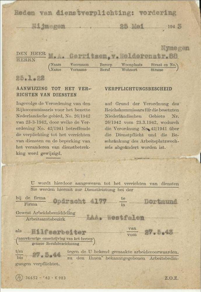 Reden van dienstverplichting: vordering 25 mei 1943 ...