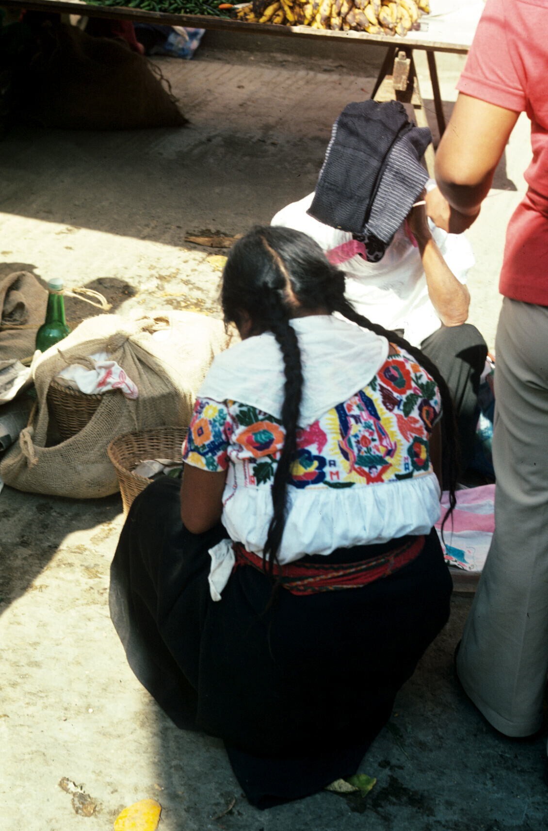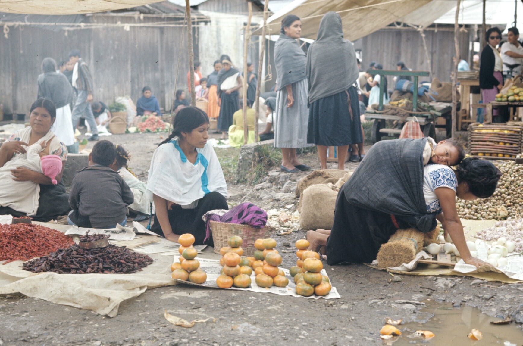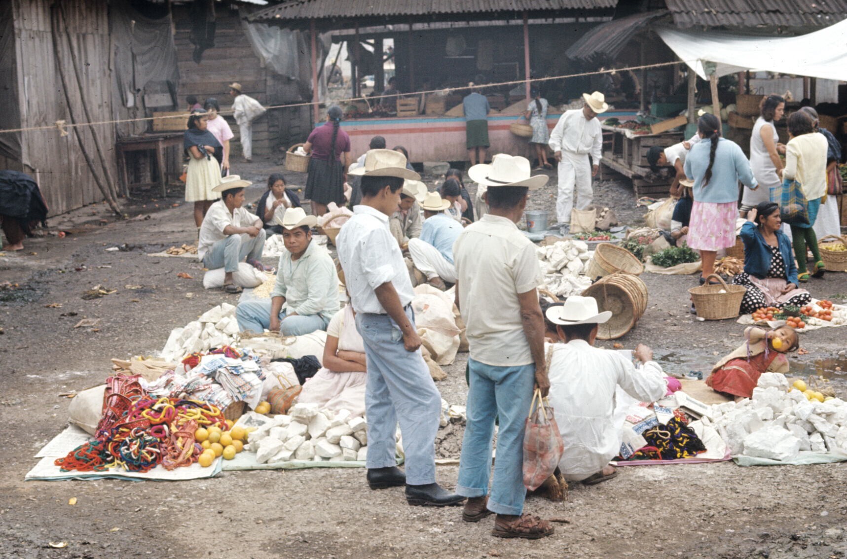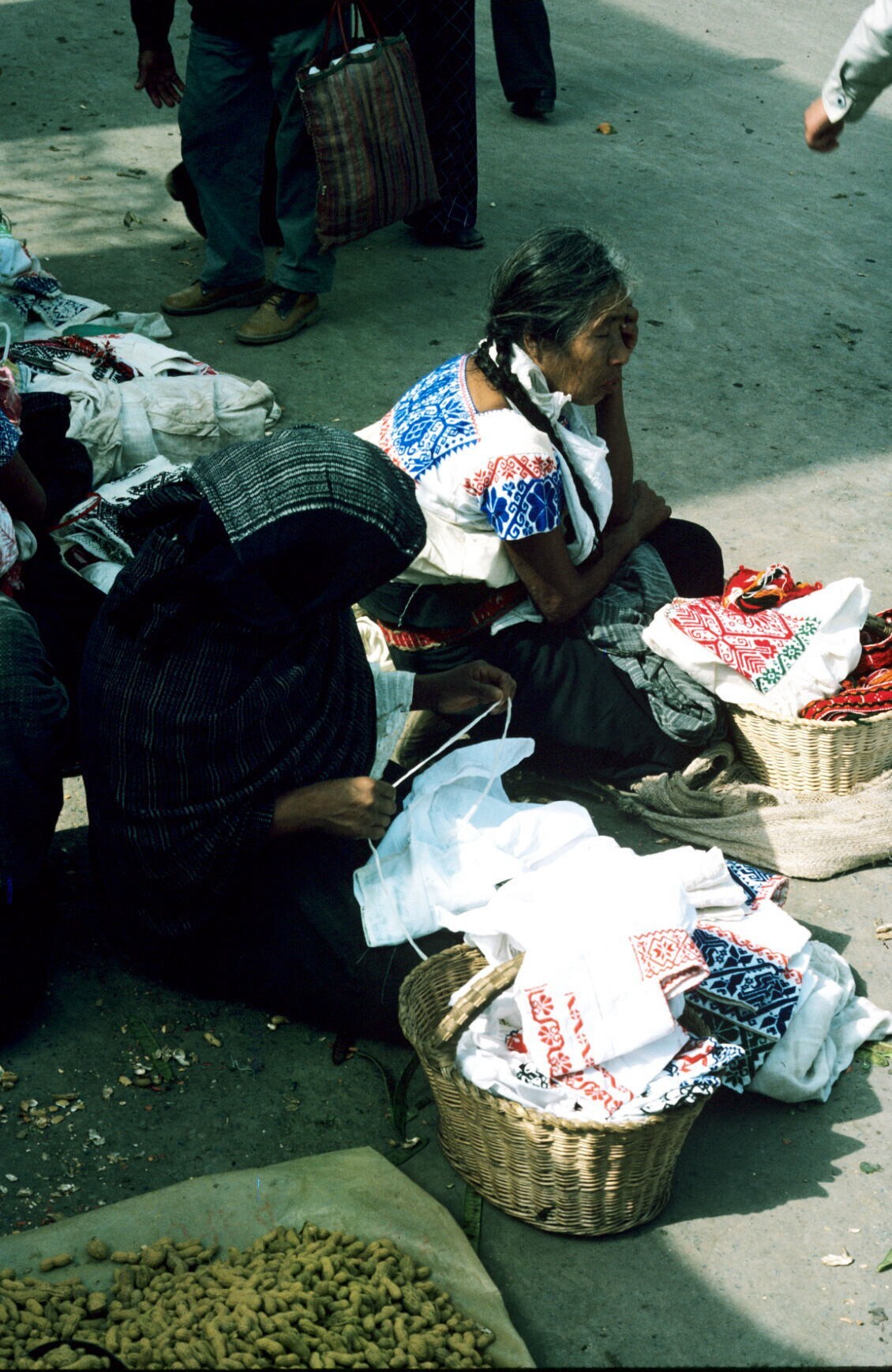 koopvrouwen op markt met 'blusas' en 'fajas' (ceintu...