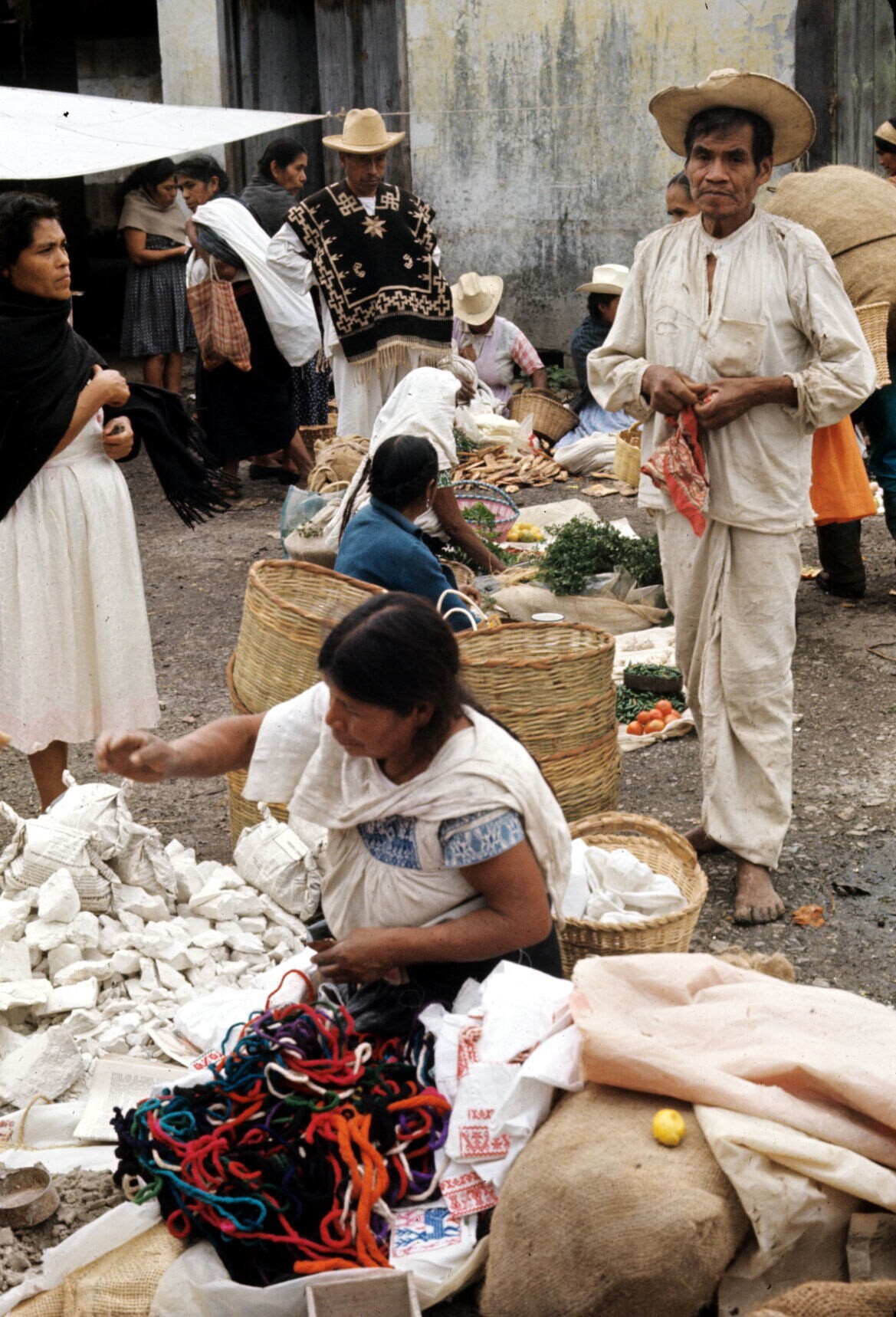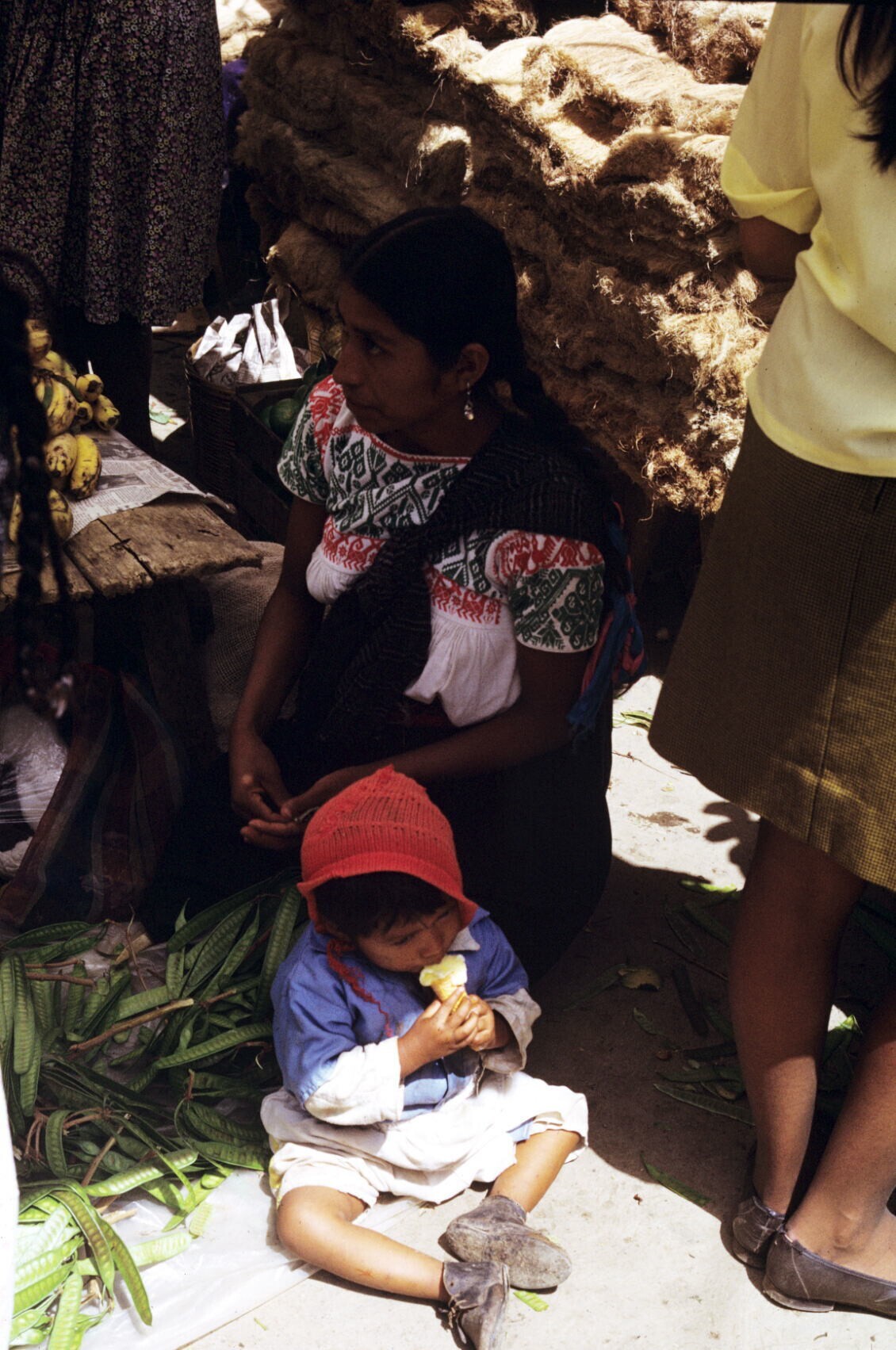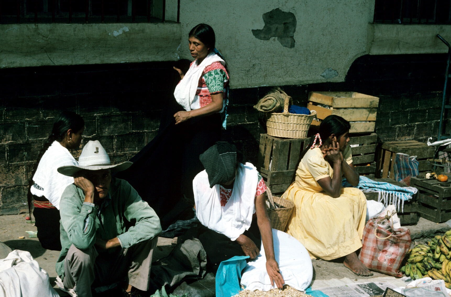 koopvrouwen op markt met 'blusas' en 'fajas' (ceintu...