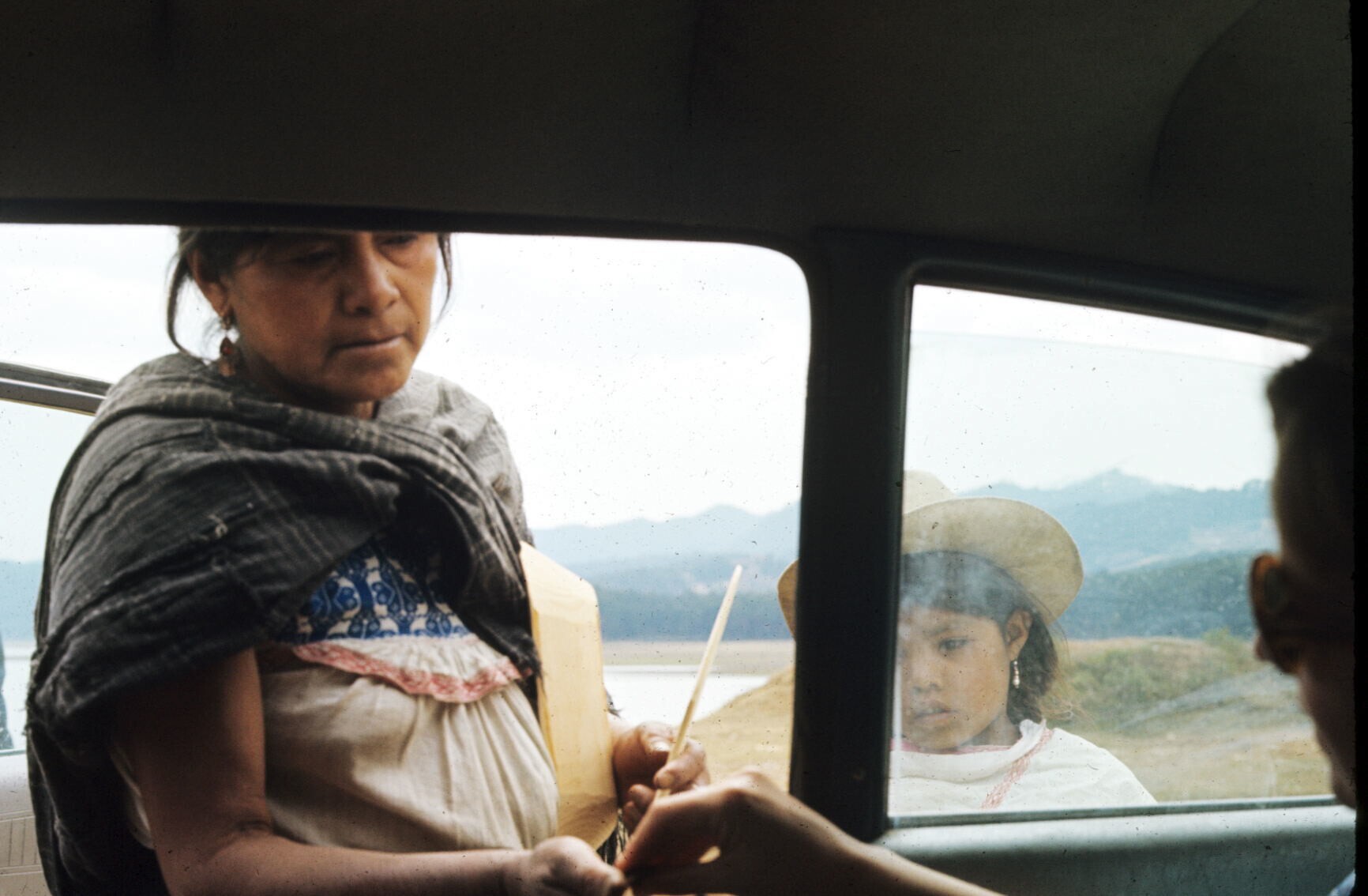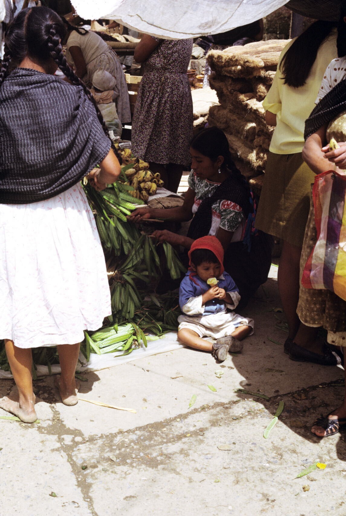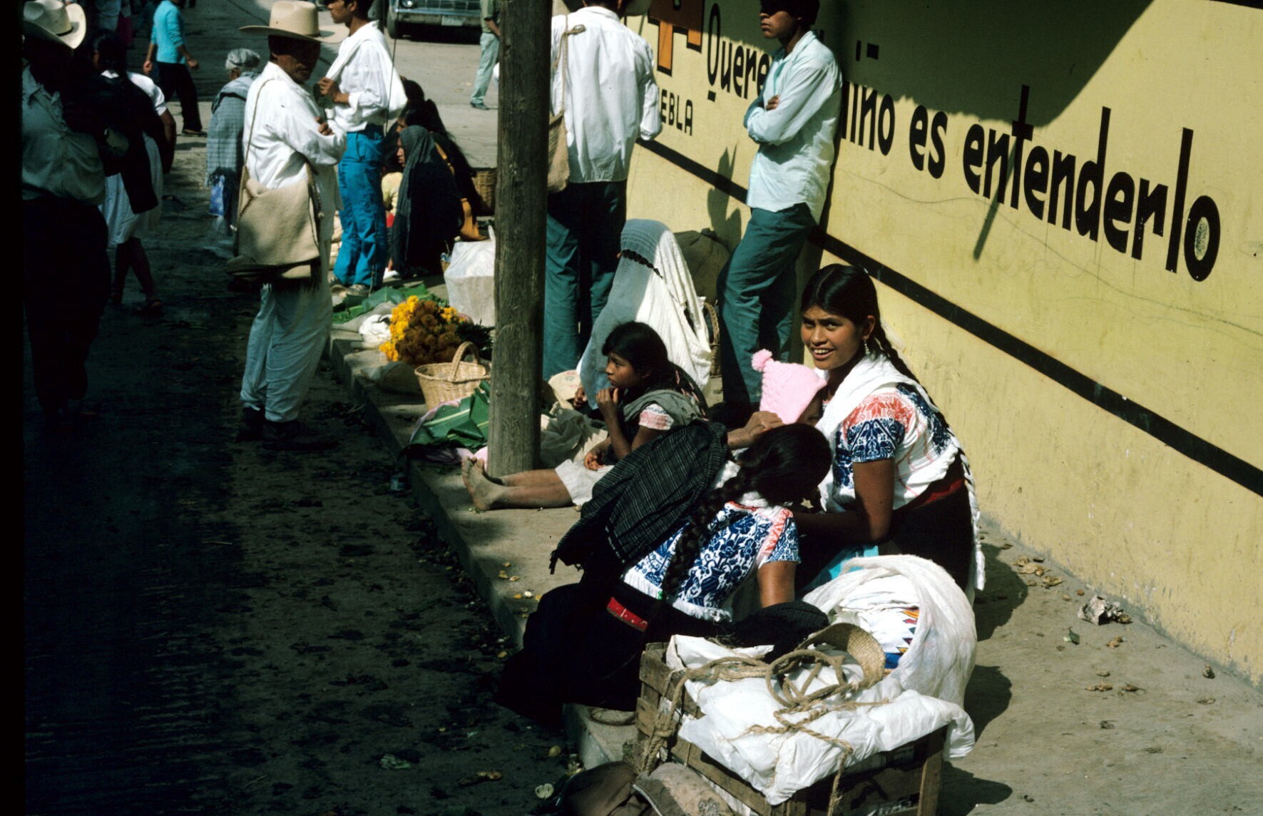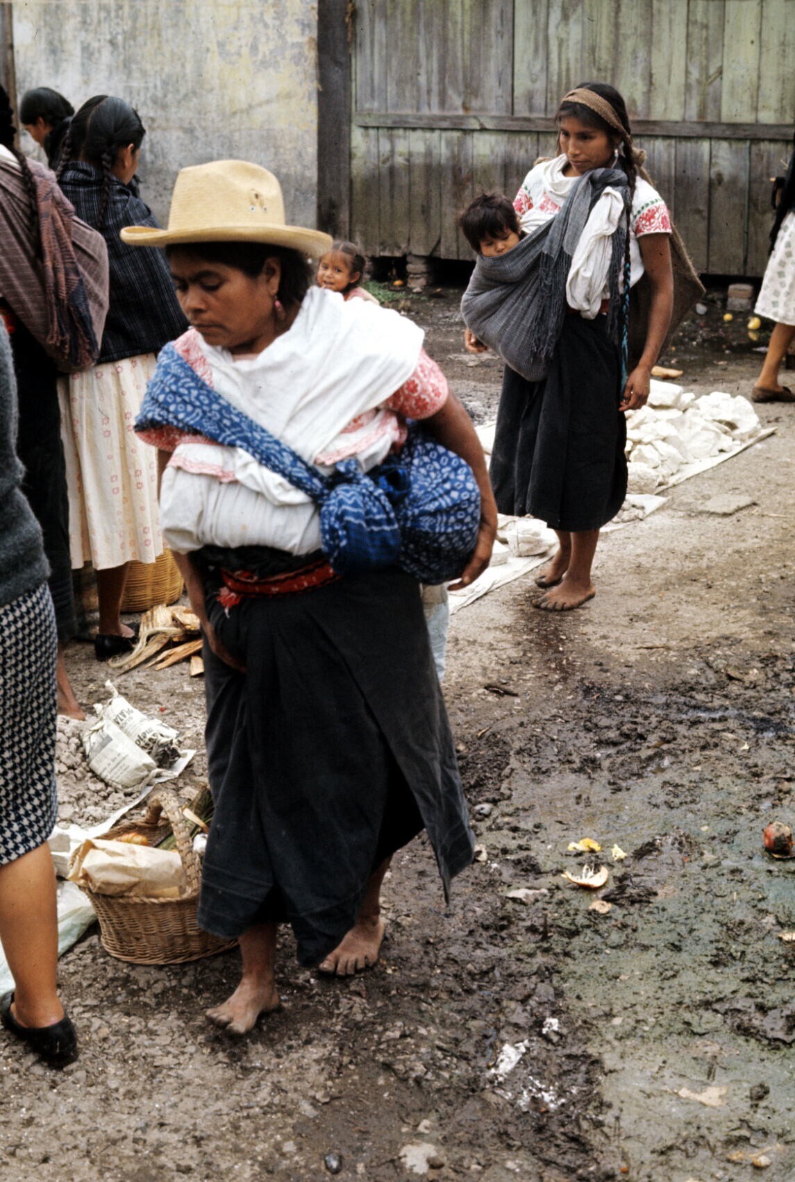 koopvrouwen op markt met 'blusas' en 'fajas' (ceintu...