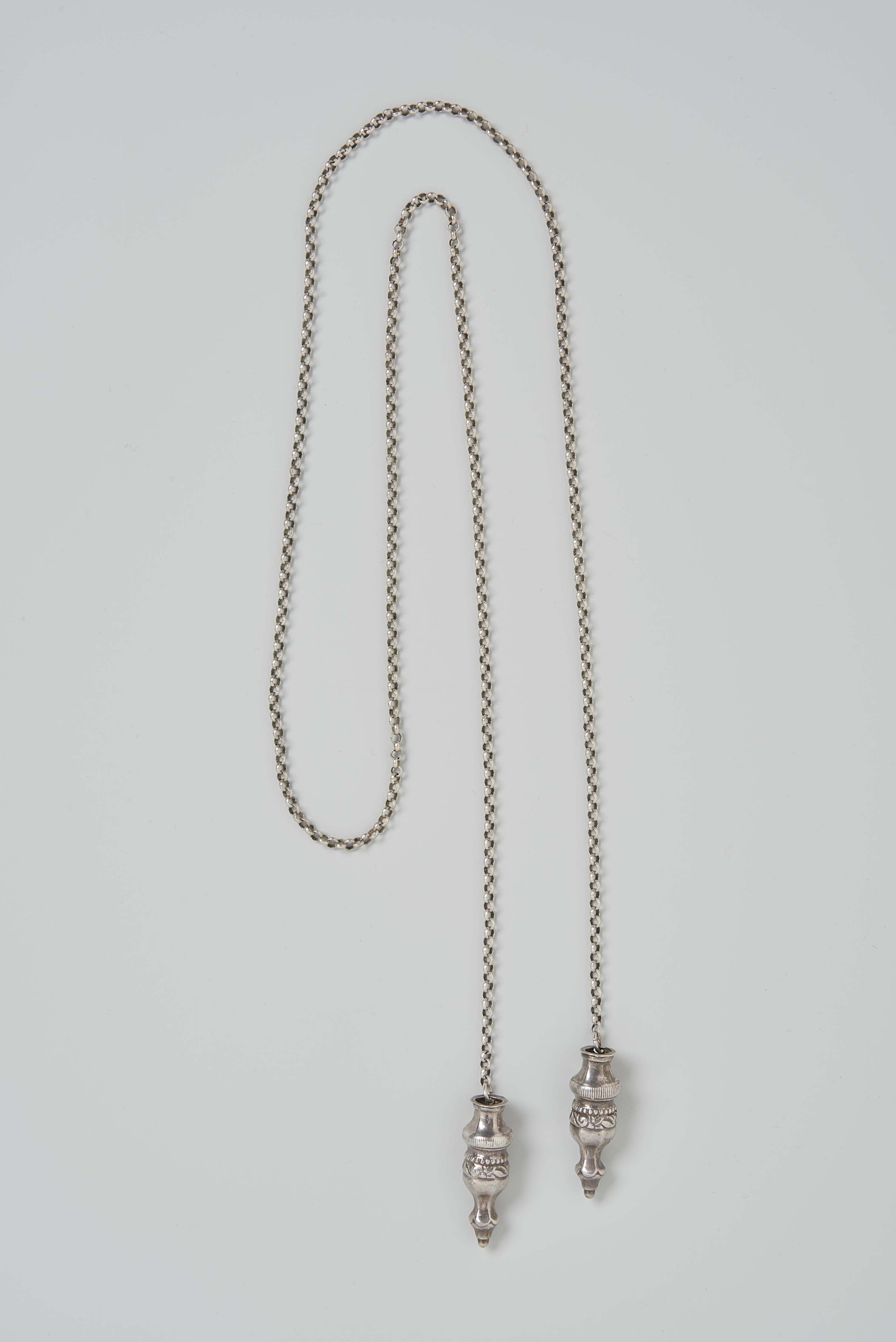 Paar zilveren breidoppen, vermaakt tot halssieraad, ...