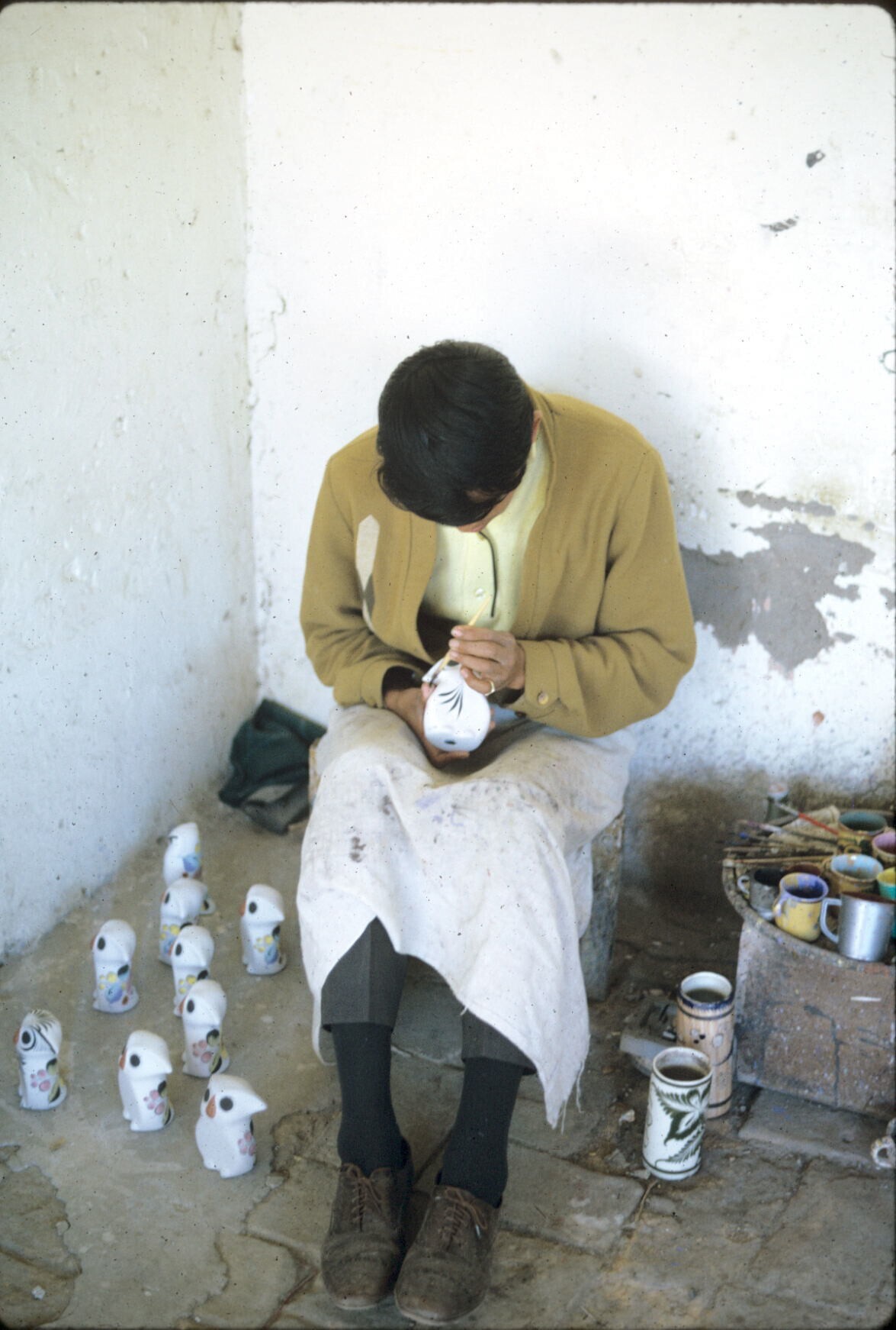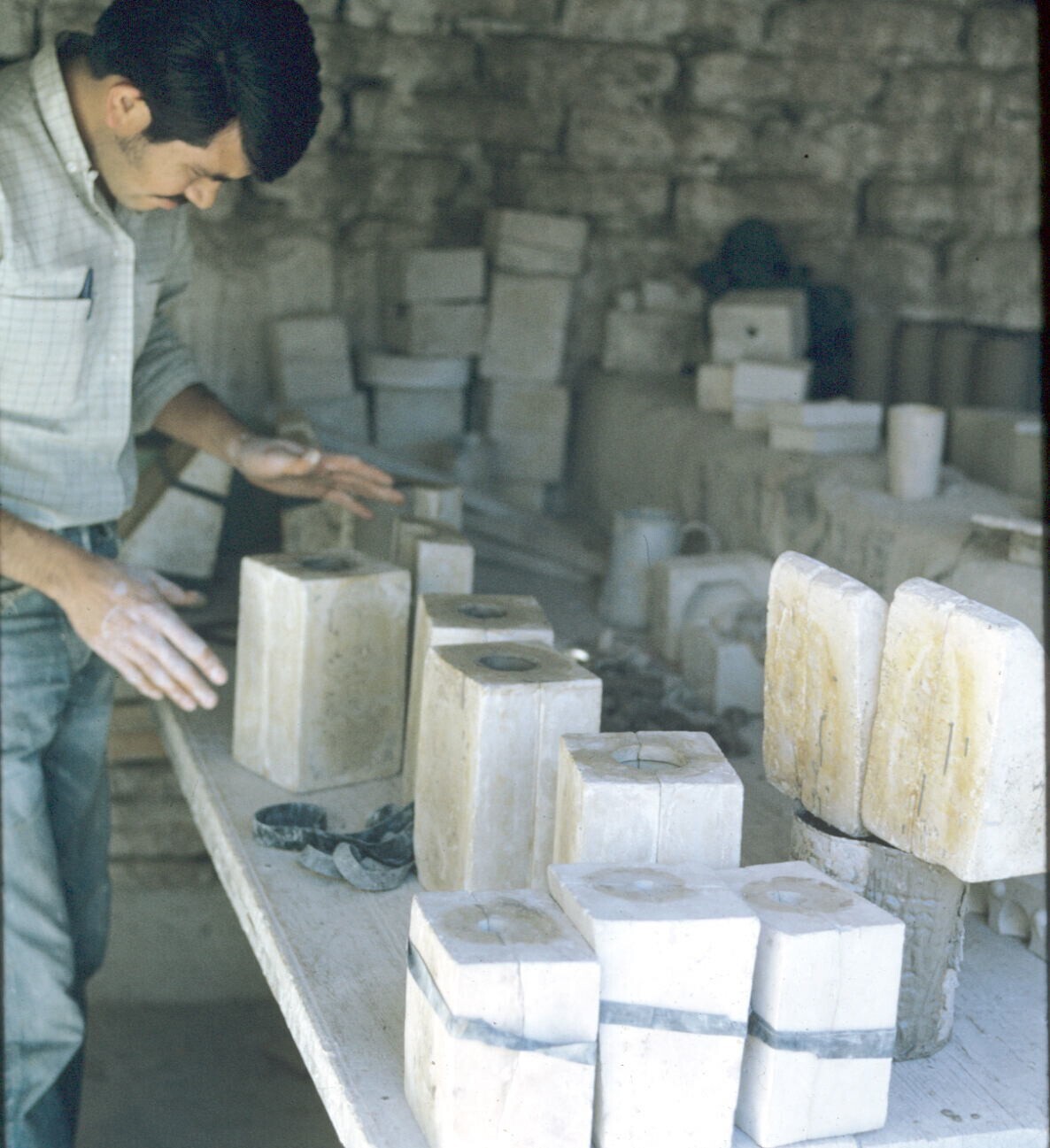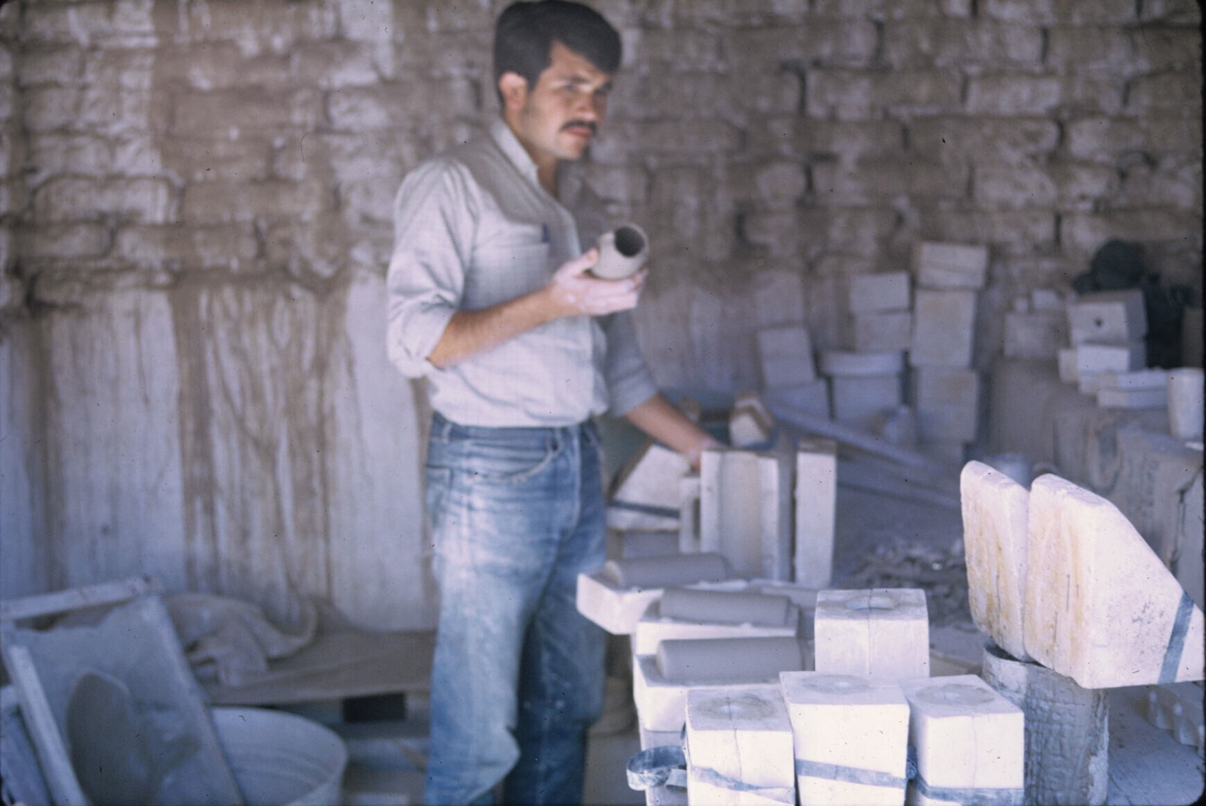 pottenbakker in atelier van Amado Galván met mallen ...