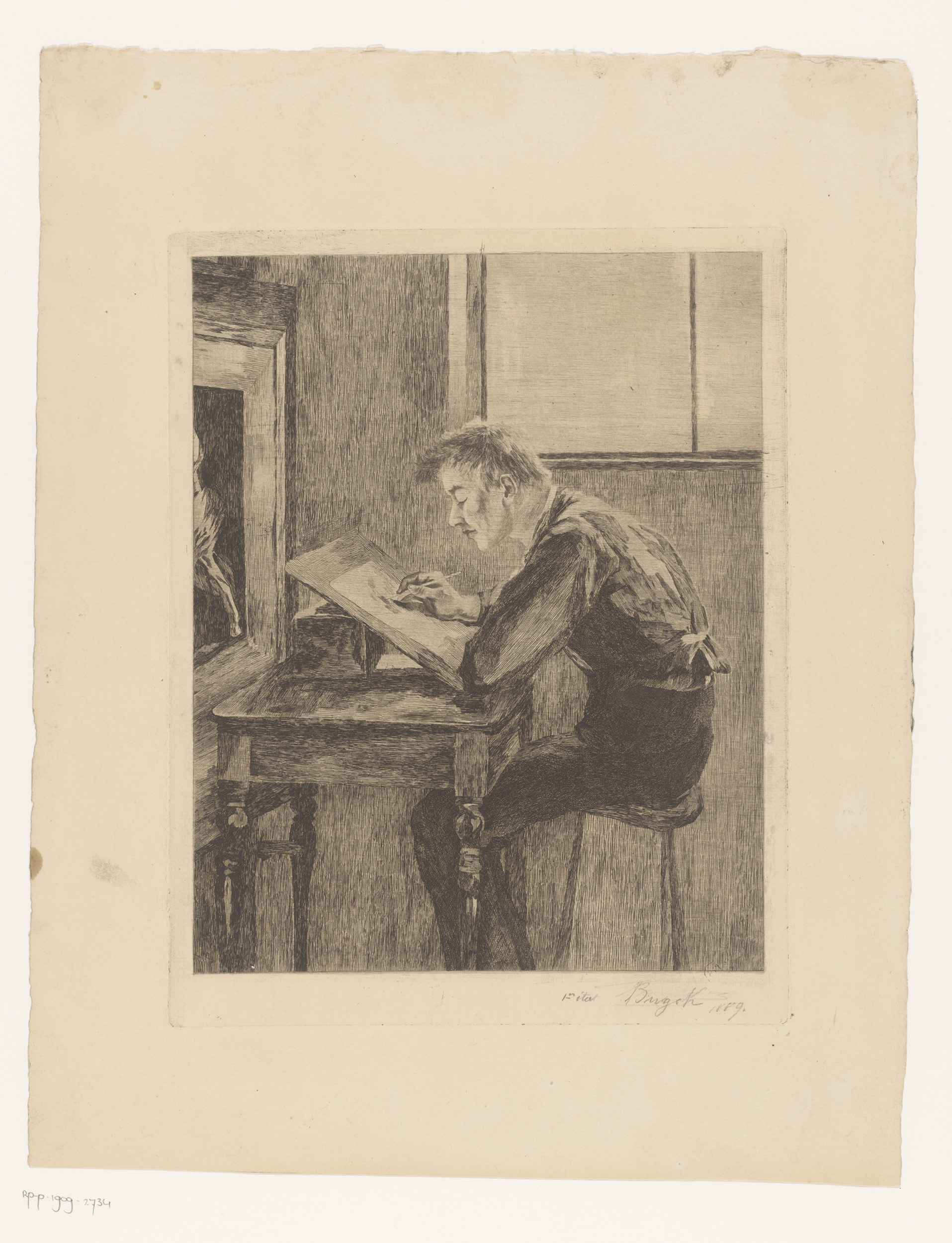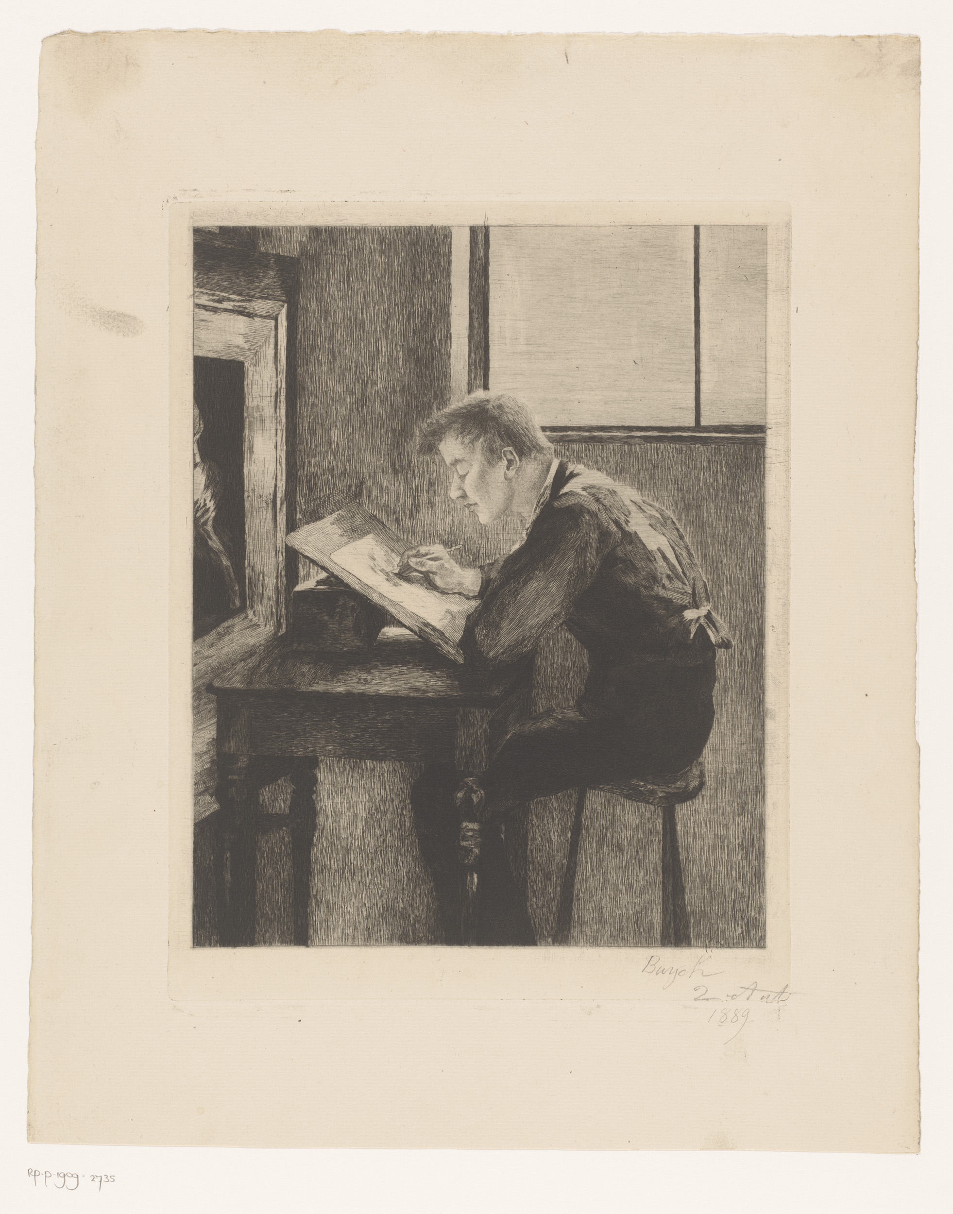 Tekenaar over zijn werk gebogen