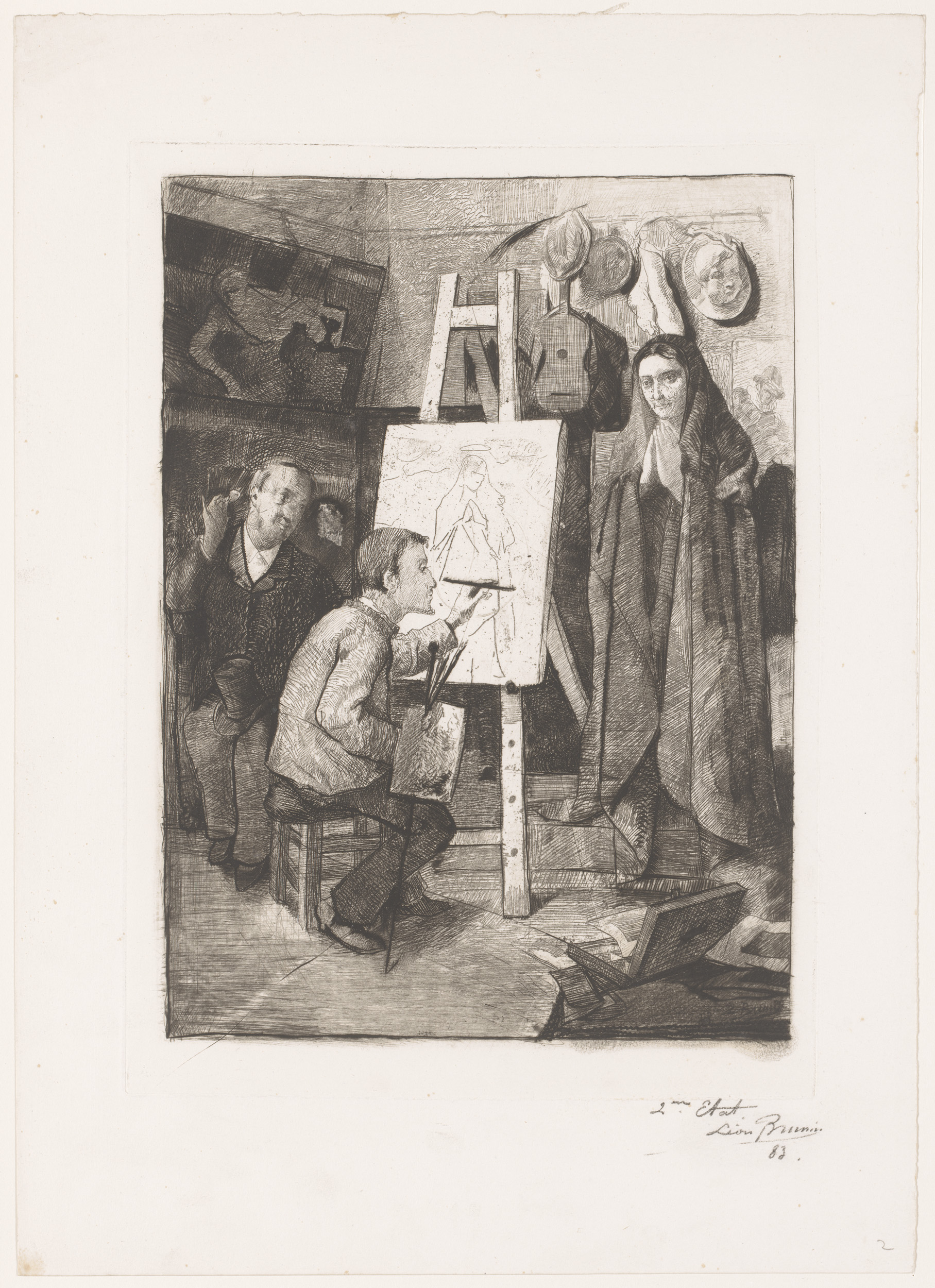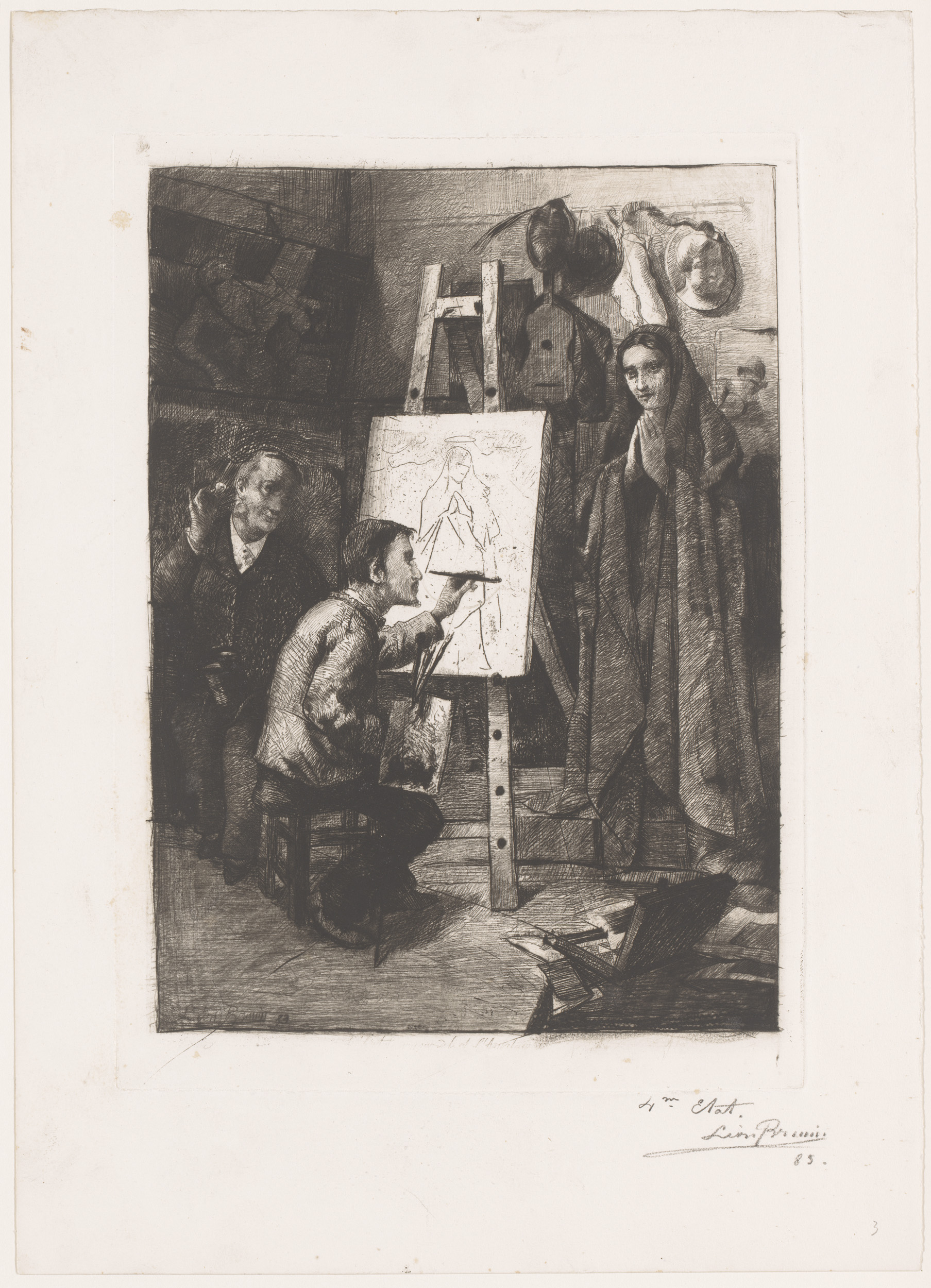 Kunstenaar, zijn model en een kunstminnaar in het at...