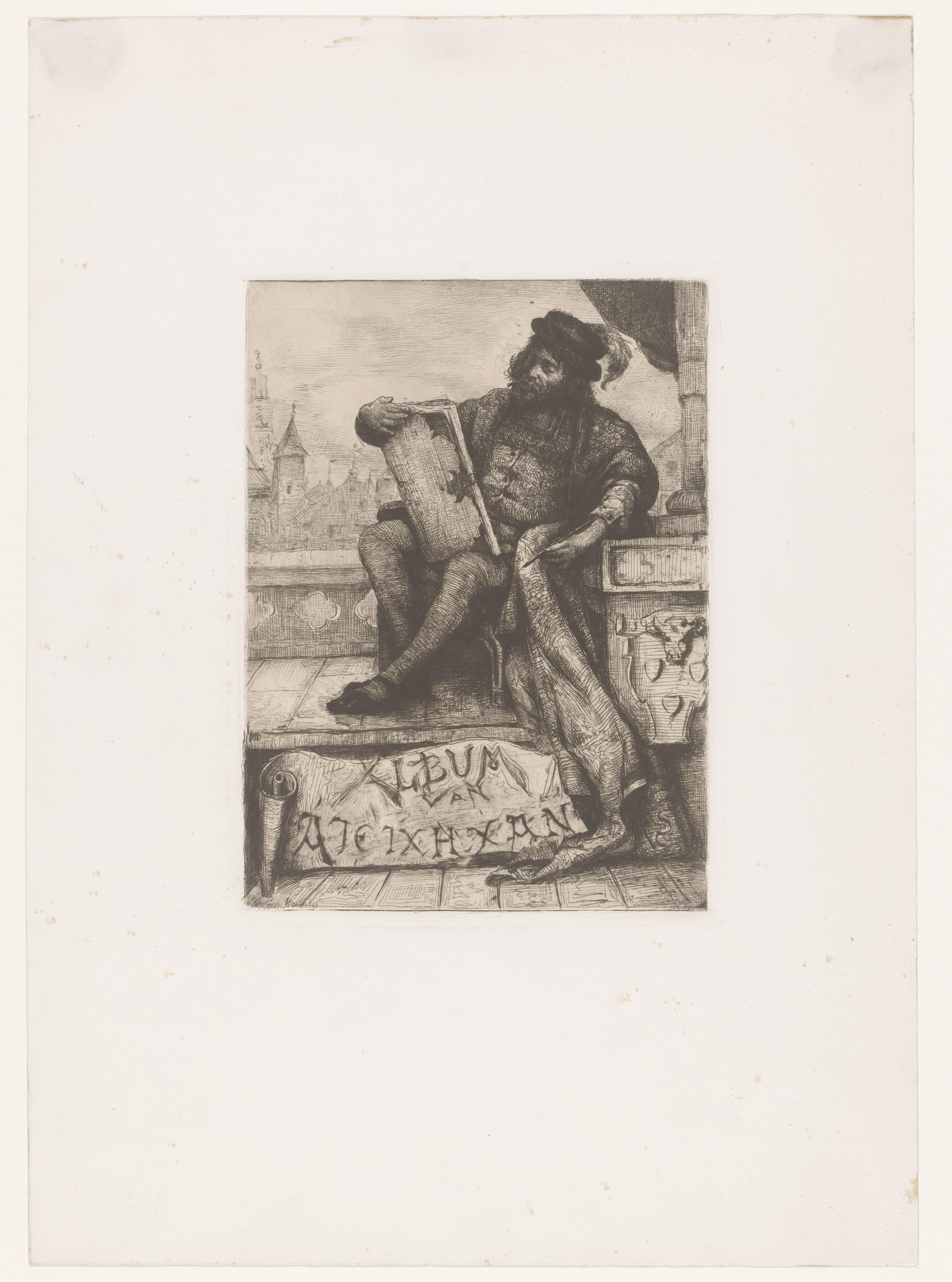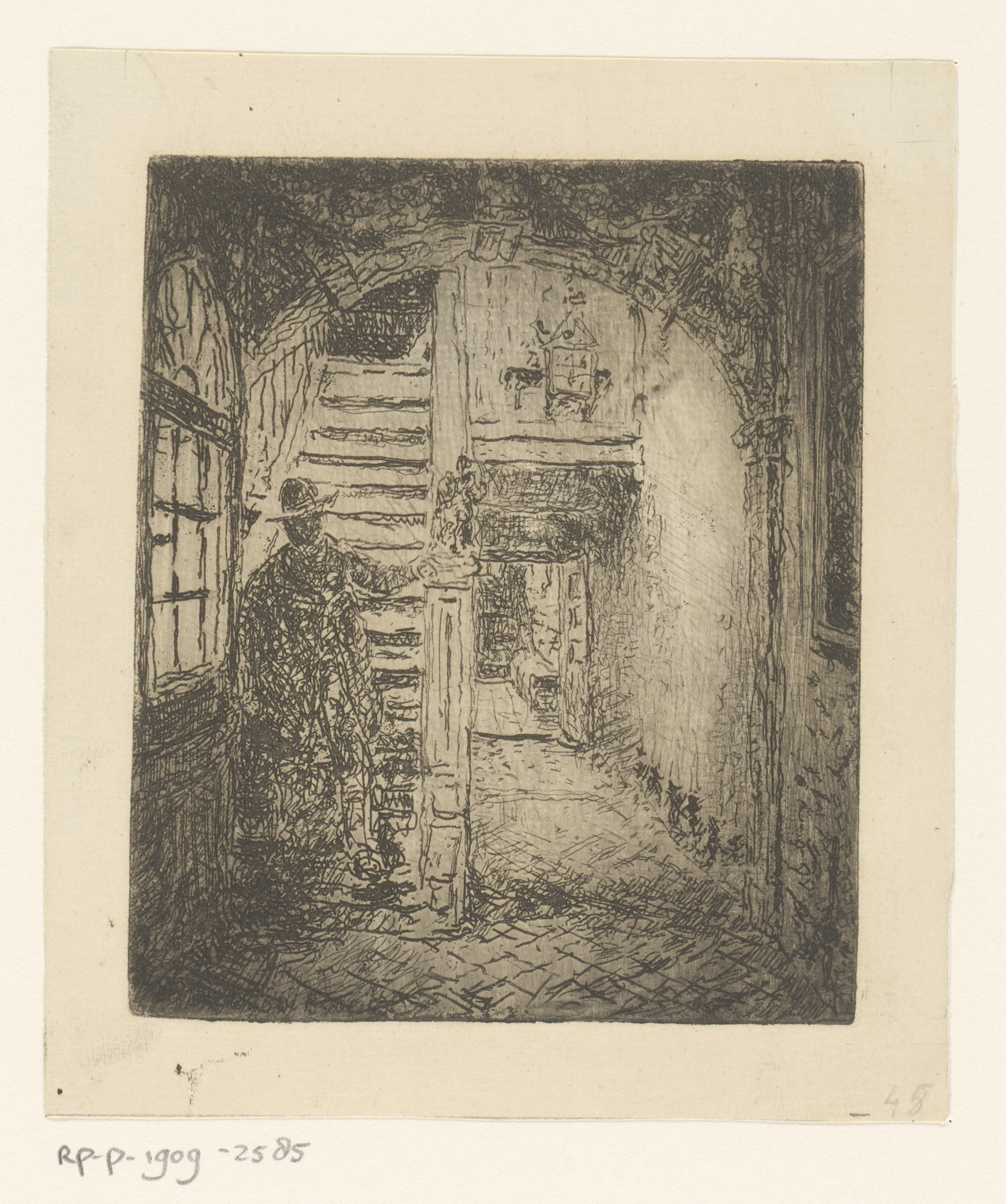 Man op de trap van het Brouwershuis te Antwerpen