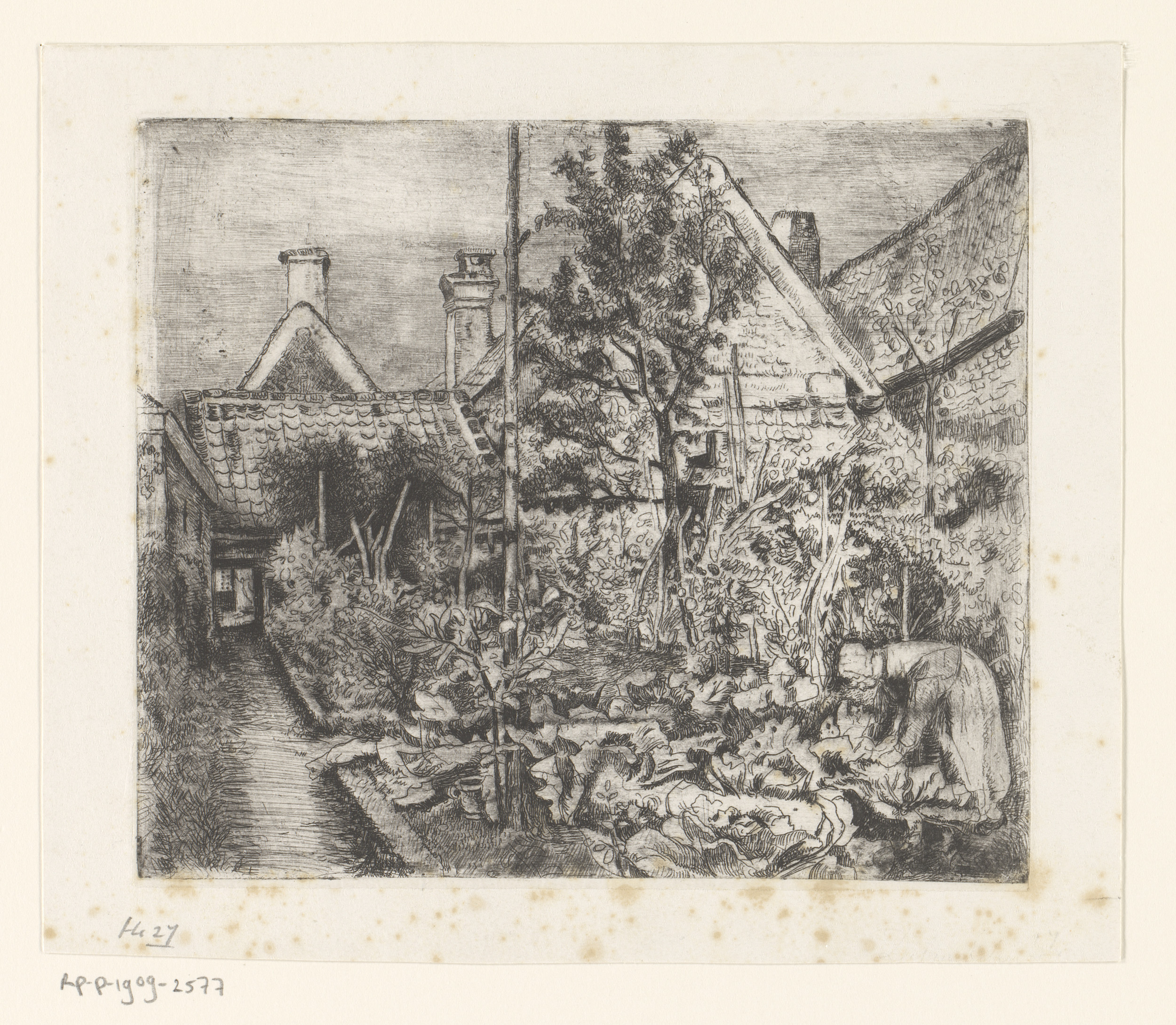 Huis met moestuin waarin een vrouw aan het werk is