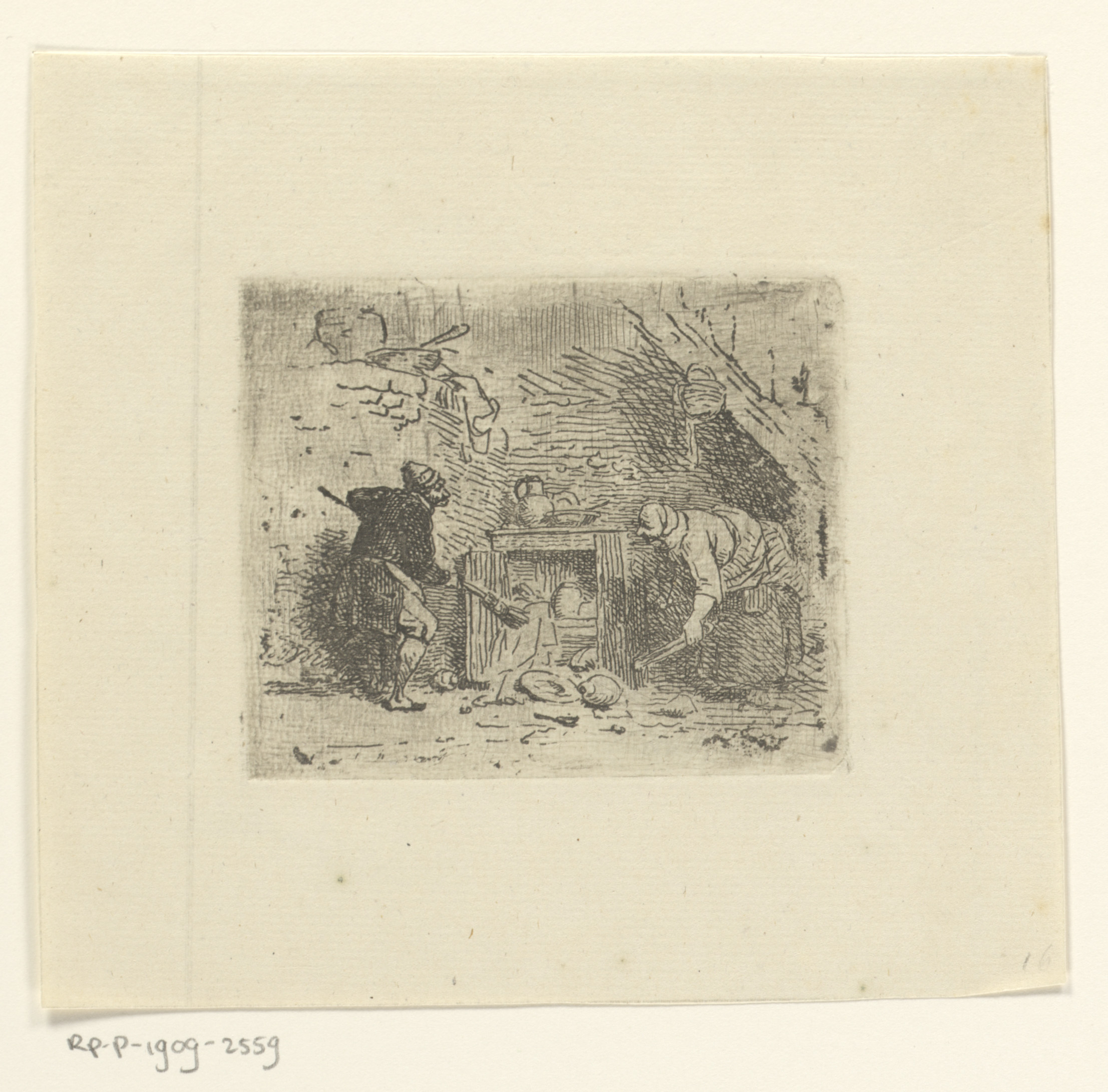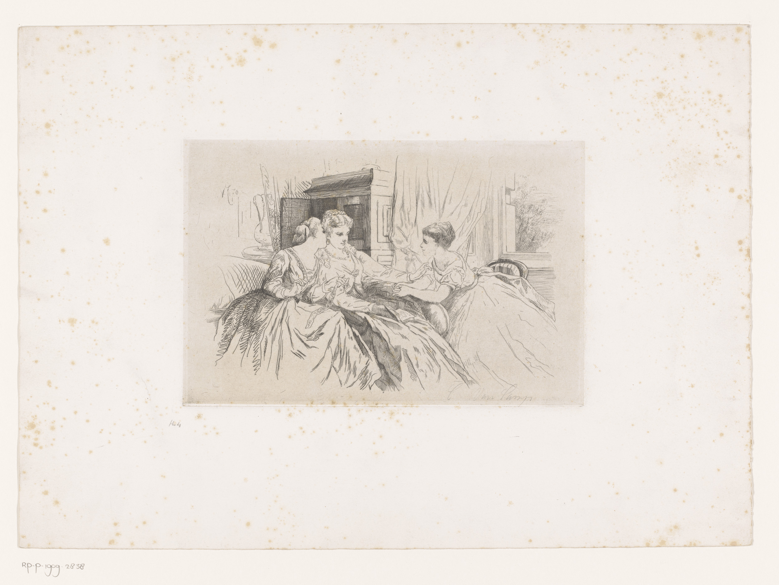 Interieur met een vrouw en twee kinderen