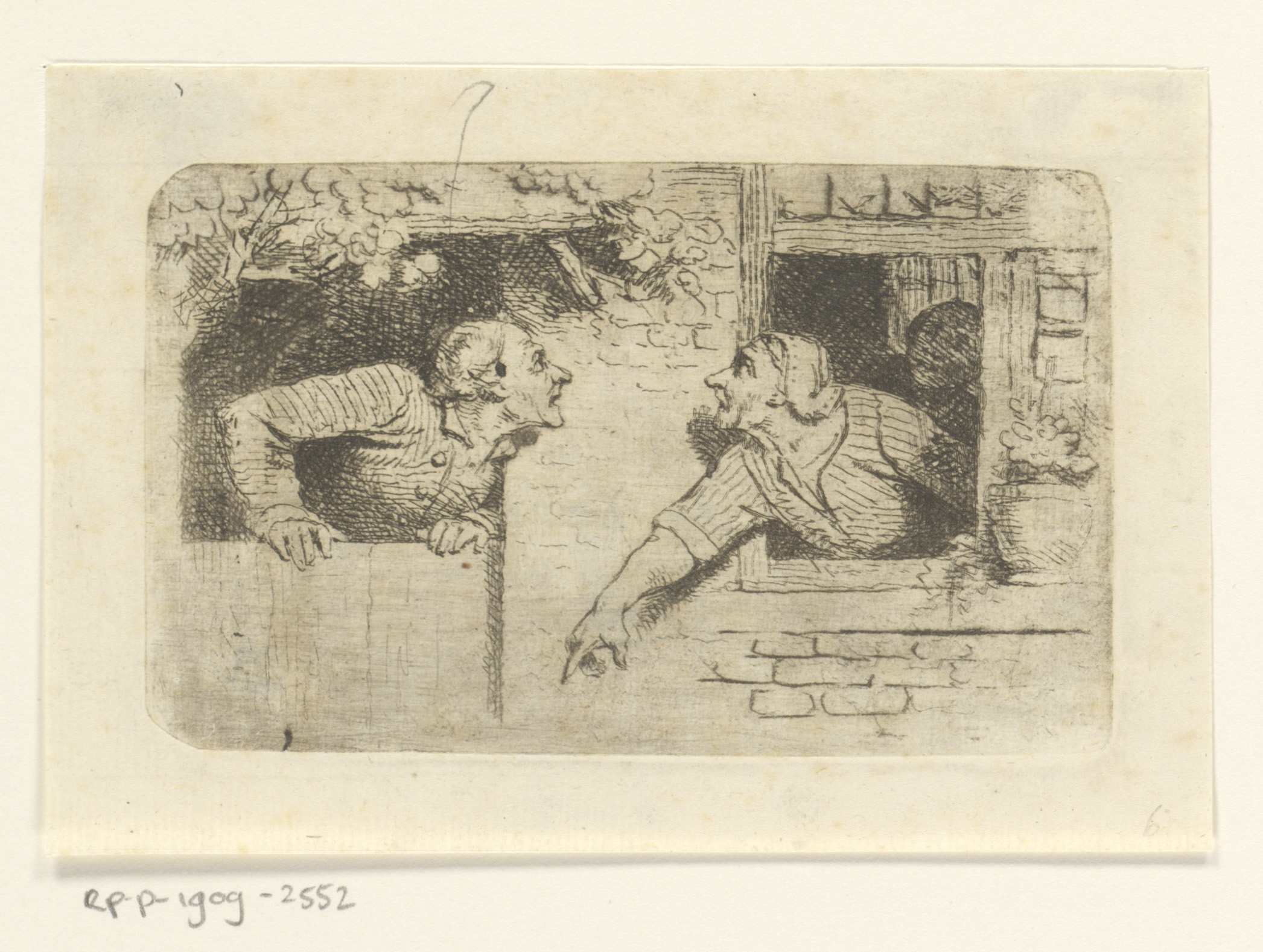 Twistende figuren die uit een deur- en raamopening h...