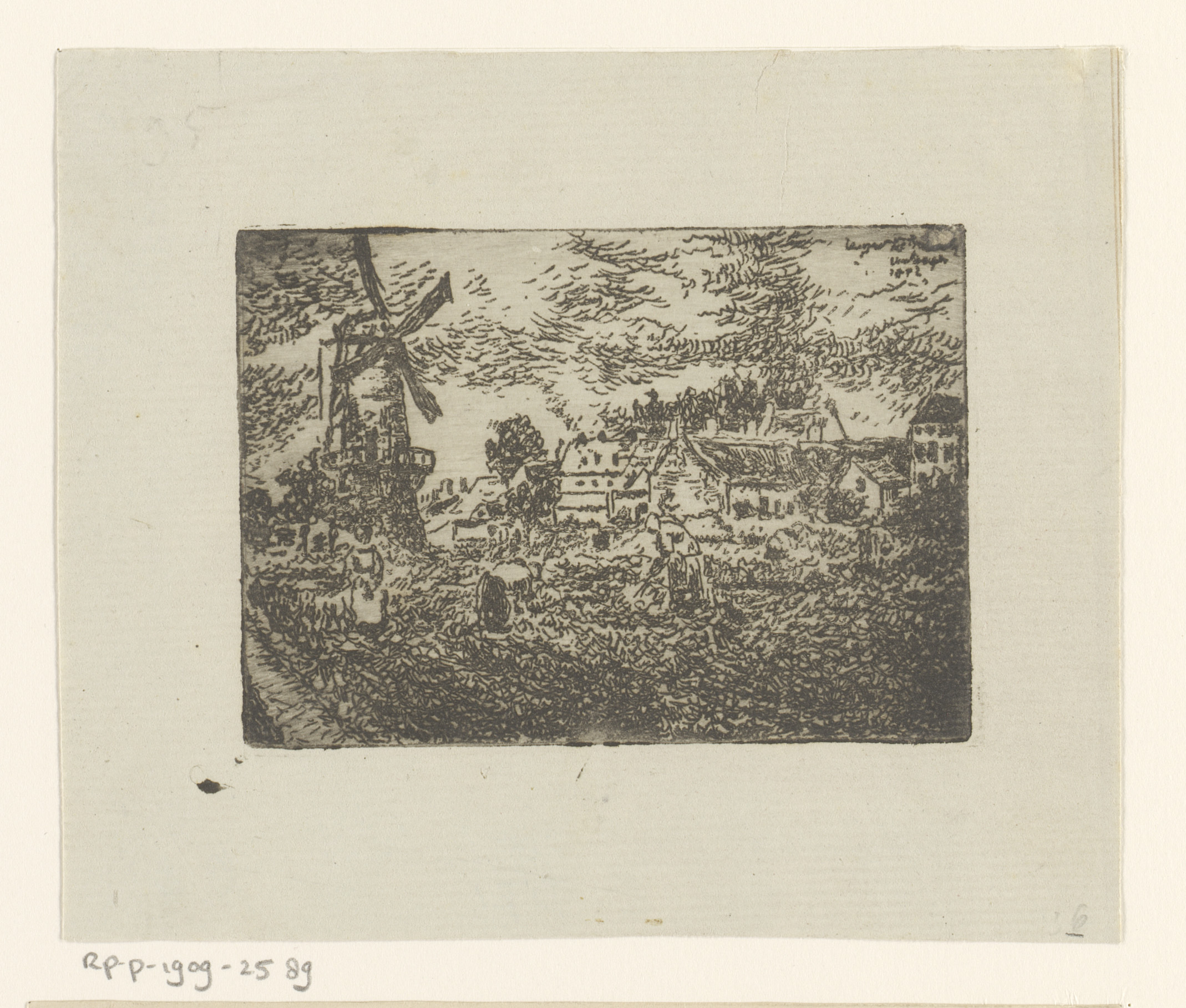 Landschap met molen en boeren aan het werk op het land