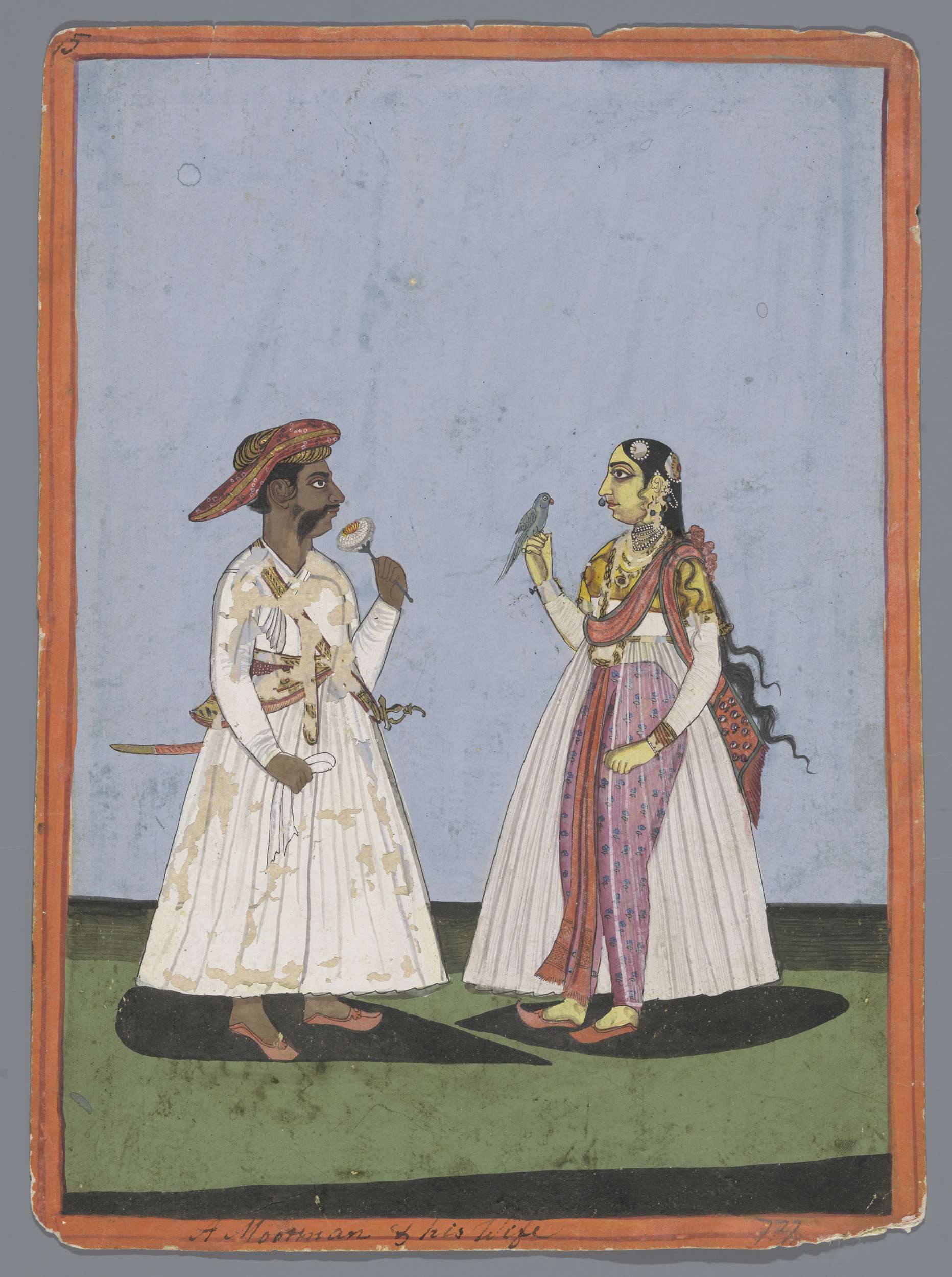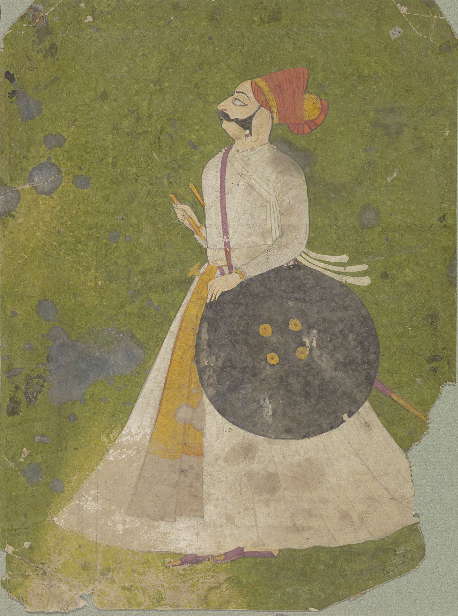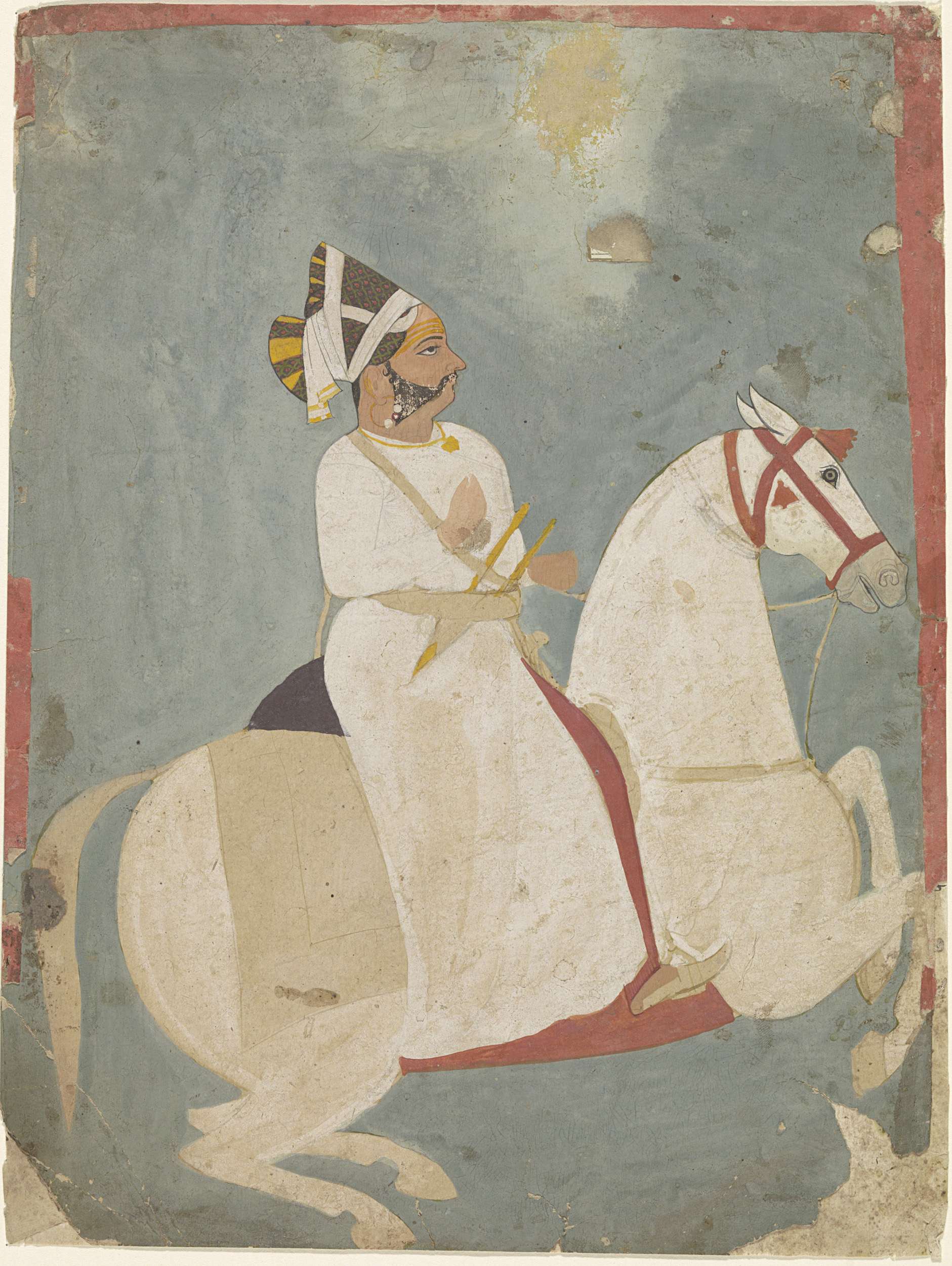 Vorstelijk gekleed persoon in een heuvelachtig lands...