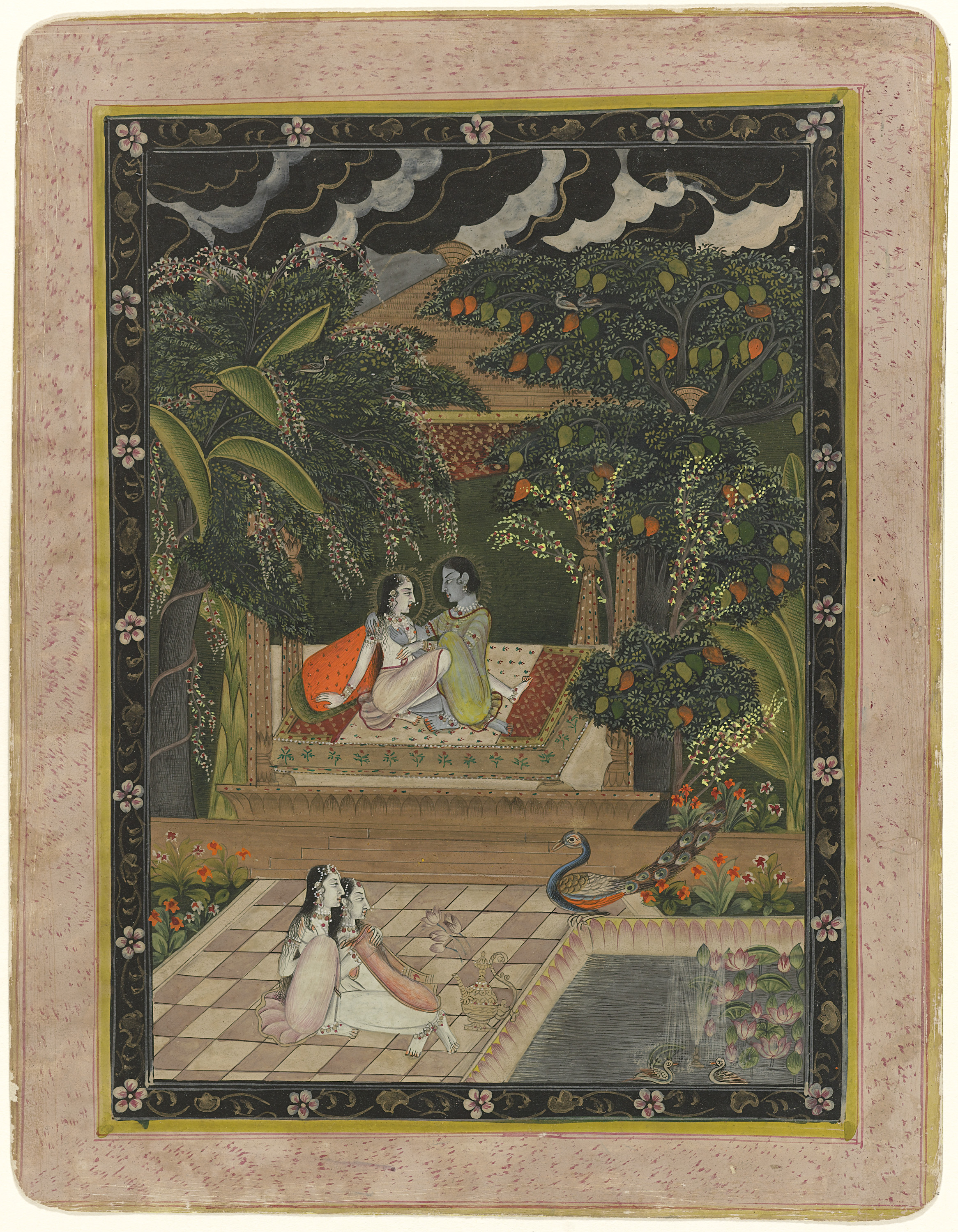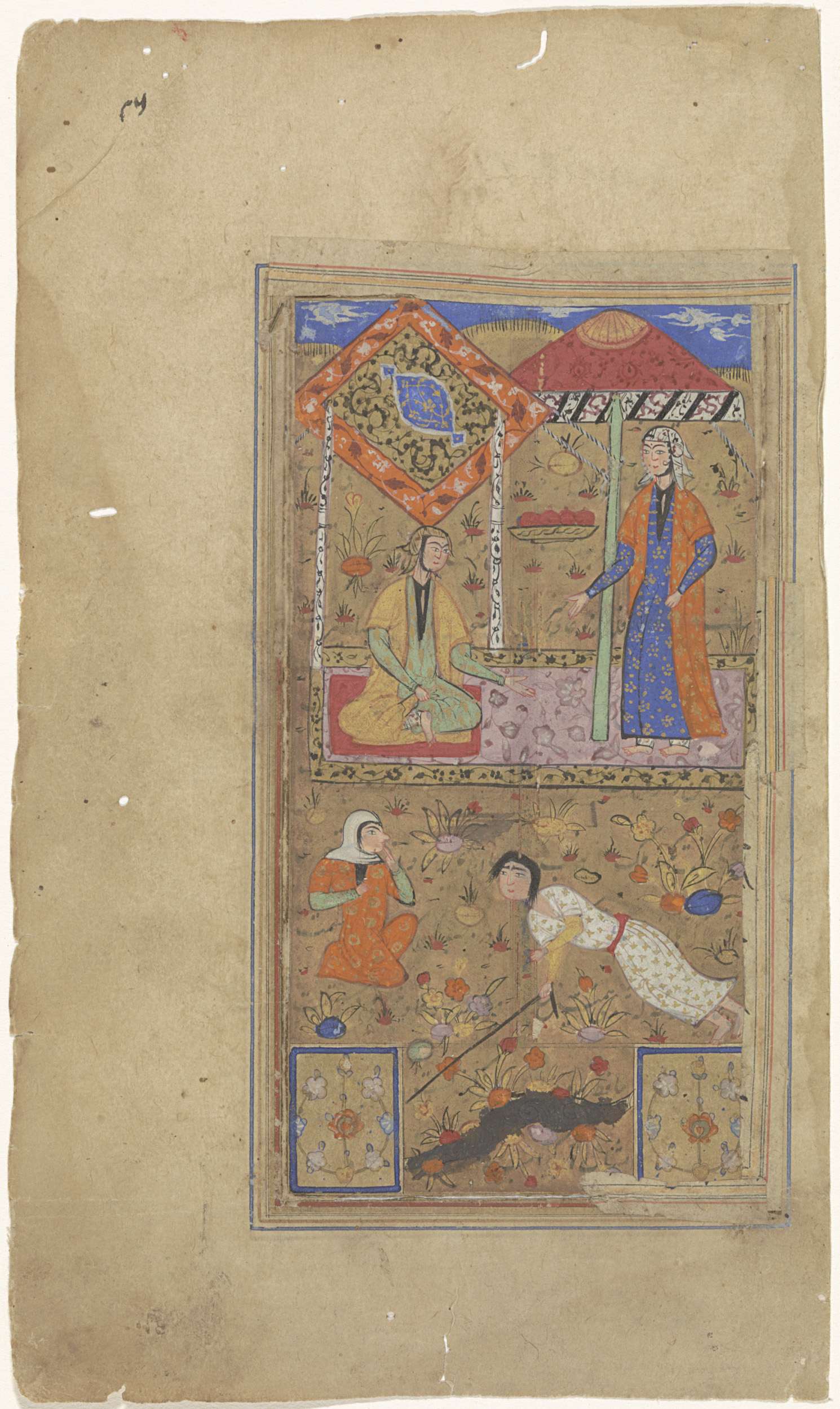 Vrouw onder een baldakijn en een vrouw op haar knieën