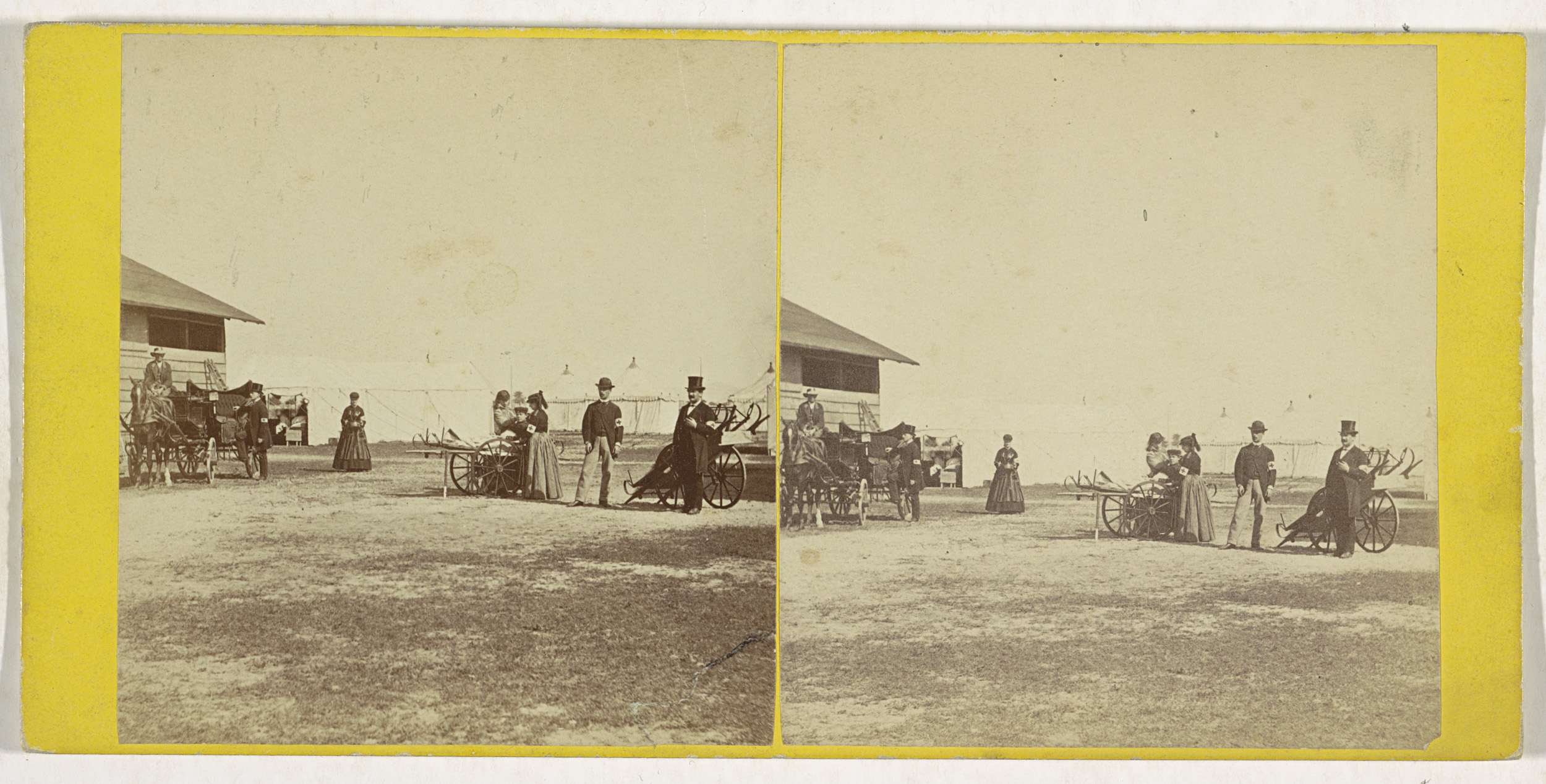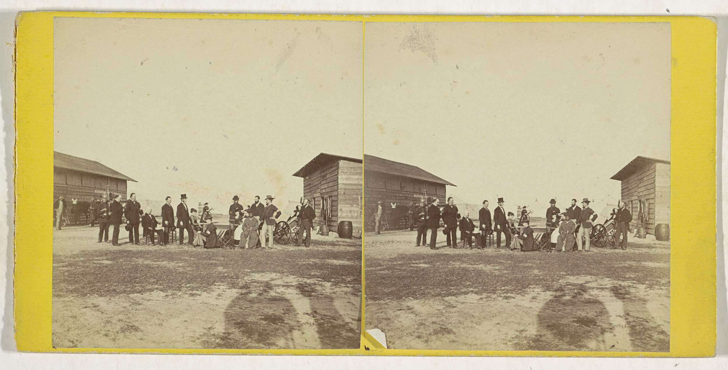 Groep mensen op een binnenplaats tussen barakken, Me...