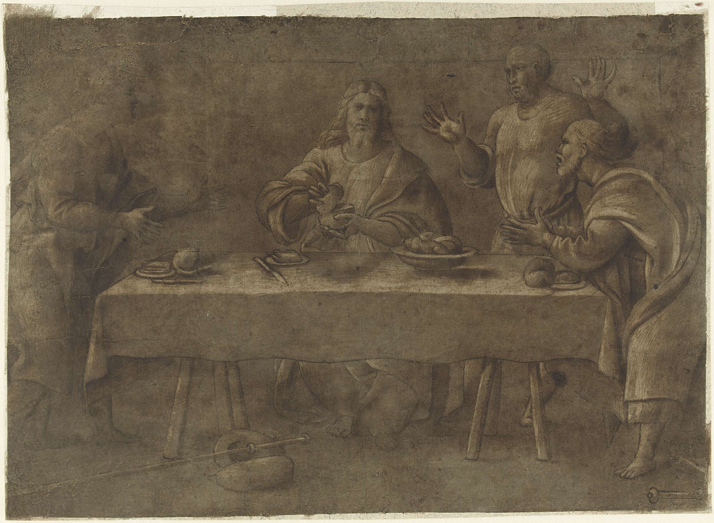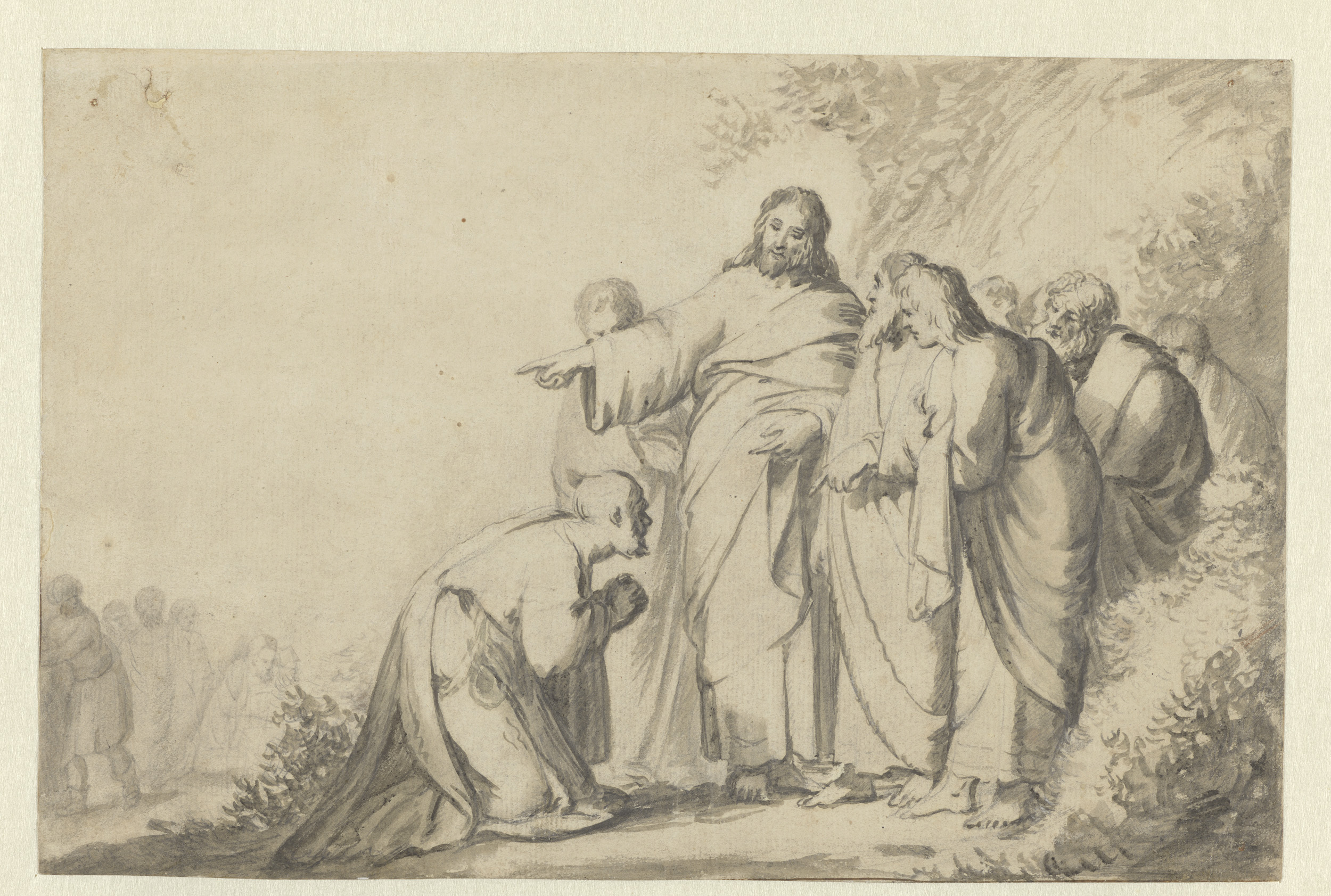 Christus met een knielende man en zijn discipelen