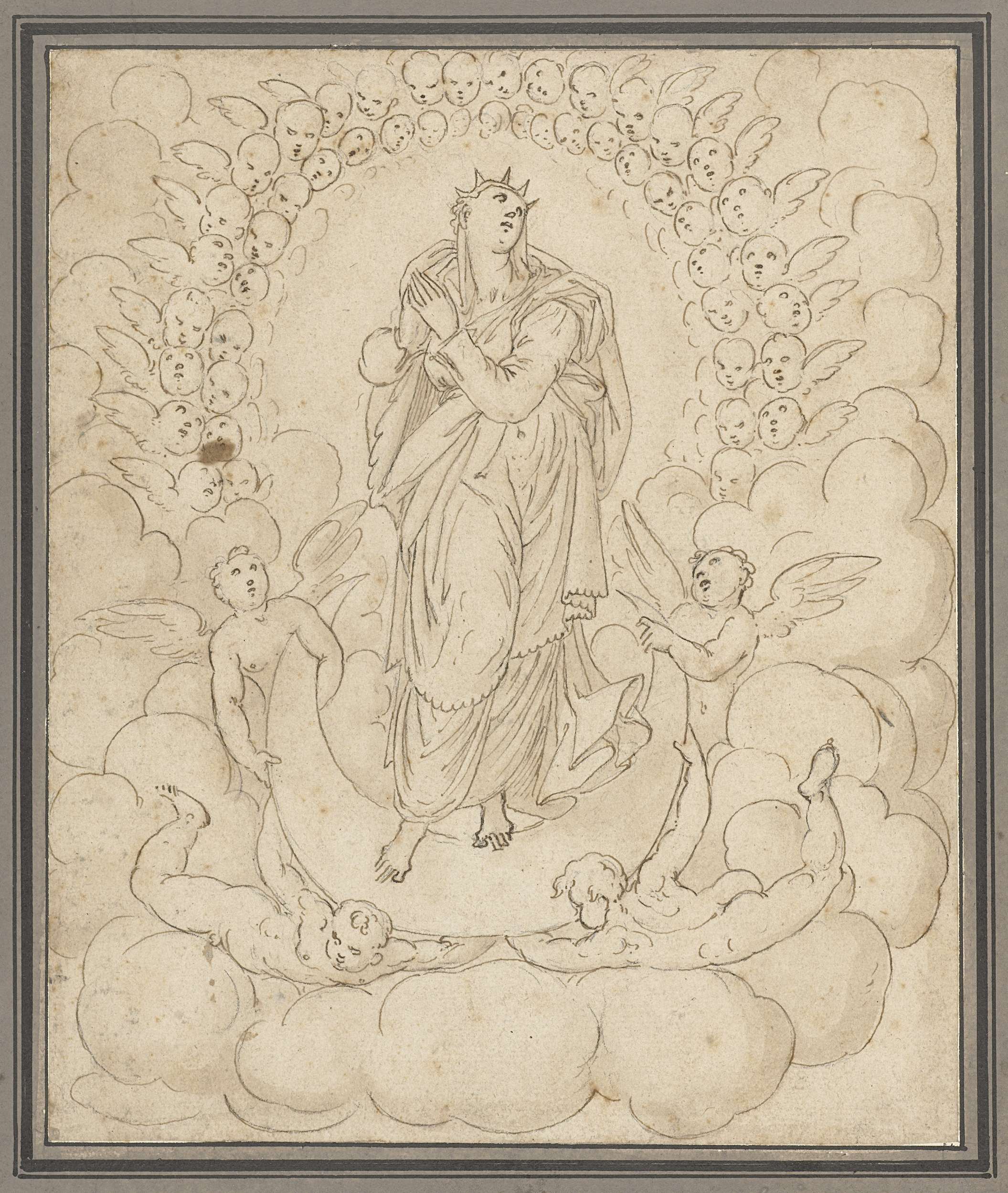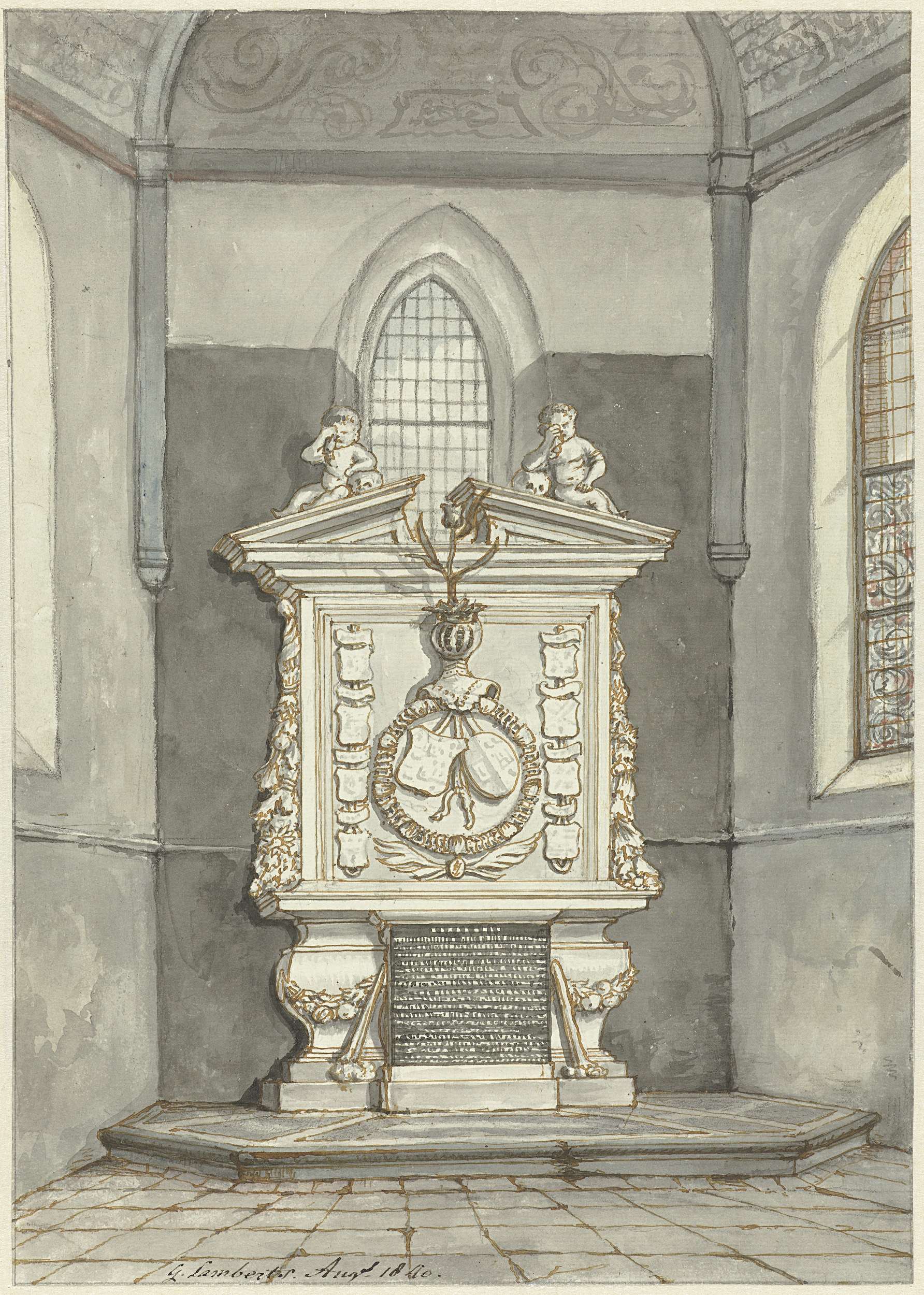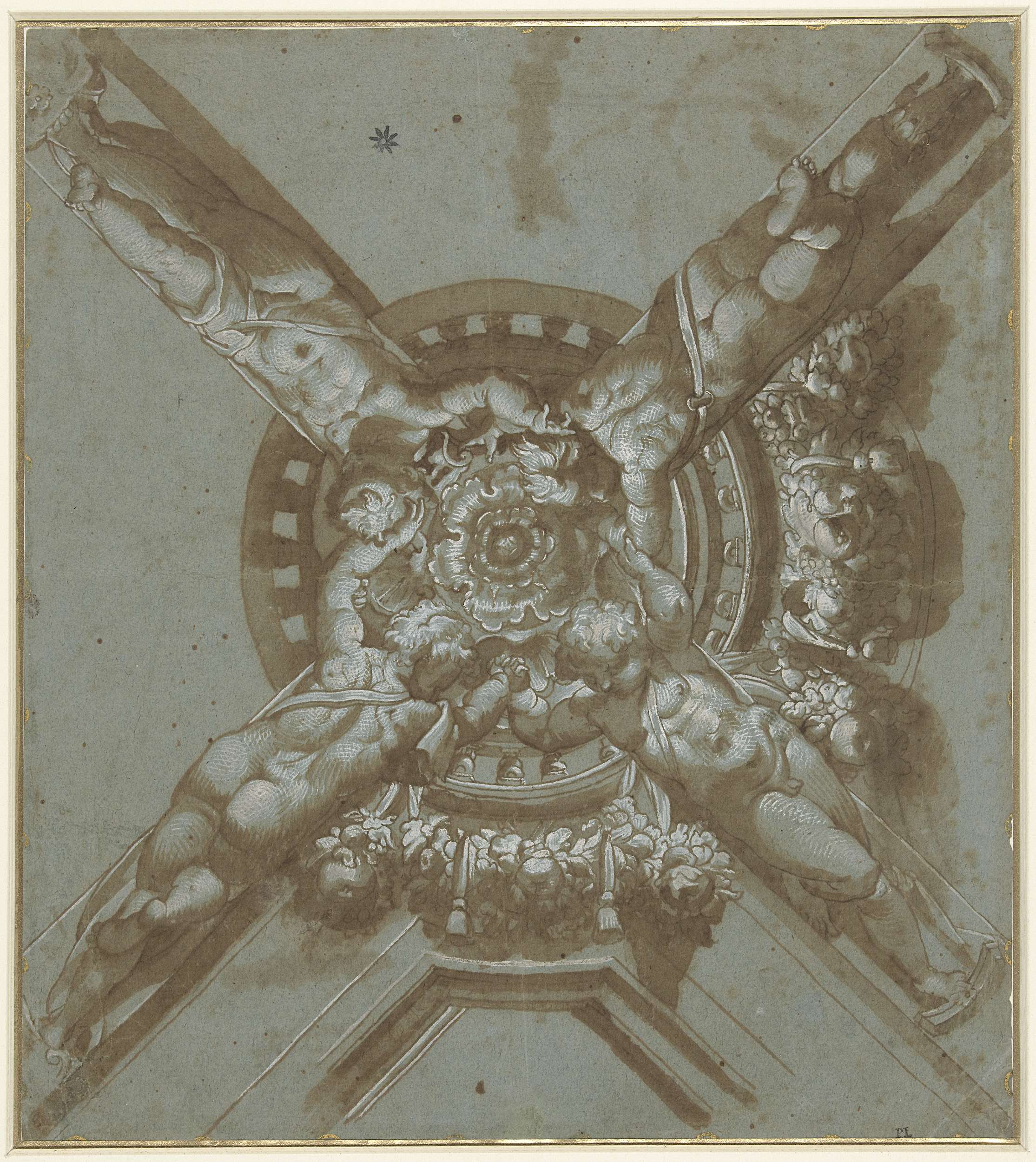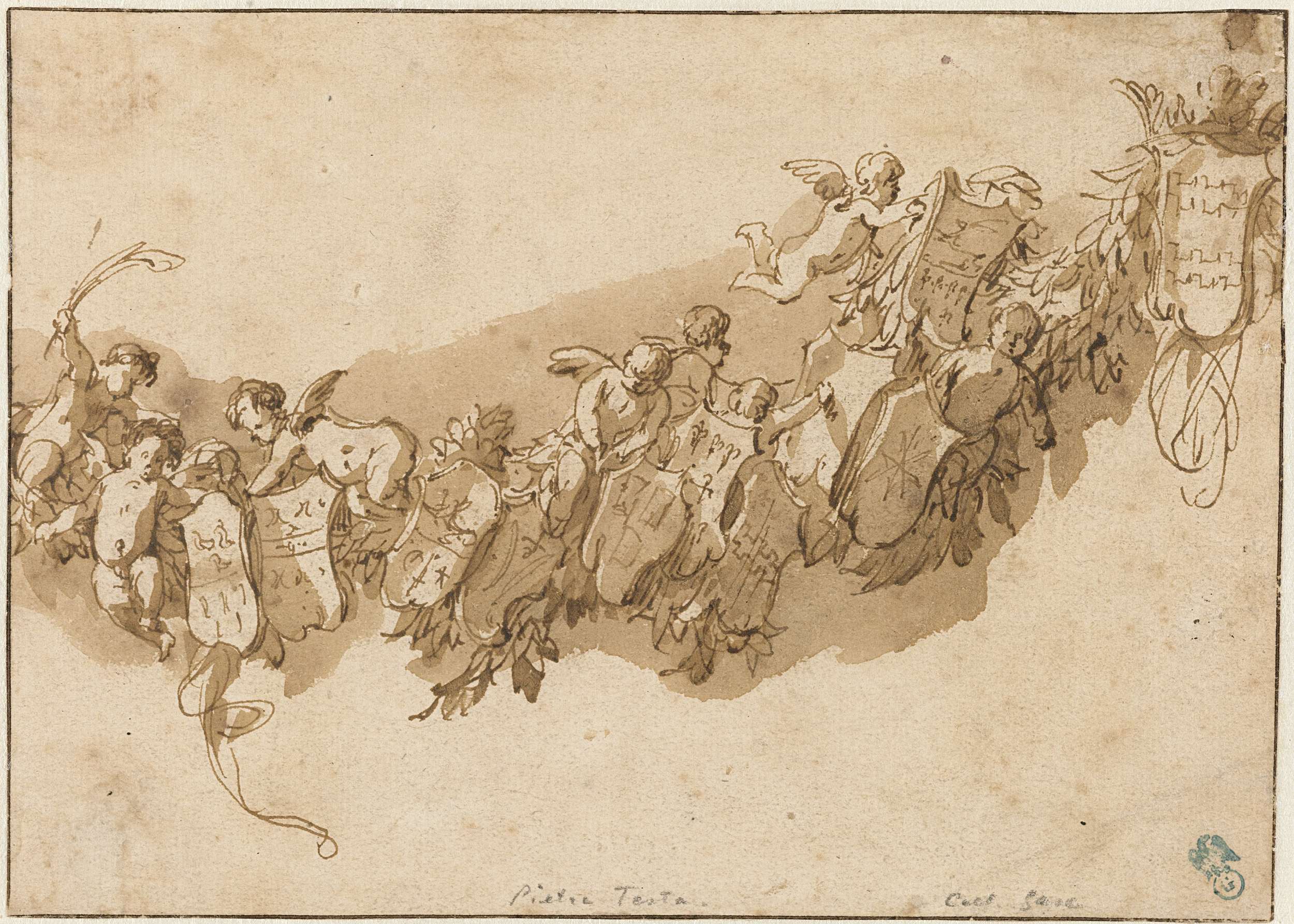Heraldische guirlande omgeven door engelen