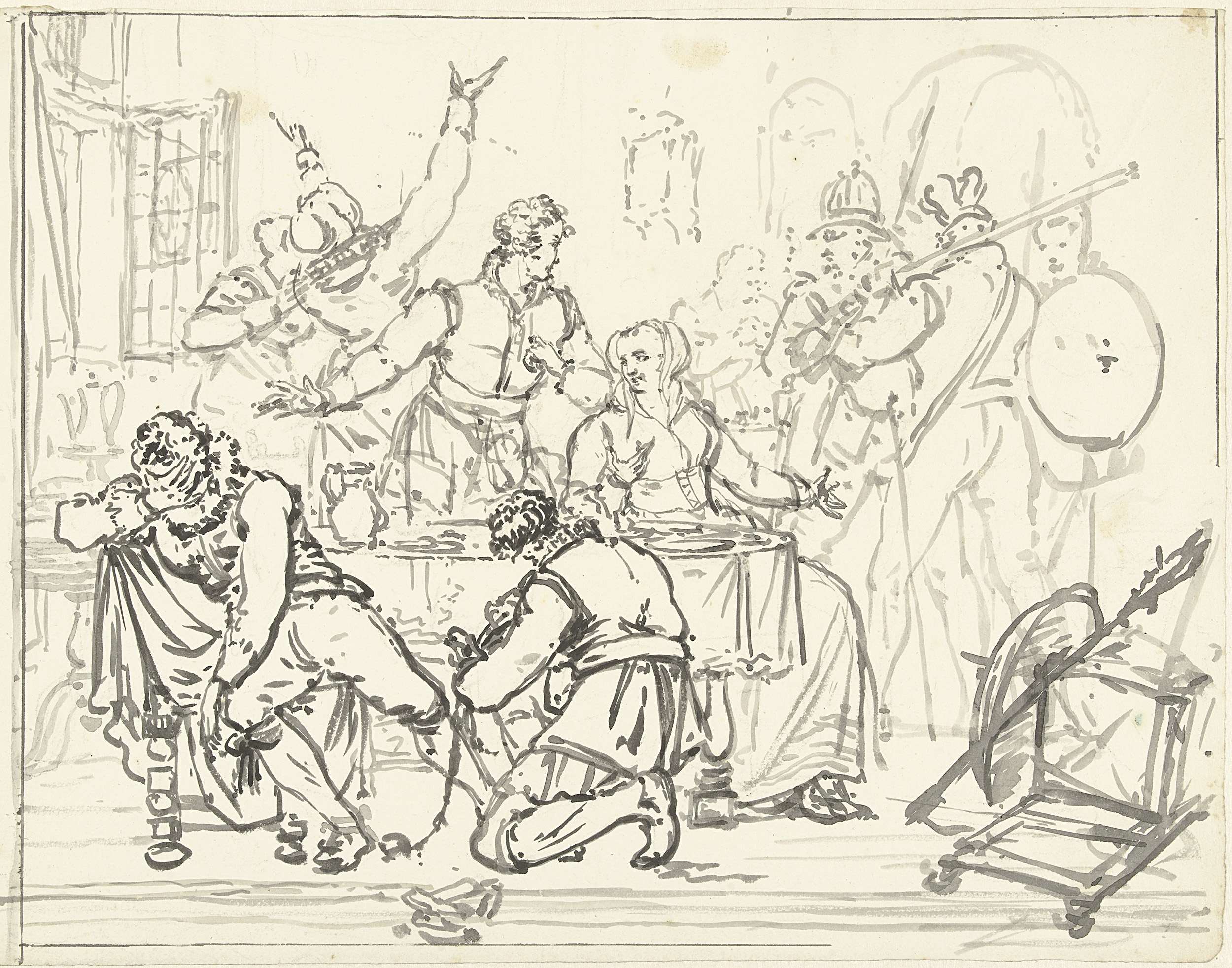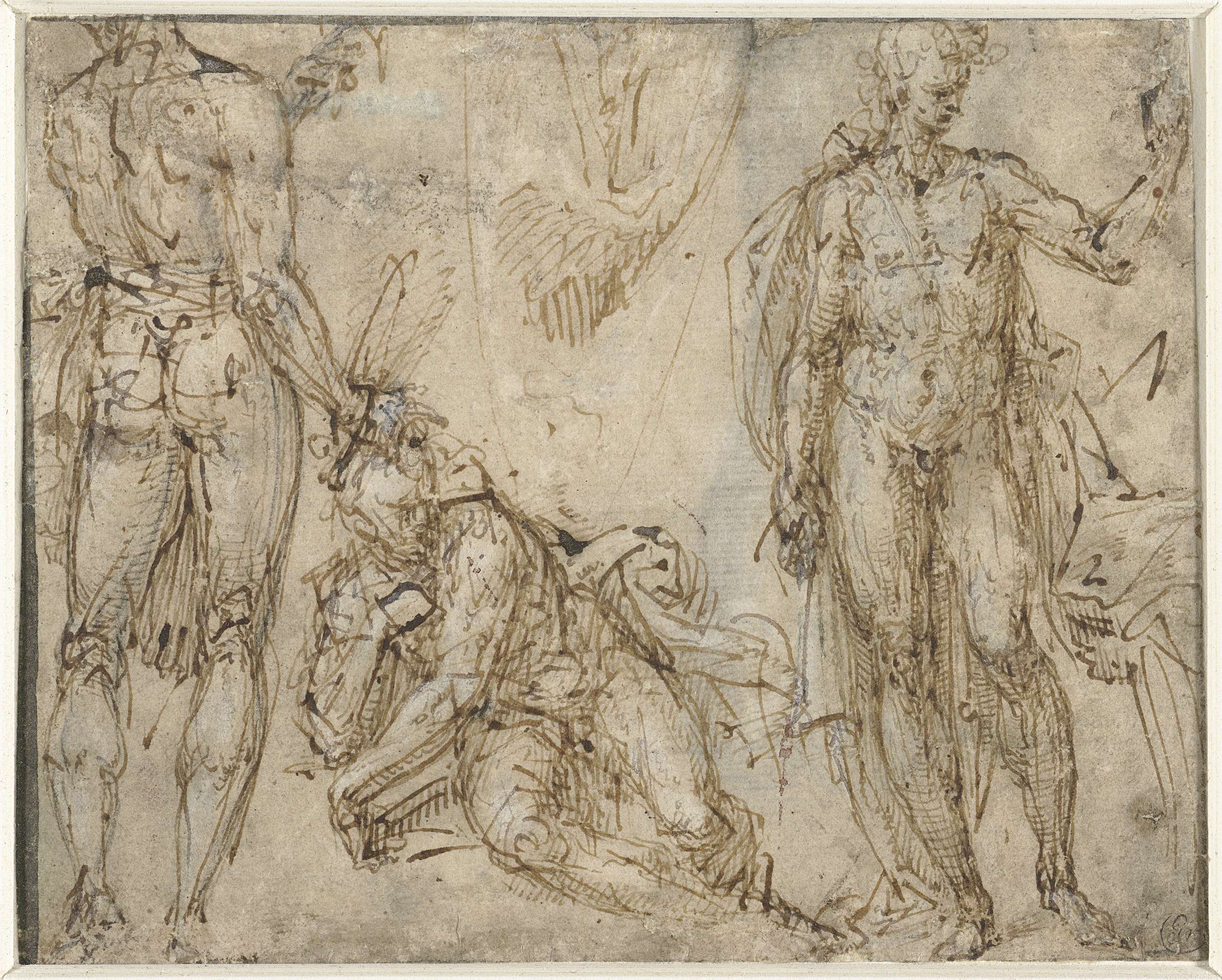 Schetsen van personen, waaronder een vrouwelijk naakt