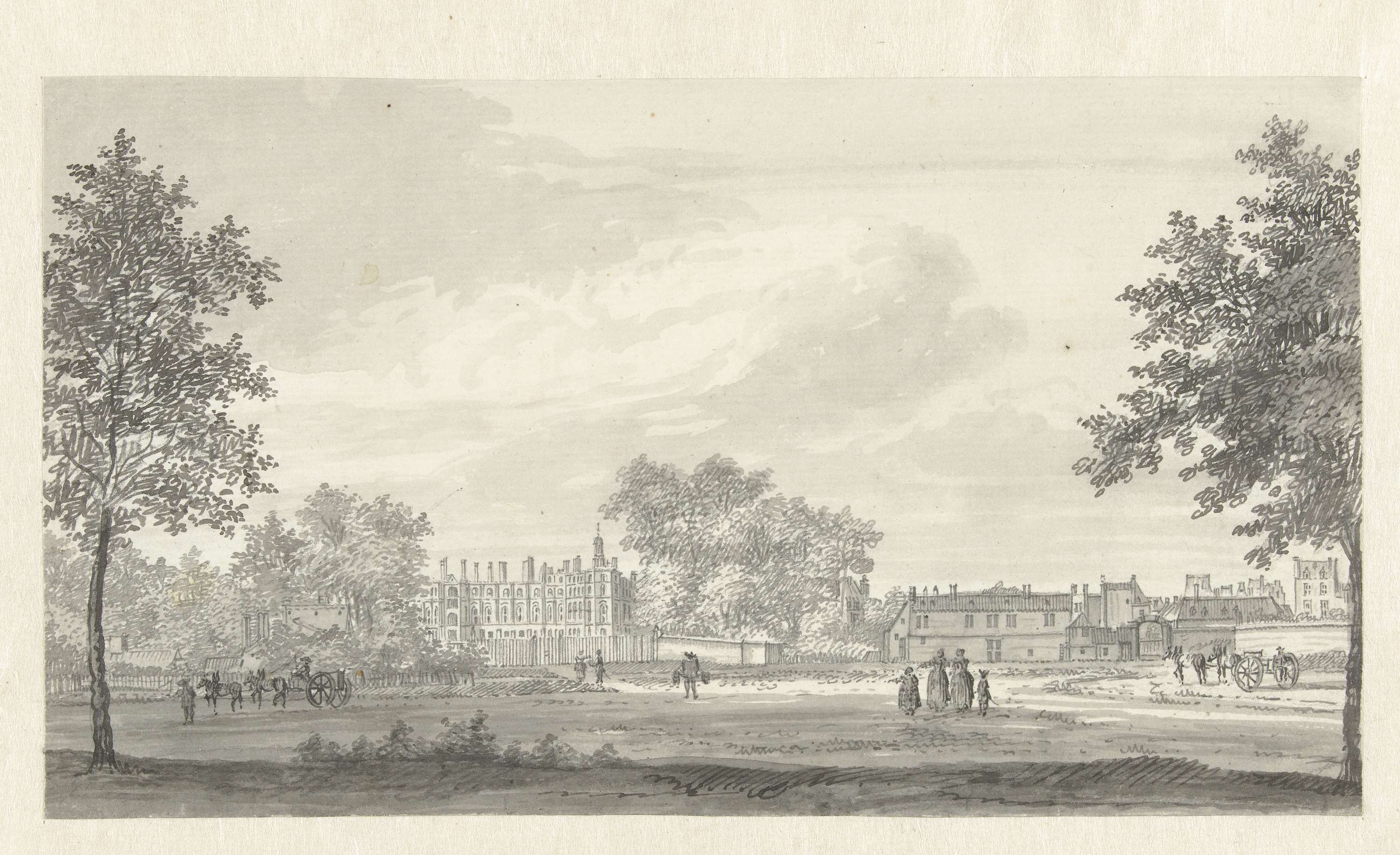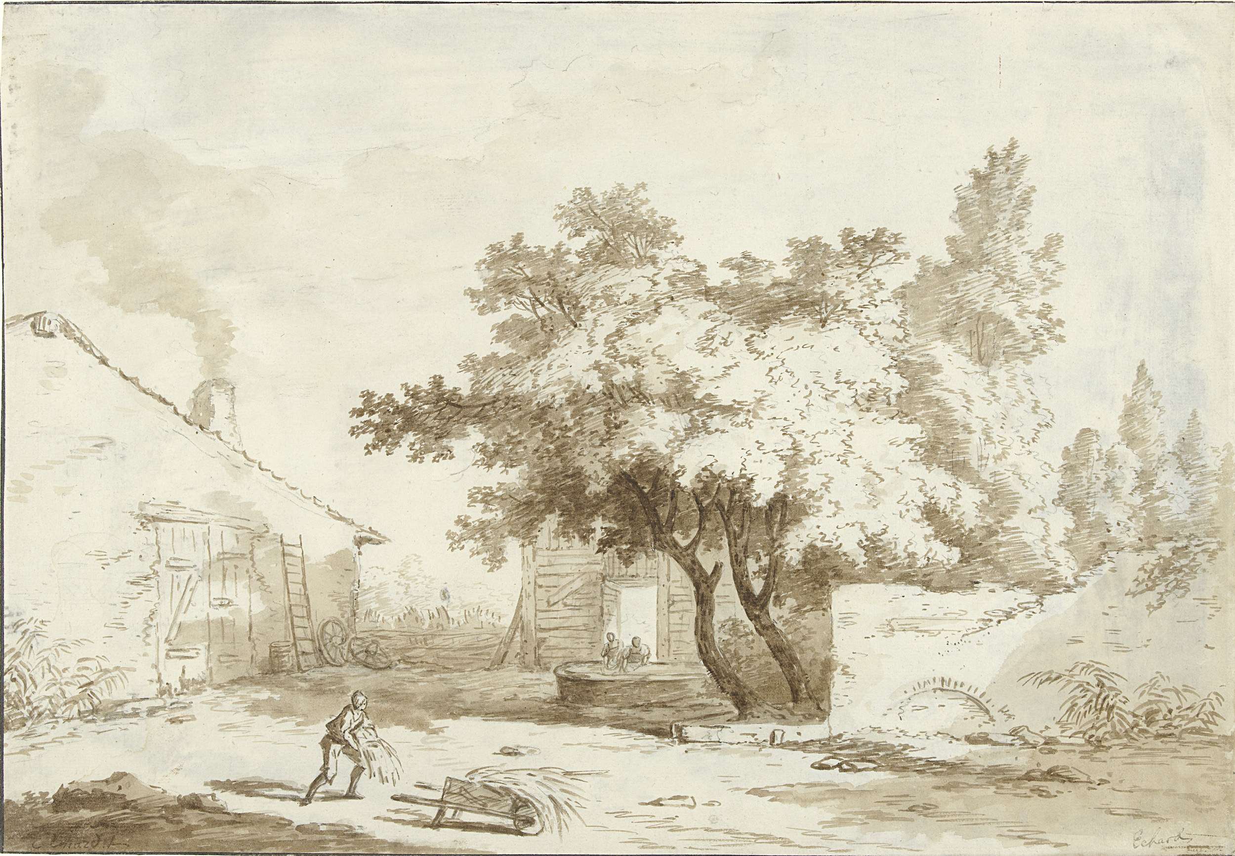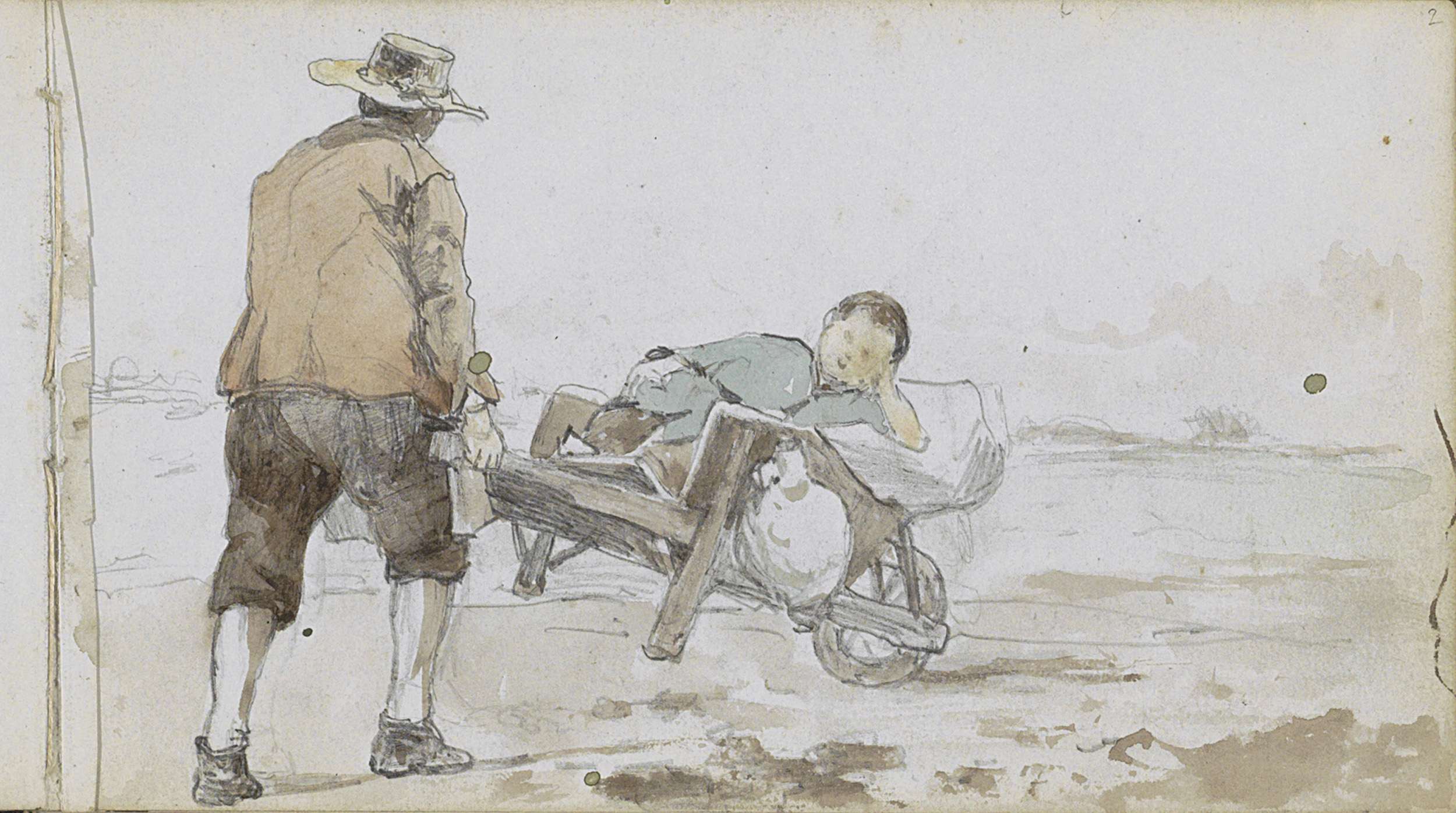 Landschap met een man die een jongen op een handkar ...