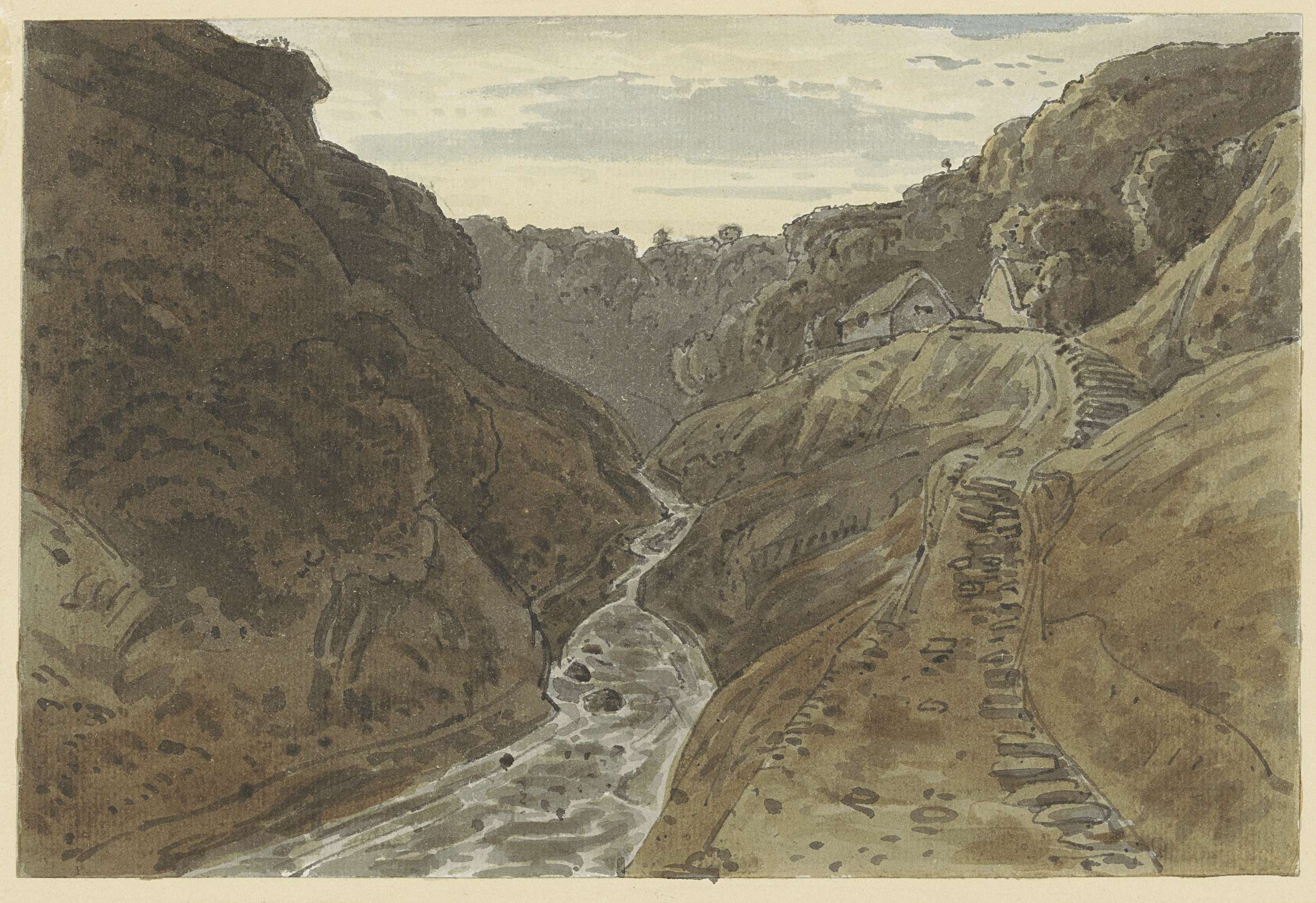 Rivierdal en bergweg leidend tot twee huizen