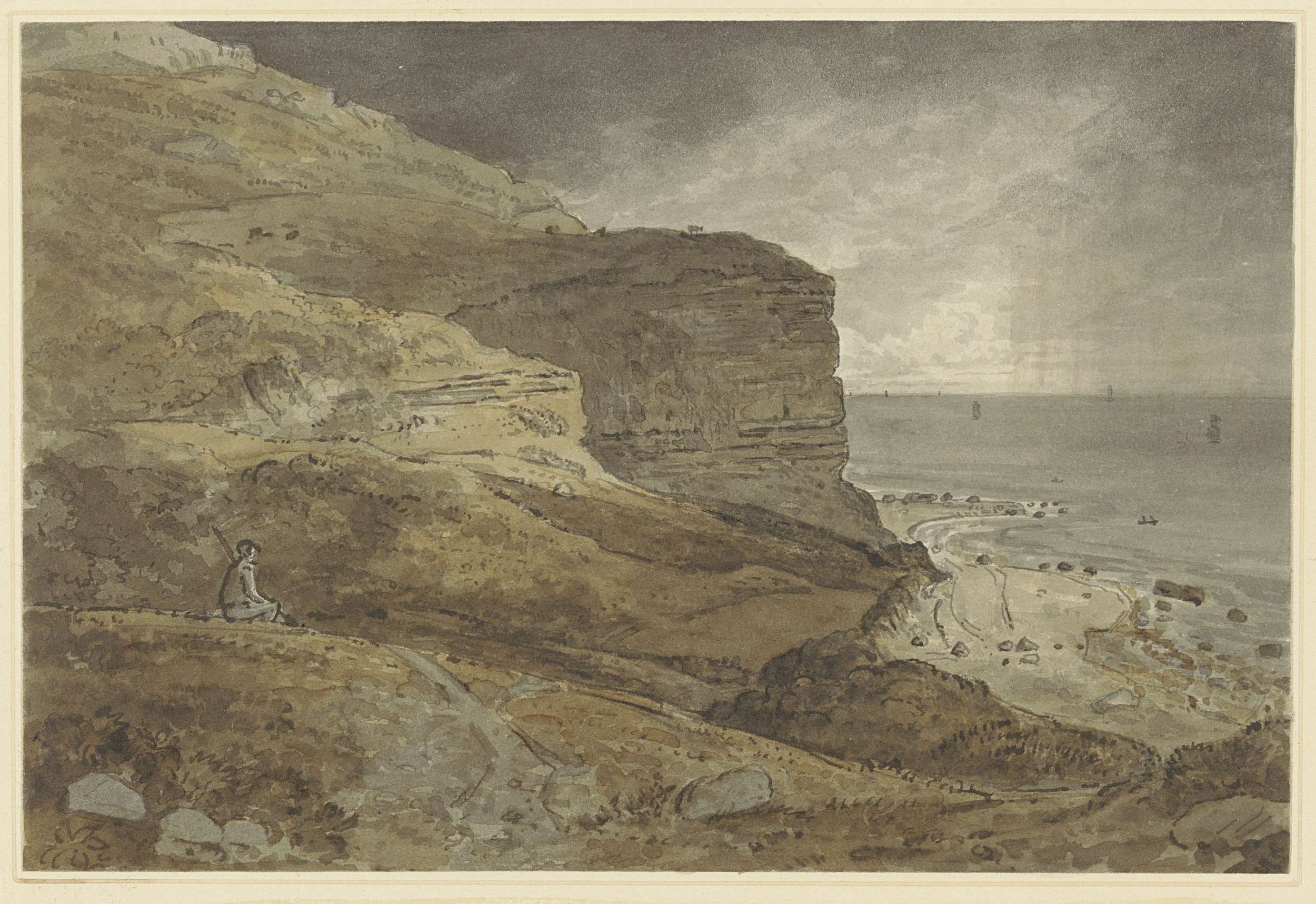 Rotsige zeekust met rustende man