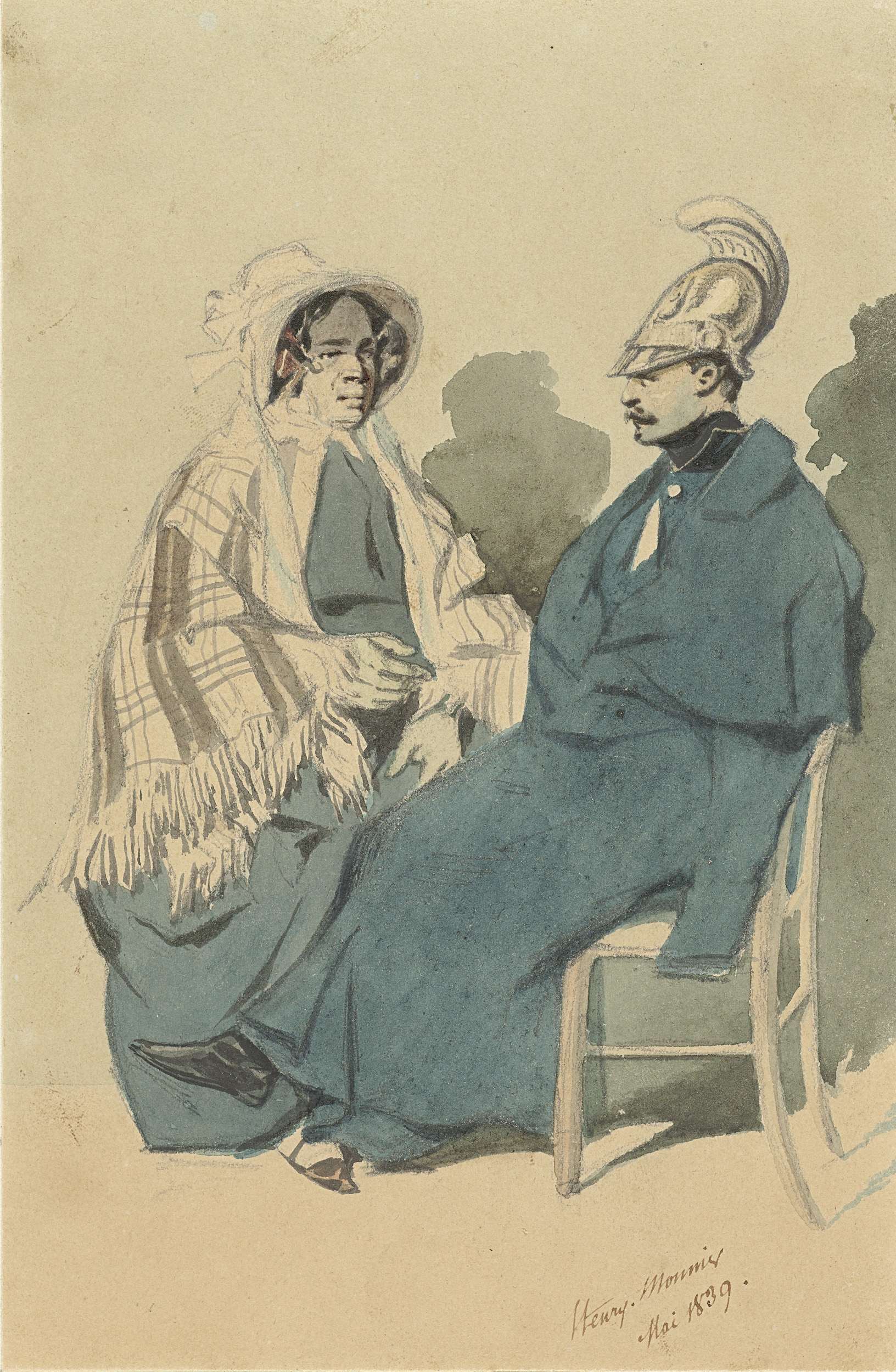 Kurassier met helm en blauwe mantel, zittend naast e...
