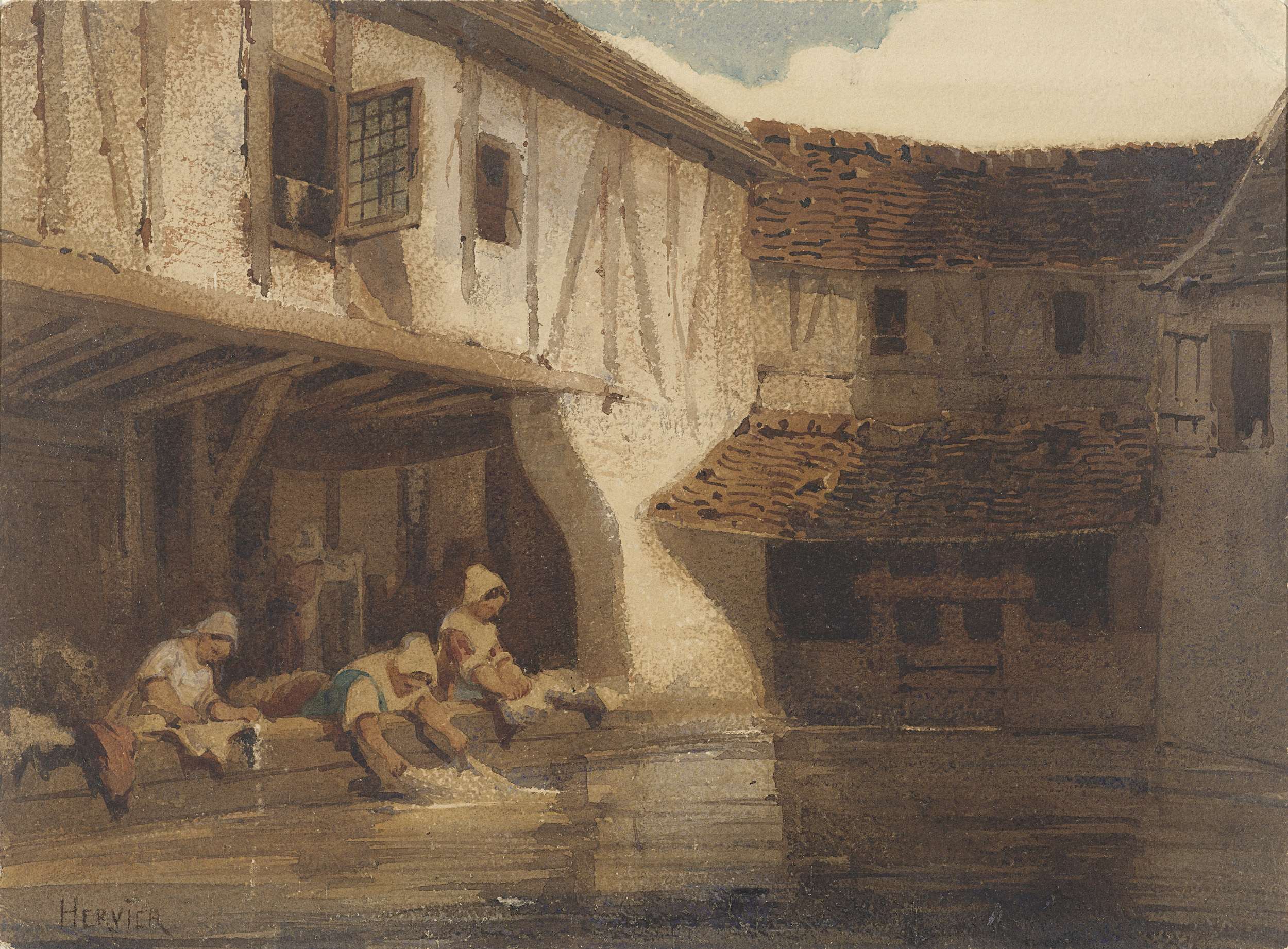 Wassende vrouwen in een open hal van een huizencompl...