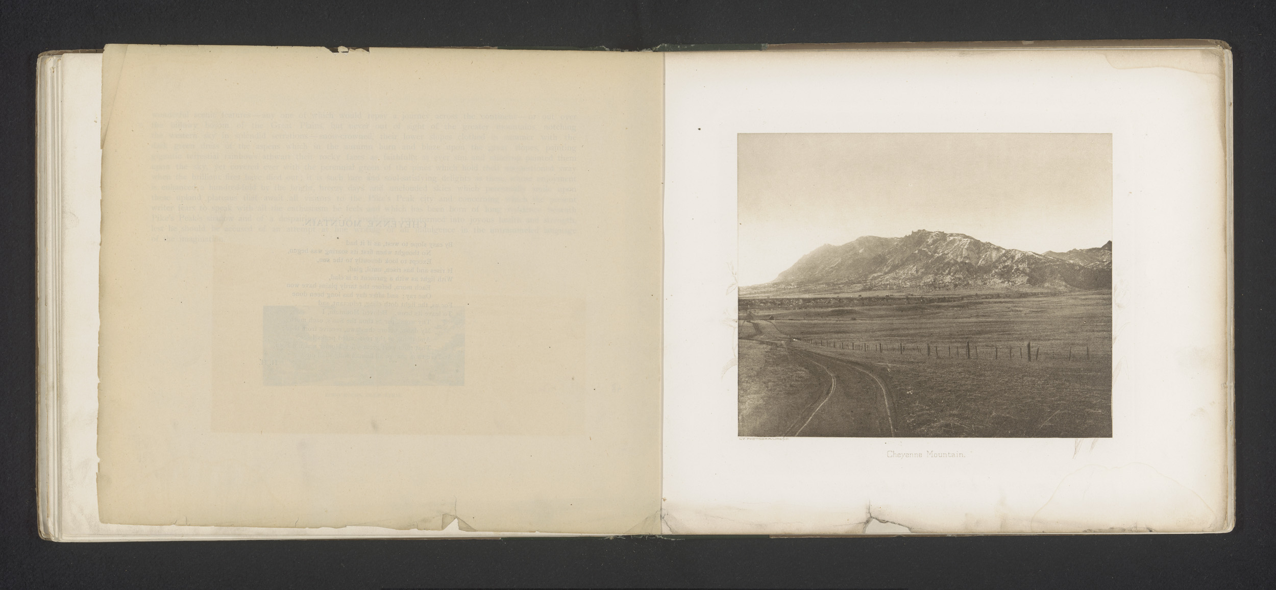 Gezicht op een landschap met Pikes Peak en een spoorweg