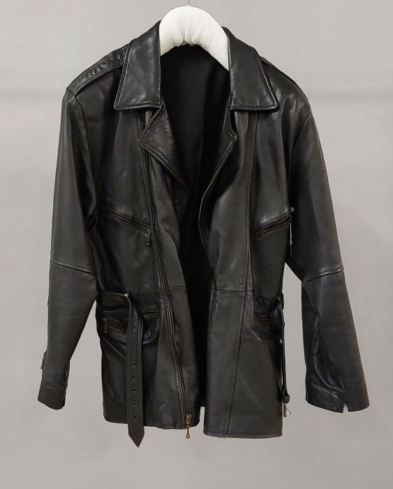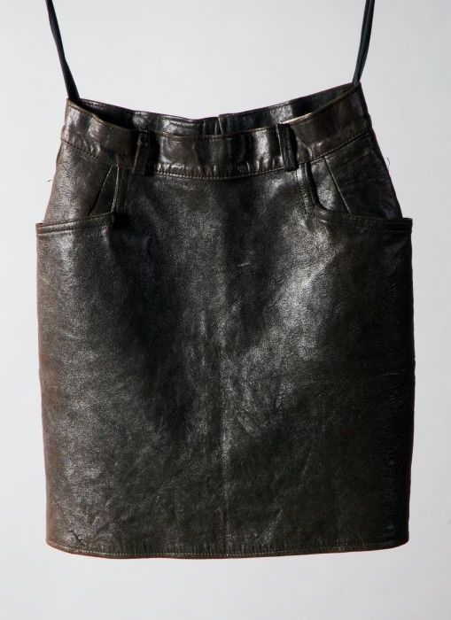 Korte rok van soepel zwart leer, twee steekzakken op...