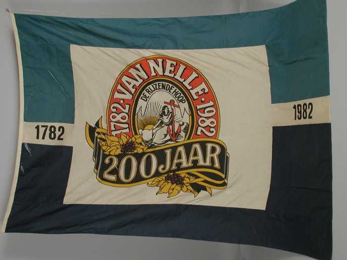 Vlag in donkergroen, wit en donkerblauw met op het w...