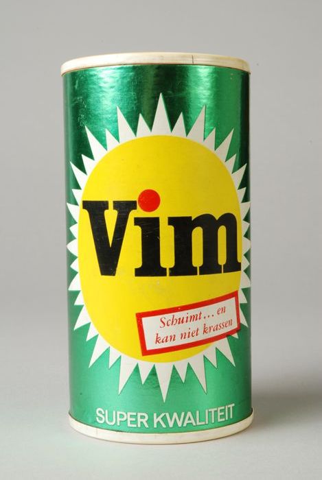 Hoge ronde bus, "Vim", reinigingsmiddel, groen en geel