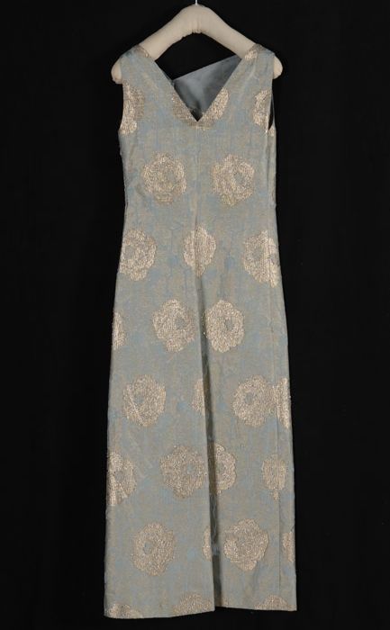 Enkellange rechte mouwloze avondjapon van lichtblauw...